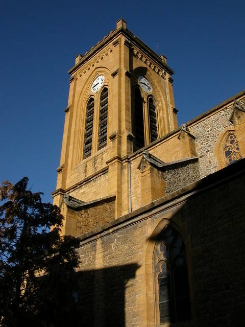 L'abside et la nef remontent au XVe siècle, le clocher date du XIXe siècle. Les vitraux de l'abside, posée en l'an 1500, classés M.H., sont considérés parmi les plus beaux de la région lyonnaise, par leur composition hardie, annonçant le vitrail de la Renaissance, et par leurs coloris. La nef est voûté d'ogives en pierres dorées. Des boiseries anciennes parent le chœur. Clocher original sans flèche. Les vitraux XIXe siècle dans la nef sont l'œuvre du maître verrier Lobin de Tours.