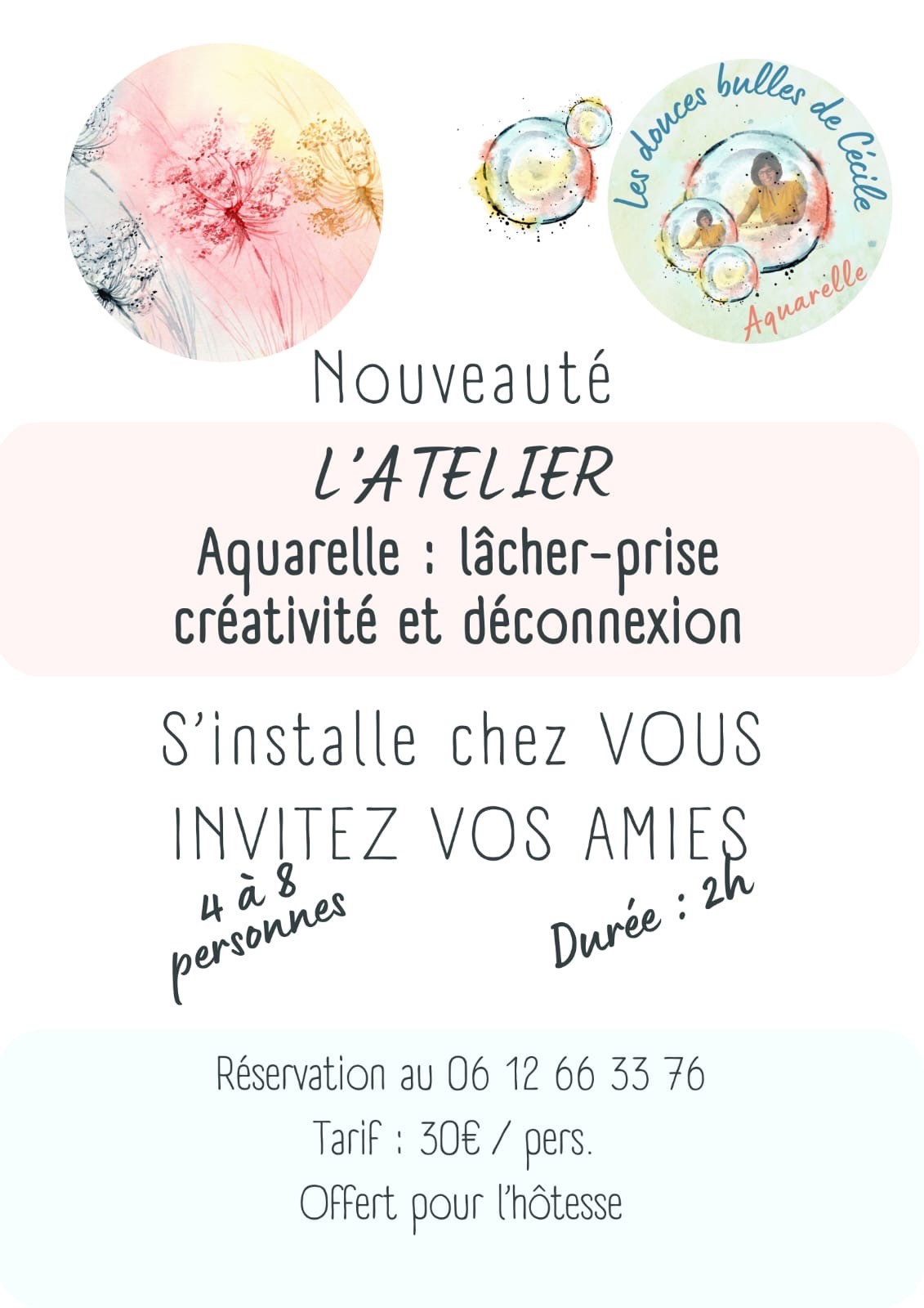 Venez expérimenter l'atelier aquarelle lâcher-prise, créativité et déconnexion en toute convivialité. Les Douces bulles de Cécile s'installe chez vous pour cette atelier. Un beau moment de partage entre amie !