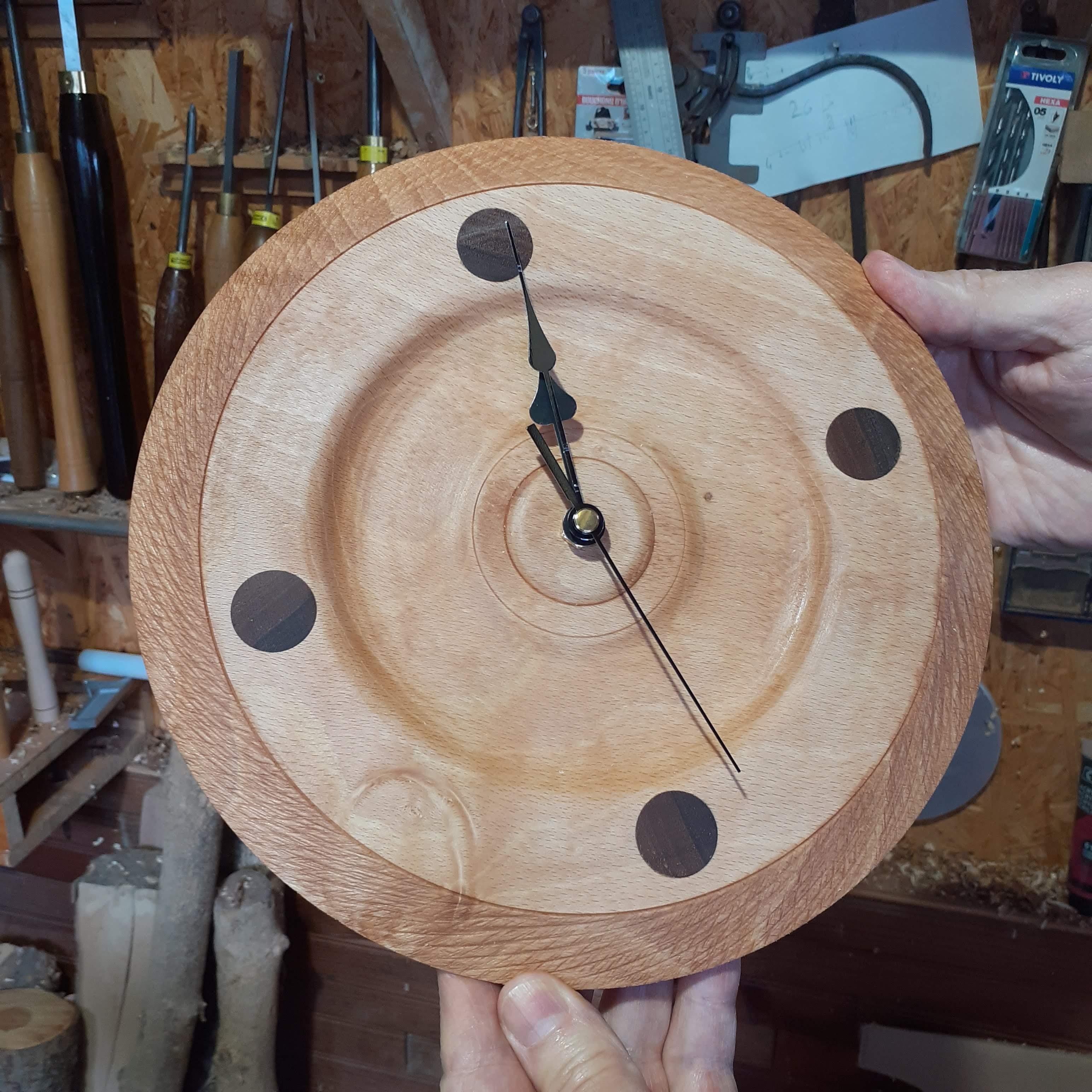 Vous travaillerez sur un un disque de bois de hêtre dans lequel vous incrusterez un bois plus sombre (noyer) qui figurent les points cardinaux pour réaliser une horloge murale. Les étapes successives du travail sont le débit du bois, la mise au rond, le profilage, la préparation d'une prise de mandrin, le creusage, le texturage, le ponçage, la finition et le montage du mécanisme.