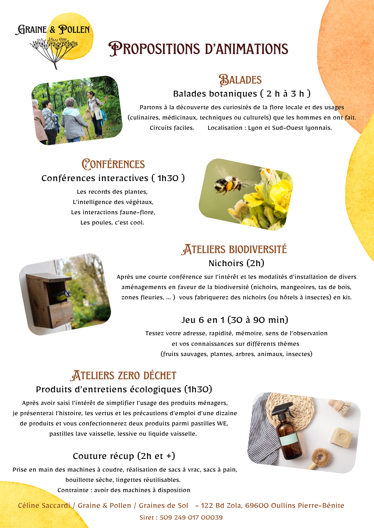 Les balades sont organisées soit à partir de la flore d'un lieu donné, soit autour d'un thème (les arbres, les plantes sauvages comestibles ou toxiques, les interactions entre plantes et animaux...).