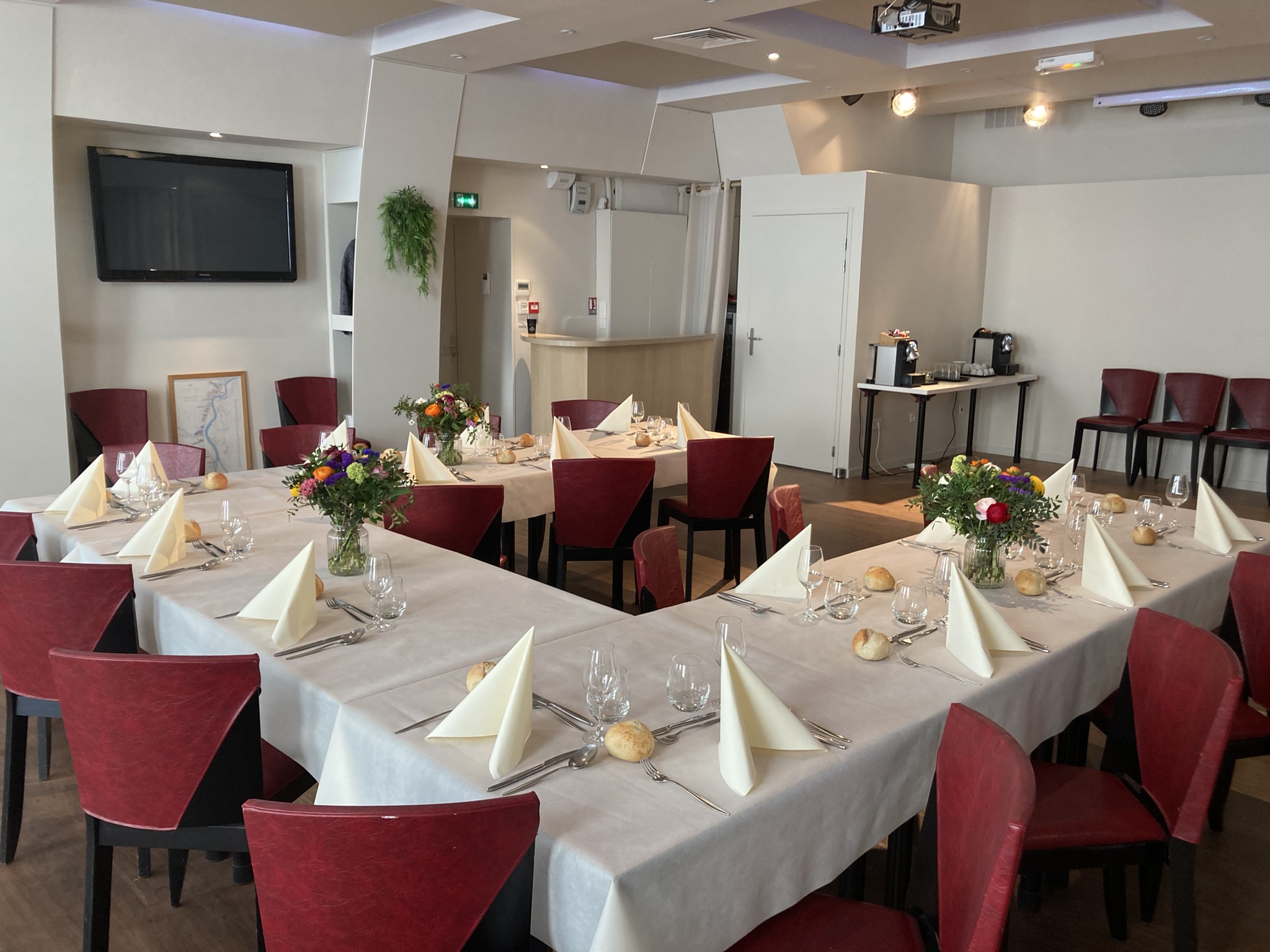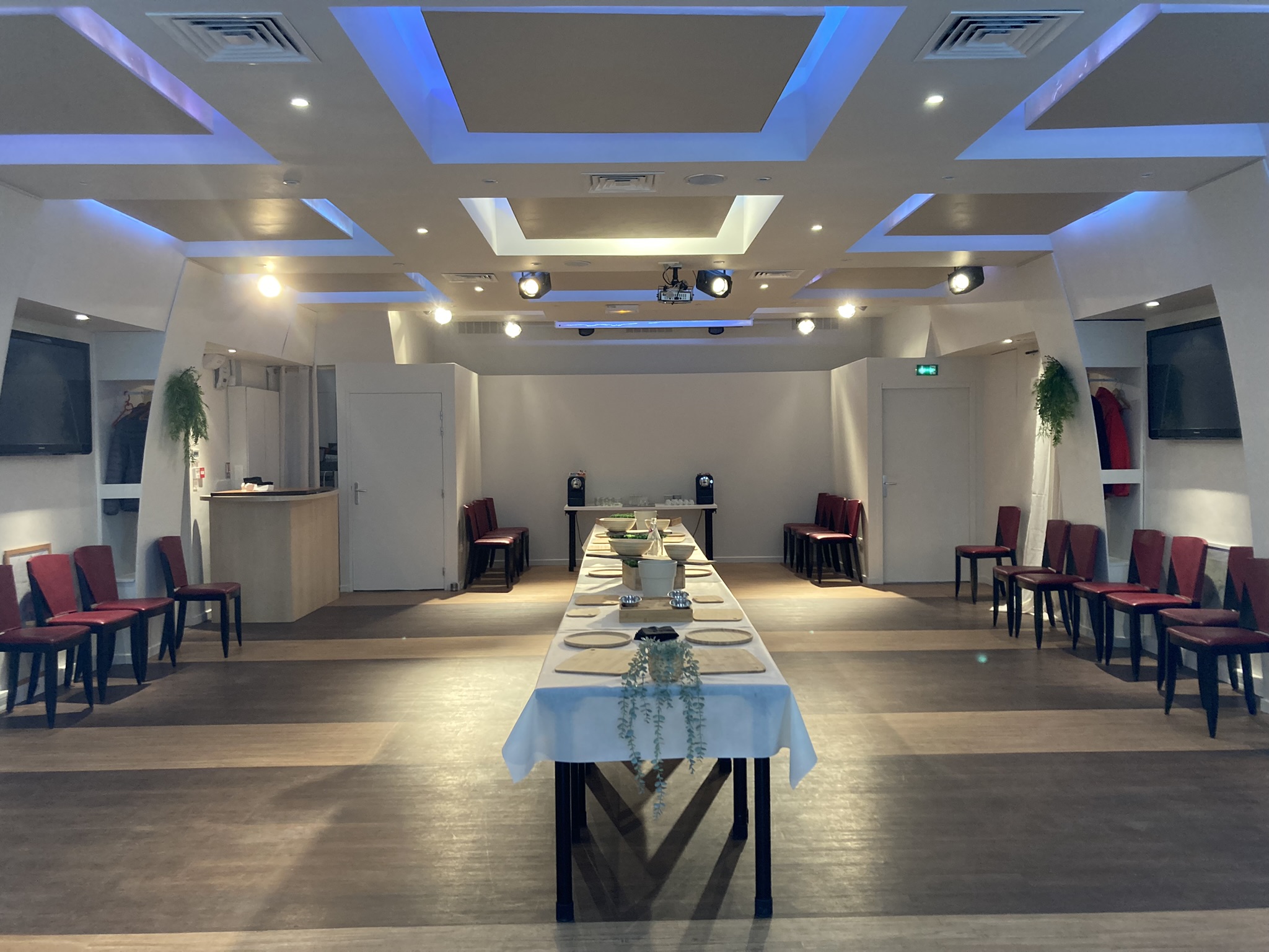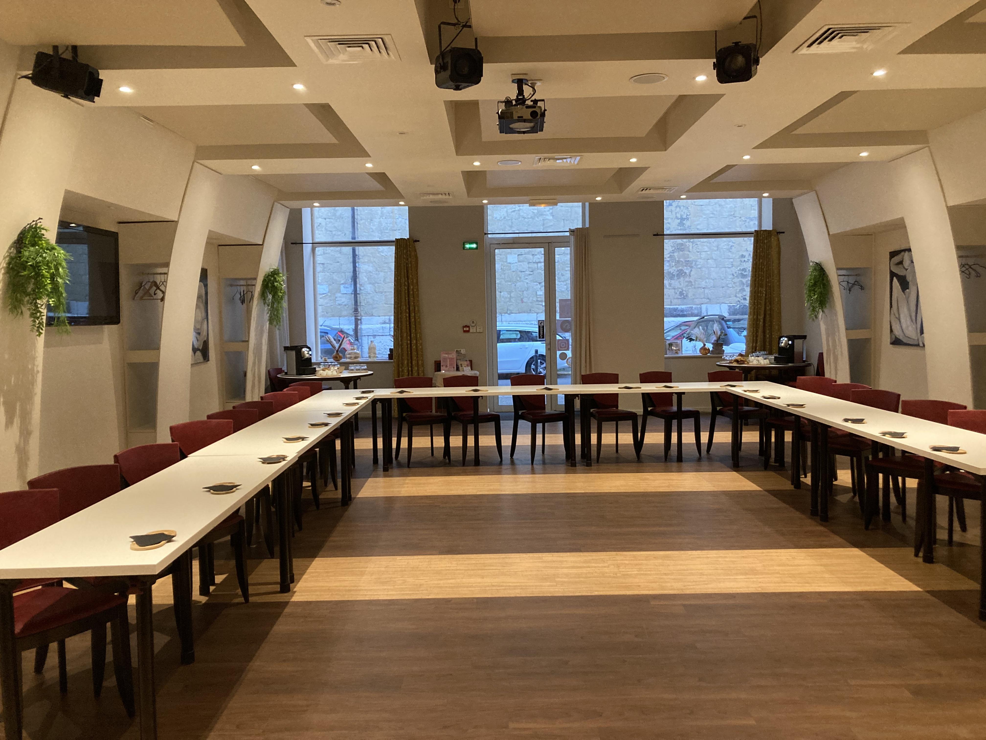Une salle de réunion équipée de tout ce dont vous aurez besoin pour un moment de productivité : vidéo projecteur, écran TV, système son, connexion WIFI, micros.