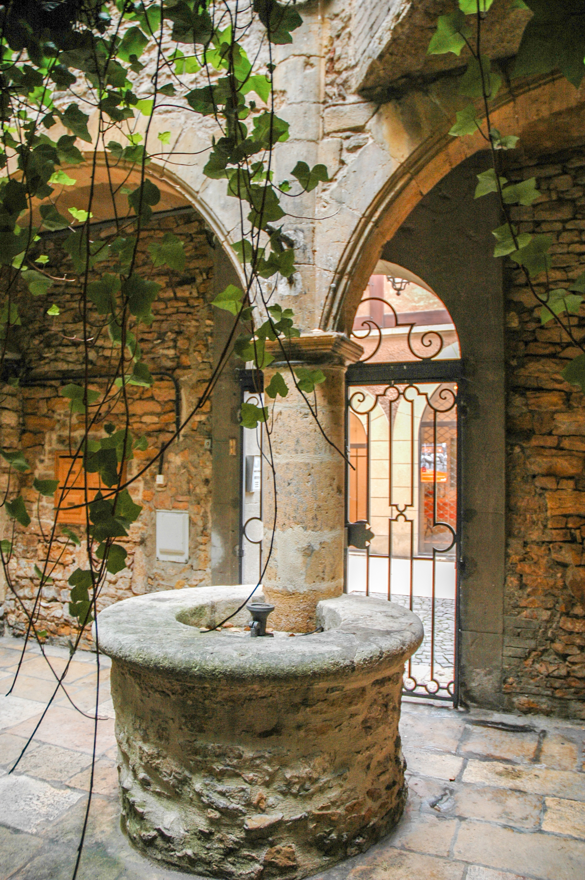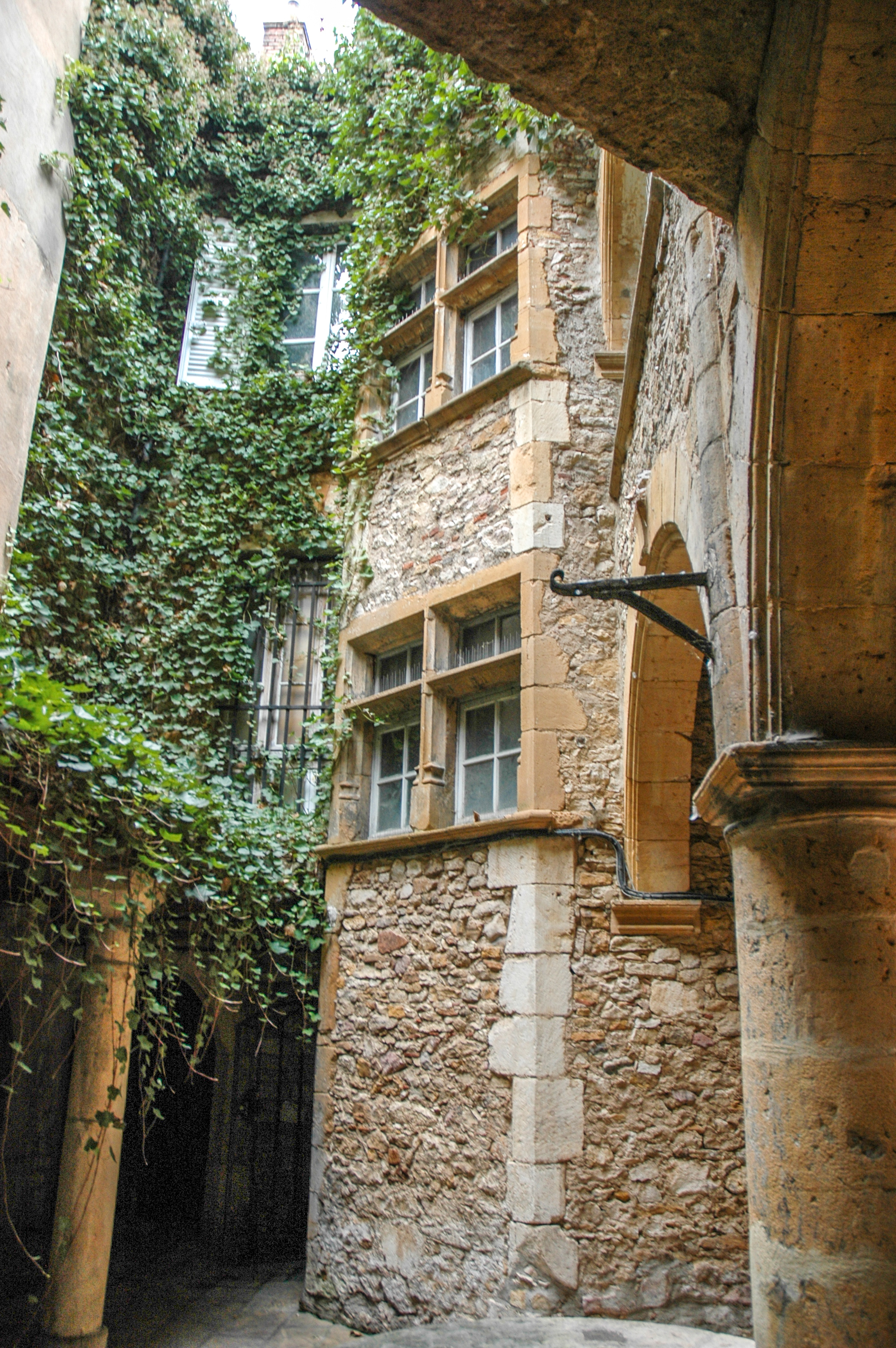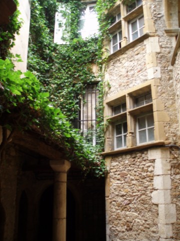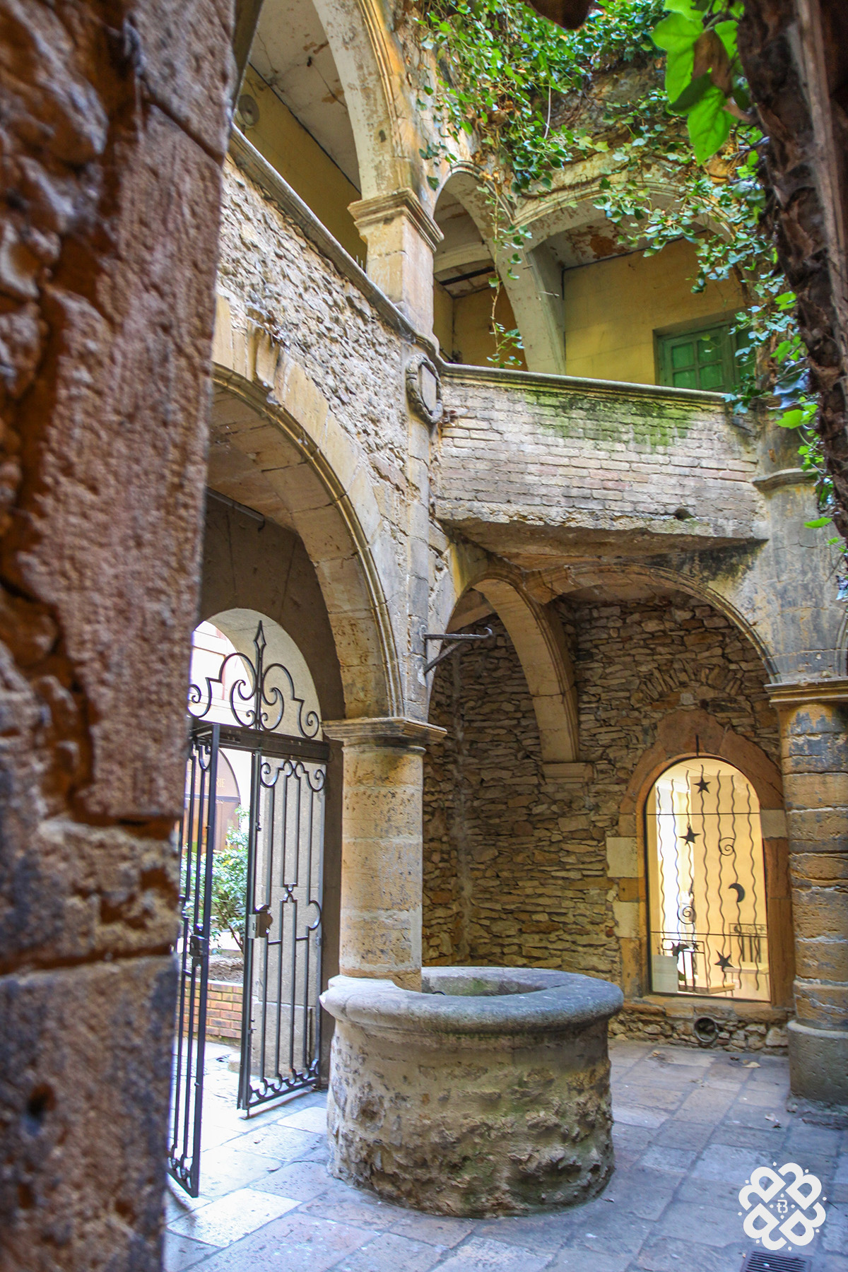 La cour montre l’aspect habituel des vieilles cours de Villefranche avec son escalier à colimaçon, sa galerie à deux étages et son puits. Les arcades du rez-de-chaussée sont en plein cintre, typiquement classiques. Il existe du côté Ouest un retour d’équerre tout à fait unique dans notre ville.