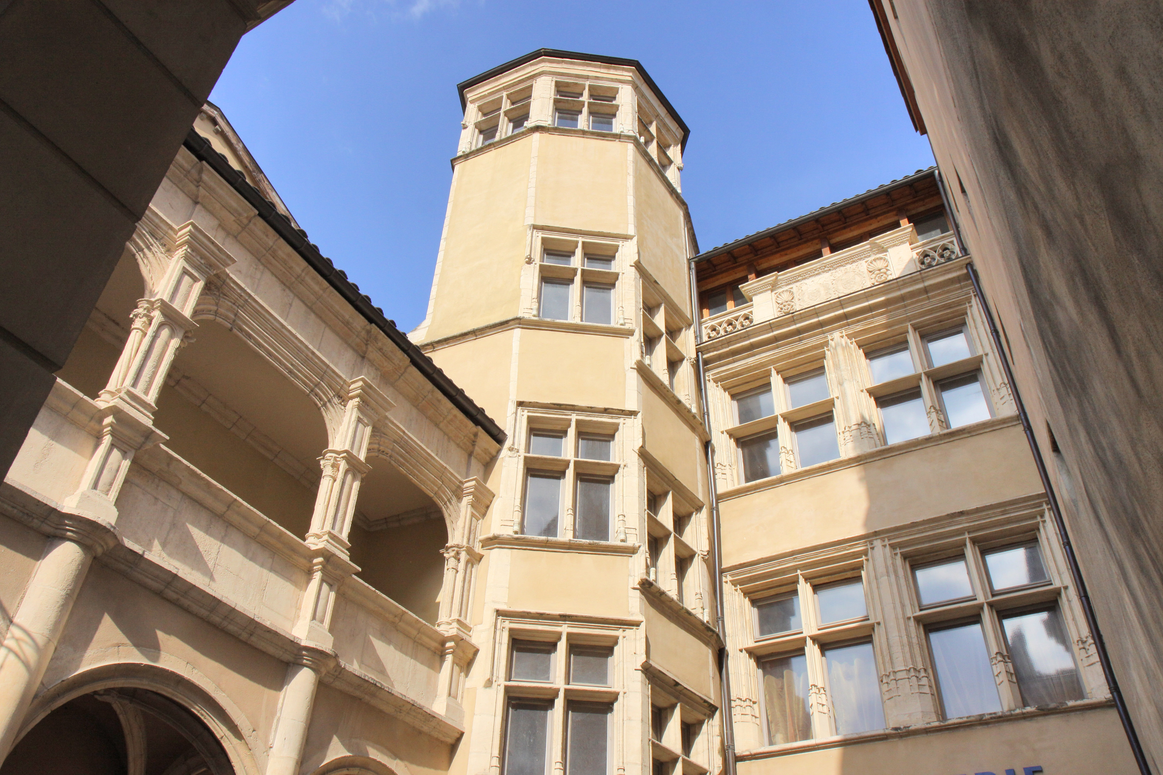 Un bel escalier à vis de forme octogonale mène à un belvédère qui domine la cité comme dans de nombreuses autres maisons. Un passage voûté conduit à une seconde cour spacieuse ornée de médaillons. Elle s’ouvre sur une porte cochère qui donne sur la « rue de derrière ».