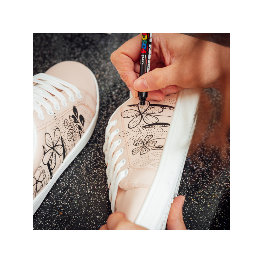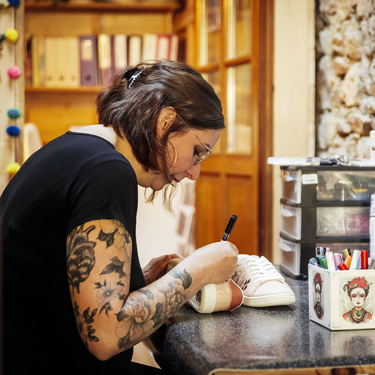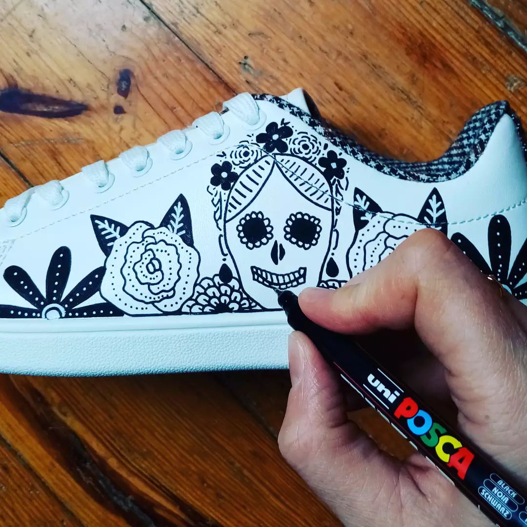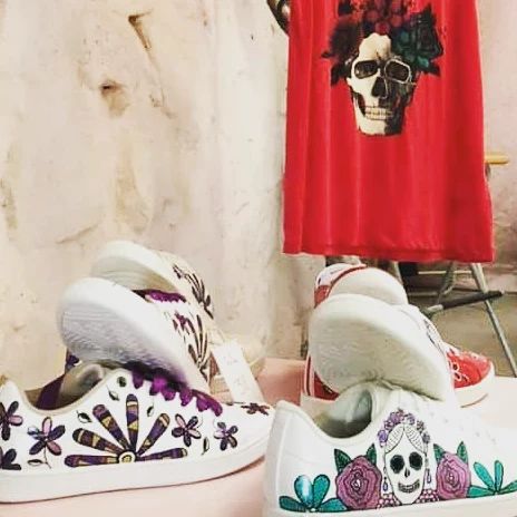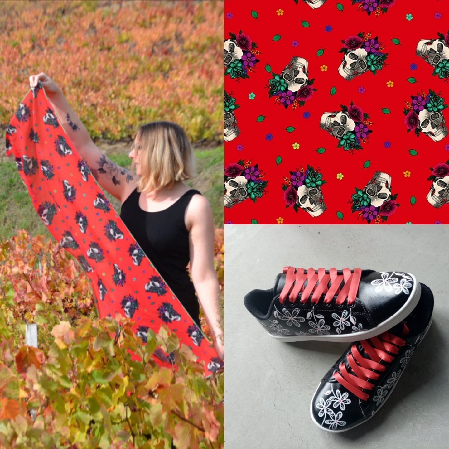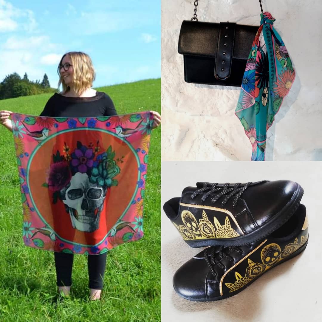Depuis 2 ans, elle customise des baskets. Motifs floraux ou tête de mort sont peints directement sur les baskets. Elle propose aussi une collection de foulards pour femme et homme.