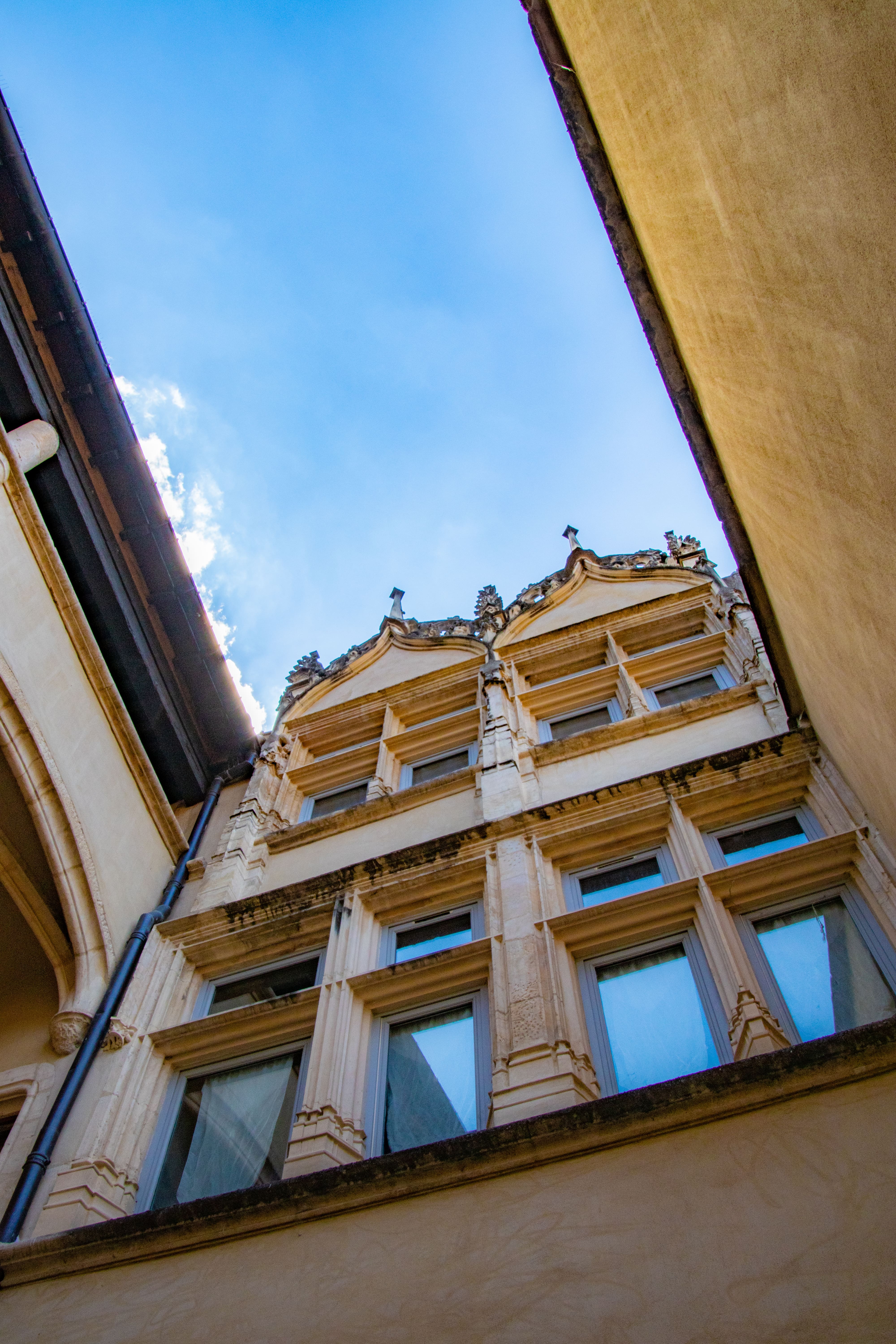 La façade sur la cour, datée du 15e siècle, se compose de trois niveaux de fenêtres à meneaux encadrées par de profondes moulures se croisant dans les angles. L’ensemble est couronné par une exceptionnelle décoration au vocabulaire médiéval : arcs en accolade avec des choux rampants.