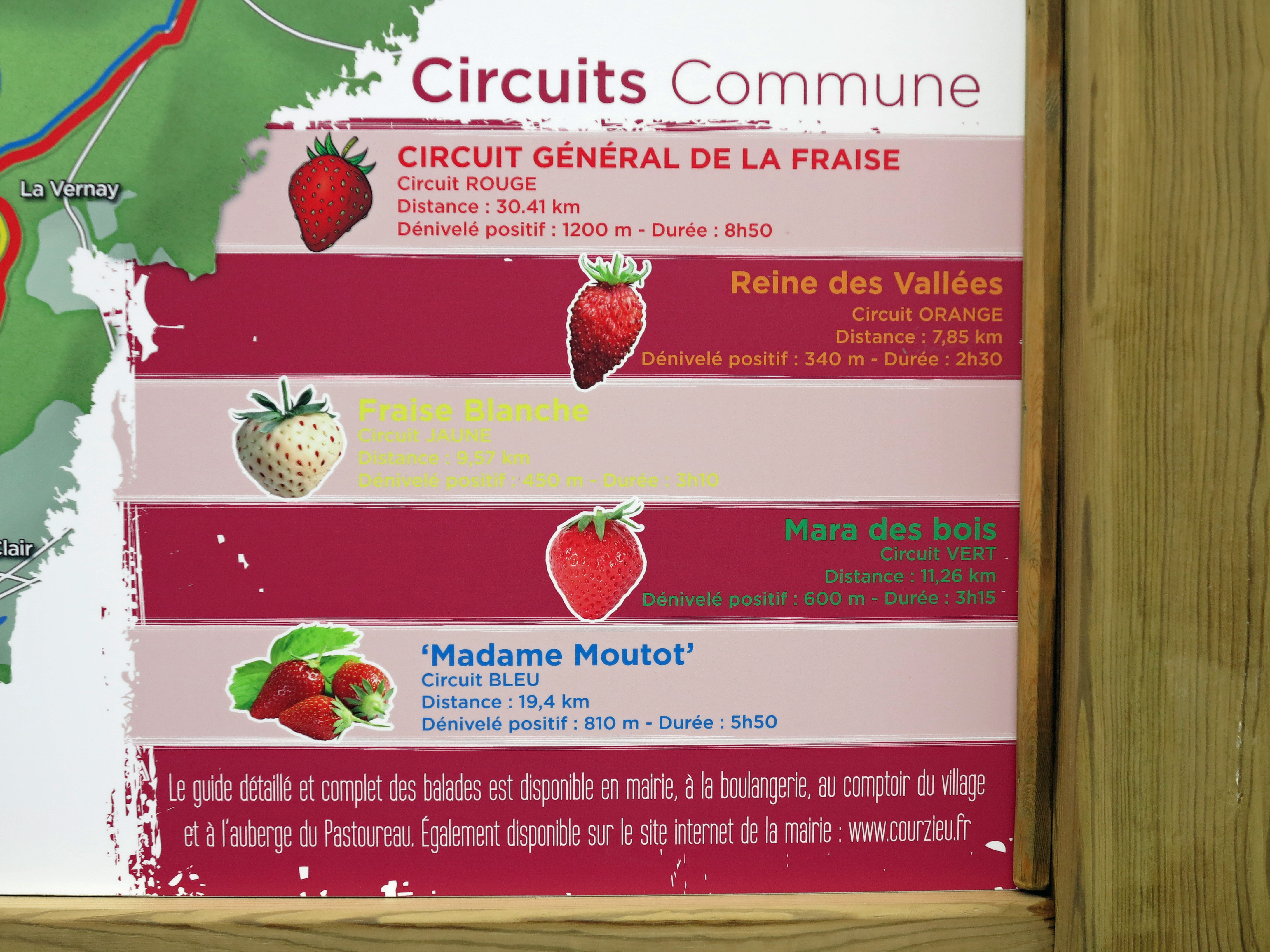 Balades du patrimoine au centre Bourg : - Ciflorette (violet) : distance 1.22 km dénivelé positif 30 m. - Gariguette (fuschia) : distance 1.97 km dénivelé positif 60 m. Randonnées dans la nature : - Circuit général de la fraise (rouge) : distance 30.41, km dénivelé positif 1200 m, durée 8h50. - Reine des Vallées (orange) : distance 7.85 km, dénivelé positif 340 m, durée 2h30. - Fraise blanche (jaune) : distance 9.57 km, dénivelé positif 450 m, durée 3h10. - Mara des bois (vert) : distance 11.26 km, dénivelé positif 600 m, durée 3h15. - Madame Moutot (bleu) : distance 19.4 km, dénivelé positif 810 m, durée 5h50.
