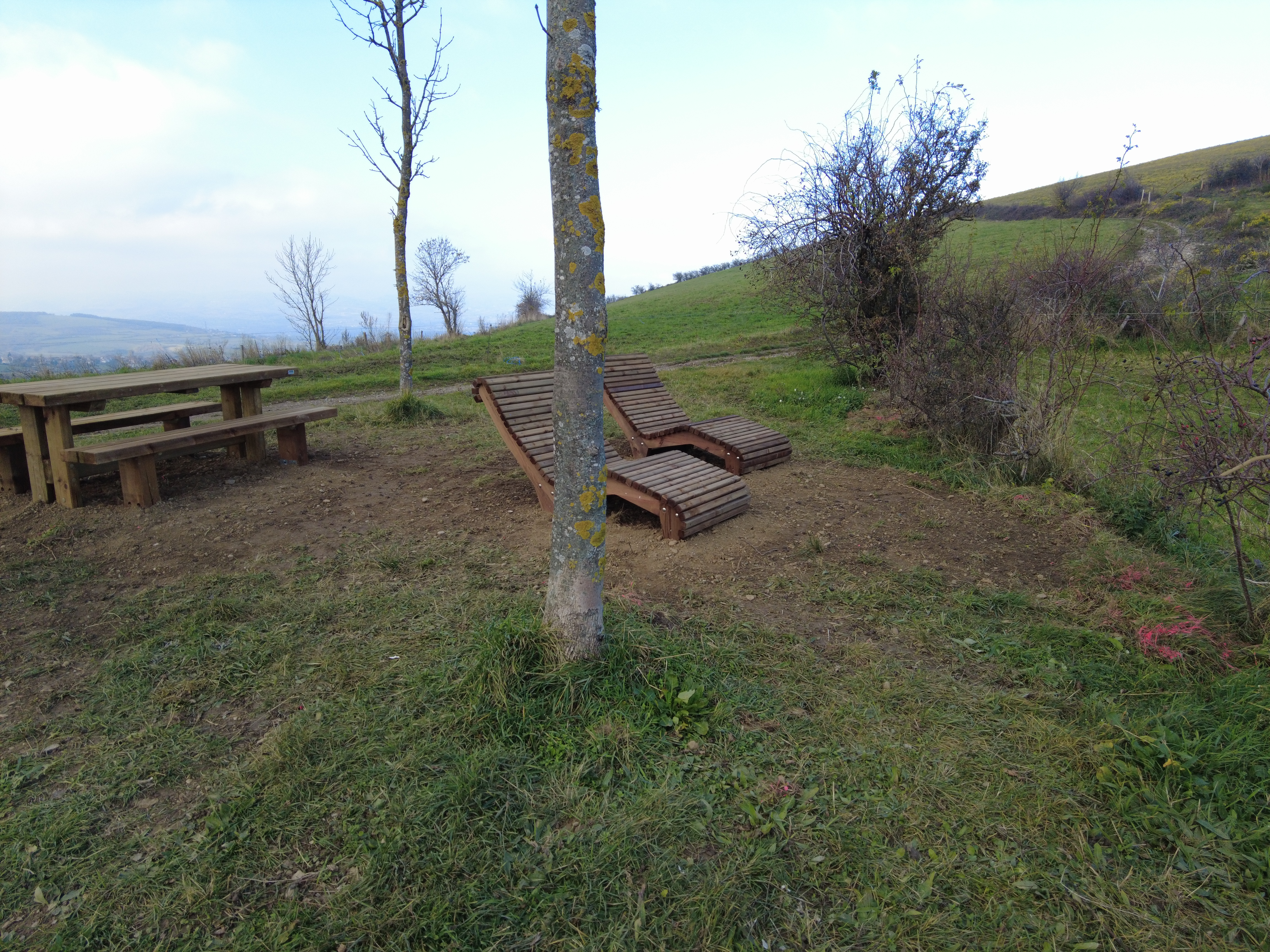 2 emplacements gratuits aménagés avec table de pique-nique et transats fixe en matériaux durables.