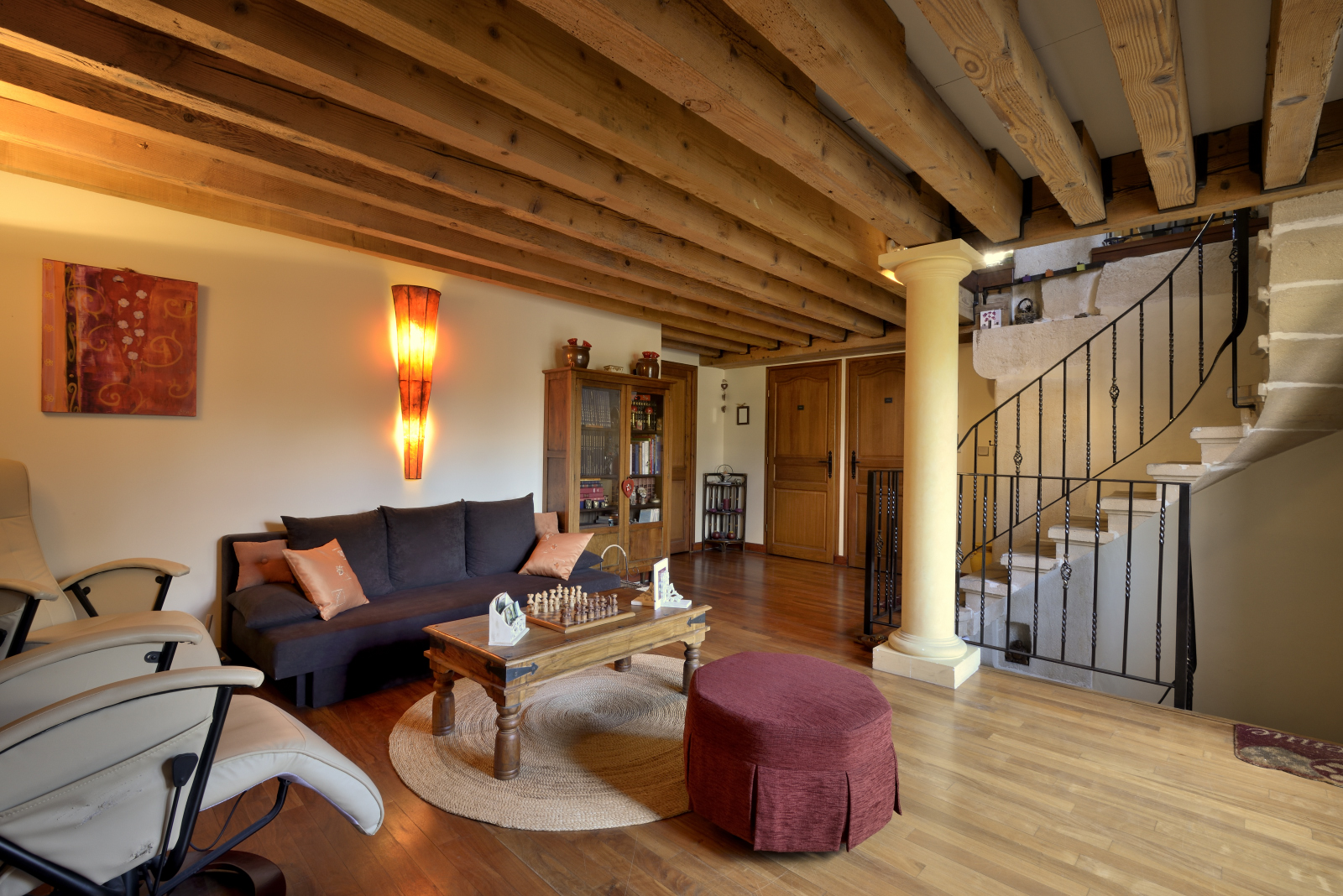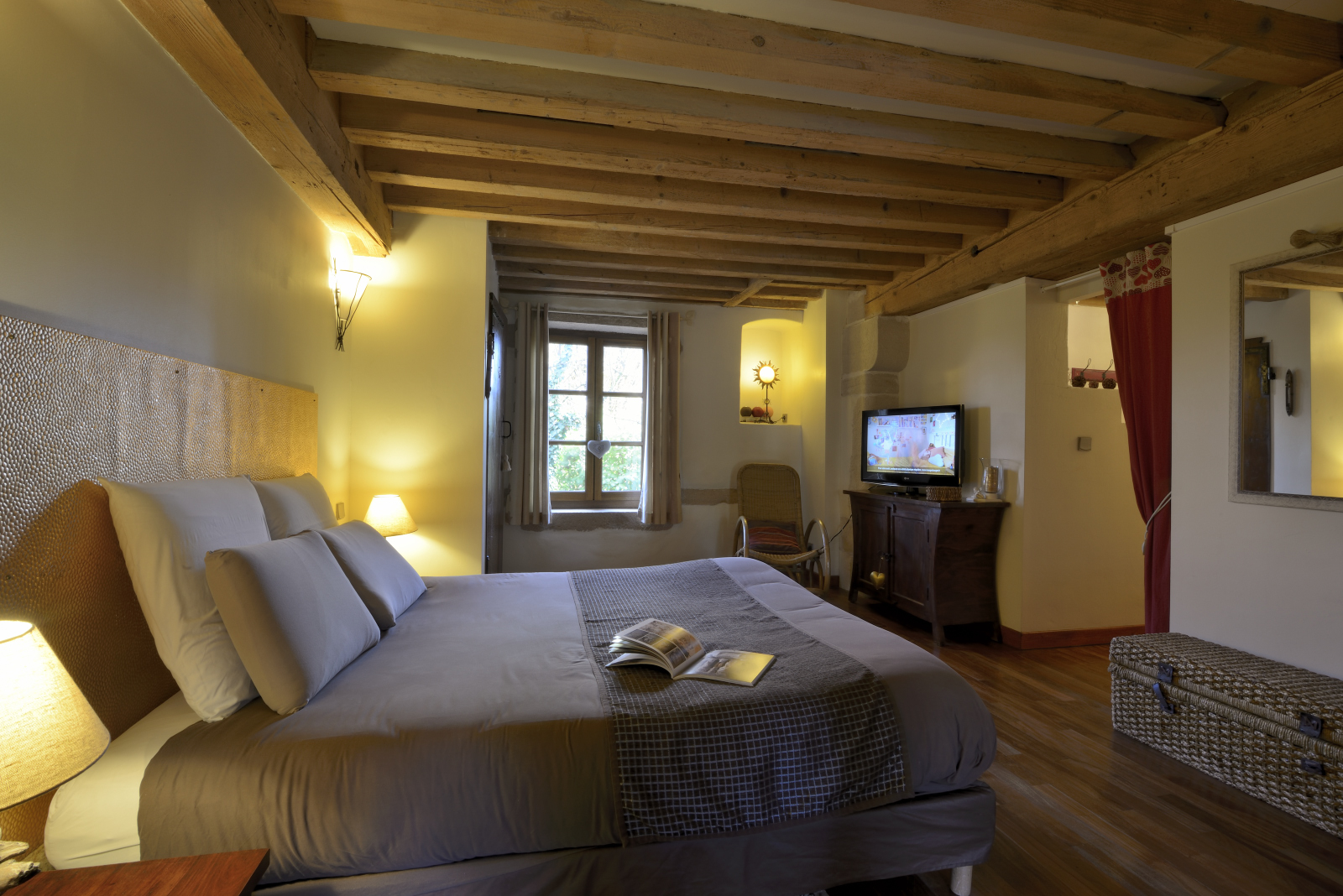 La chambre "l'Aubière" toute en charme avec ses poutres et sa pierre de Bourgogne apparentes dans un ancien moulin à quelques encablures du centre ville de Villefranche et très proche de la sortie d'autoroute.