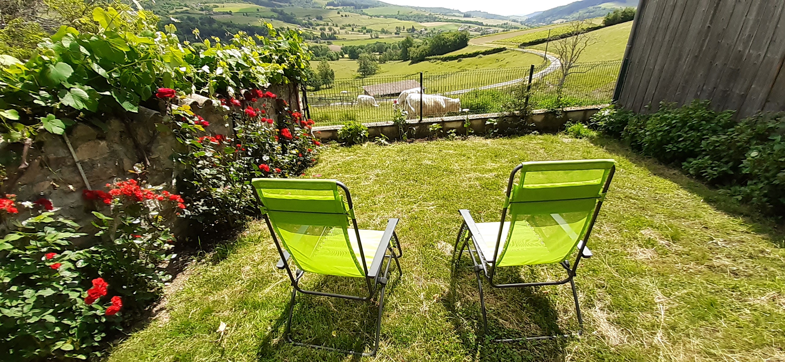 Terrasse, coin détente extérieur, vue sur la vallée de Beaujeu, jardin potager, prés des sentiers de randonnées.