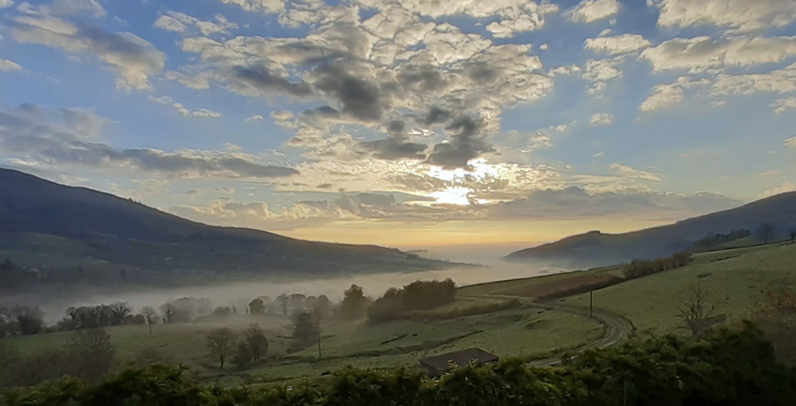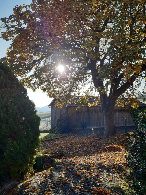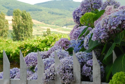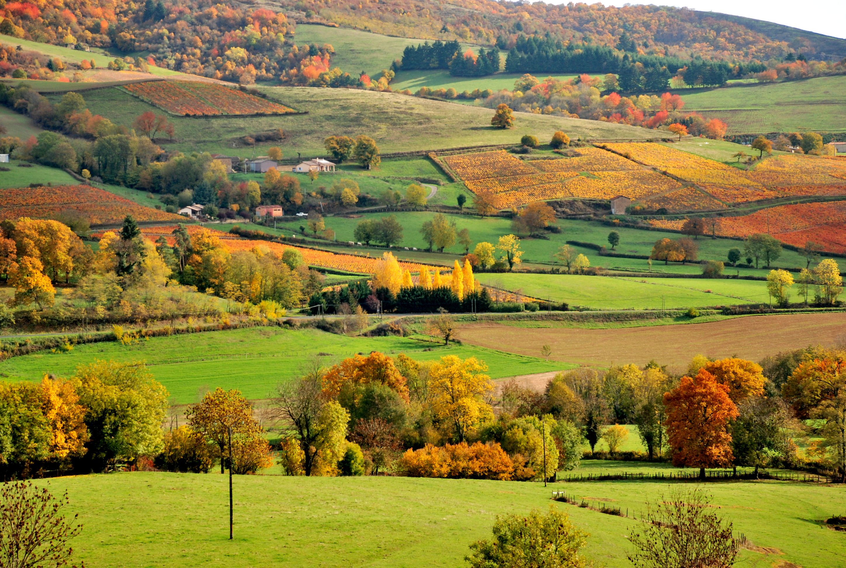 Terrasse, coin détente extérieur, vue sur la vallée de Beaujeu, jardin potager, prés des sentiers de randonnées.