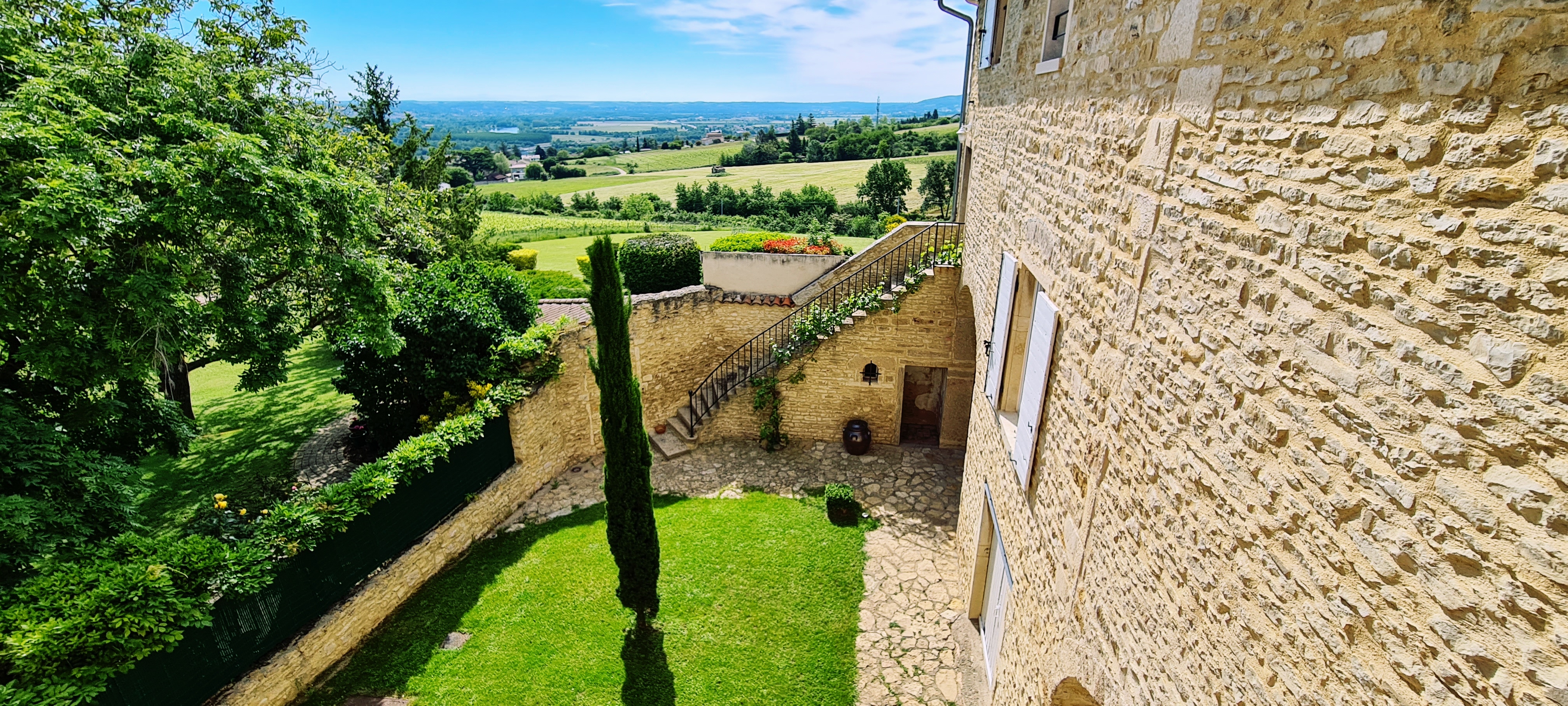 Sur les hauteurs d’Anse, un petit village situé au sud du Beaujolais et réputé pour ses pierres dorées, se dresse une magnifique bâtisse atypique du XVIIIe siècle offrant une vue dégagée sur les vignes, la Dombes, les courbes de la Saône et même le Mont Blanc si le temps le permet.