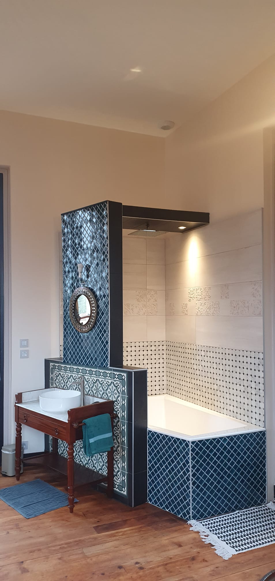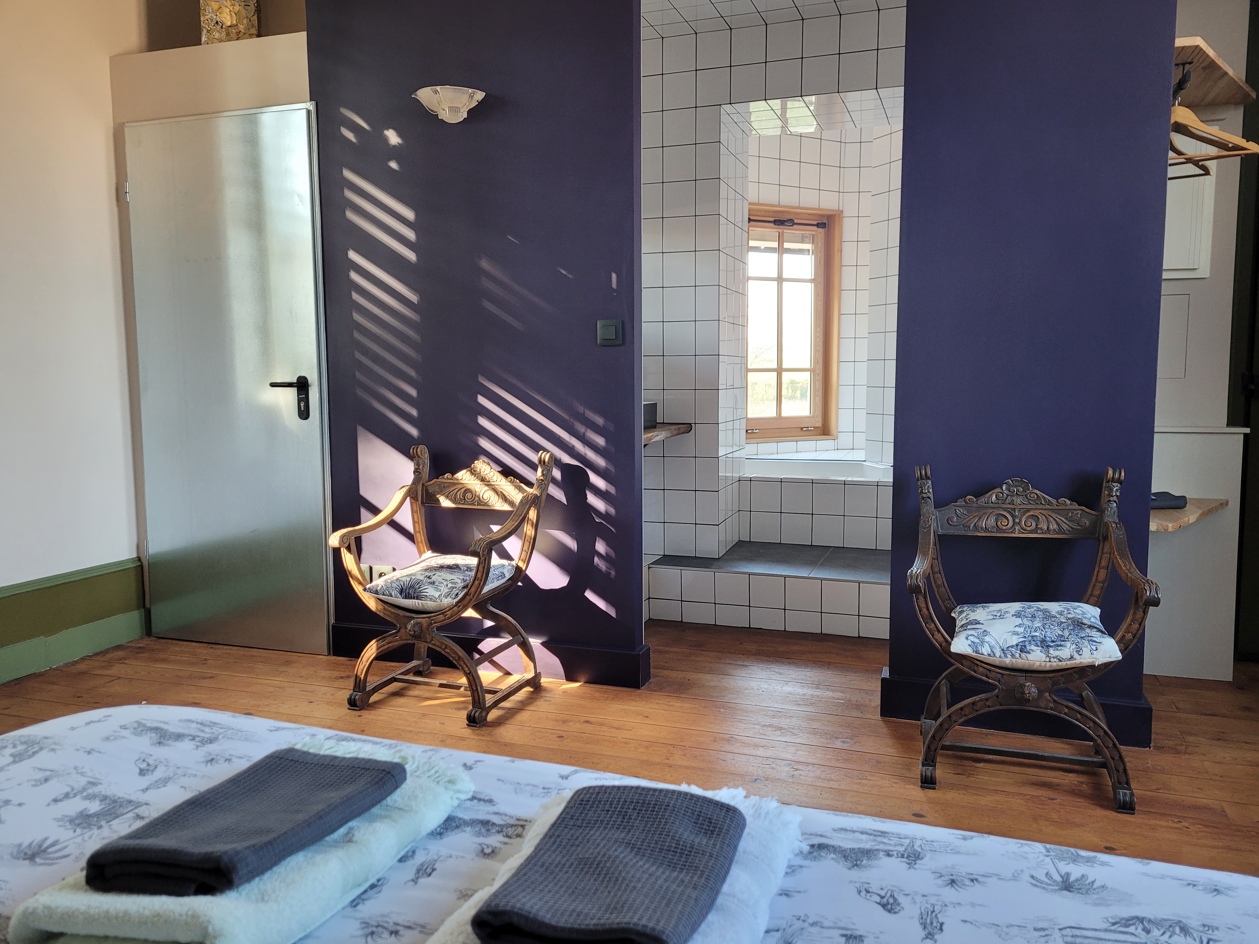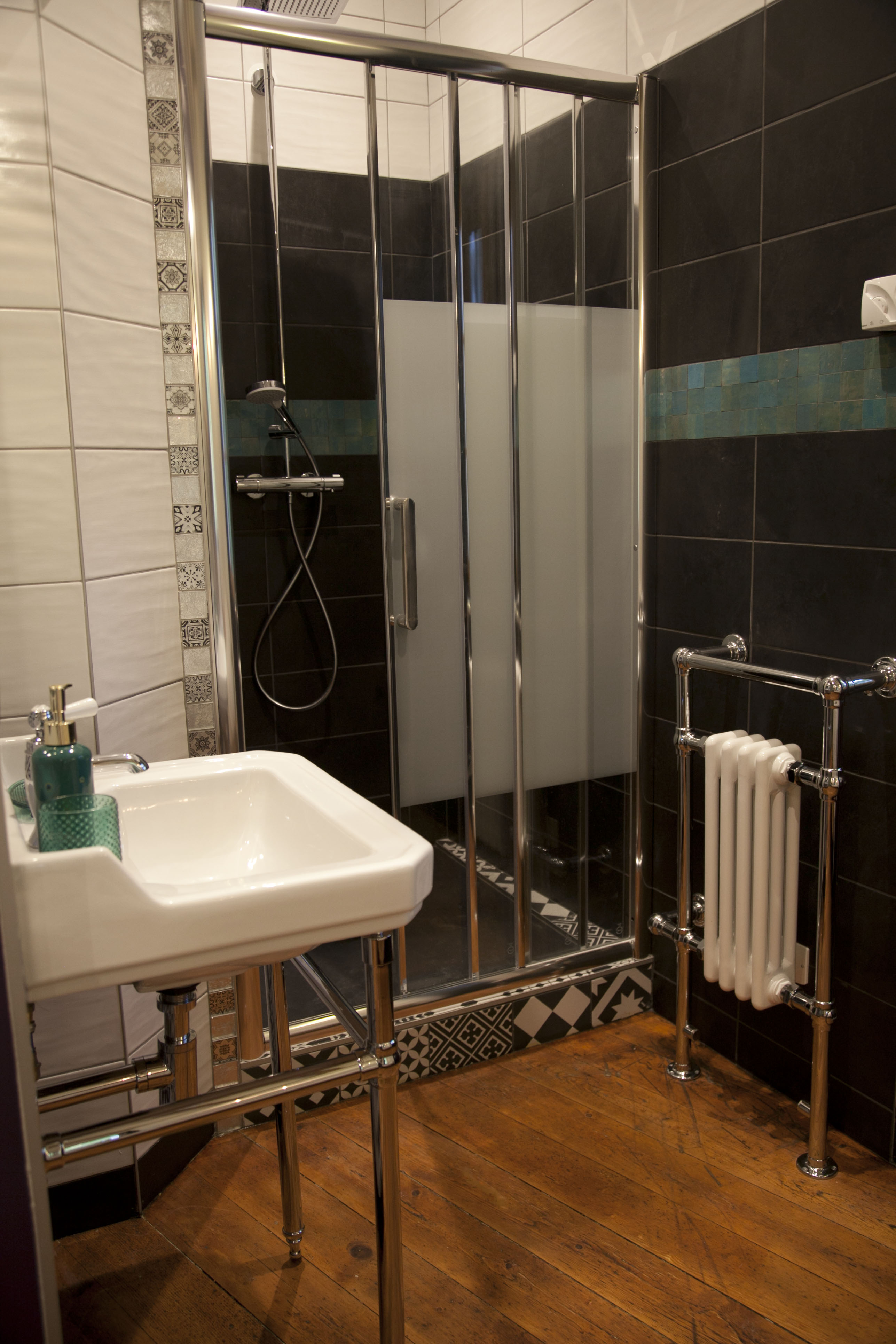 La chambre "Expérience" au 1er étage de la Tour Rose est un pari d’aménagement : la volonté de faire cohabiter l’ancien et le contemporain, autant par les objets, mobiliers et luminaires, que par une salle de bain, clin d'œil au travail de l’artiste plasticien Jean-Pierre Raynaud, revêtue de carreaux blancs 15x15 avec joints noirs.