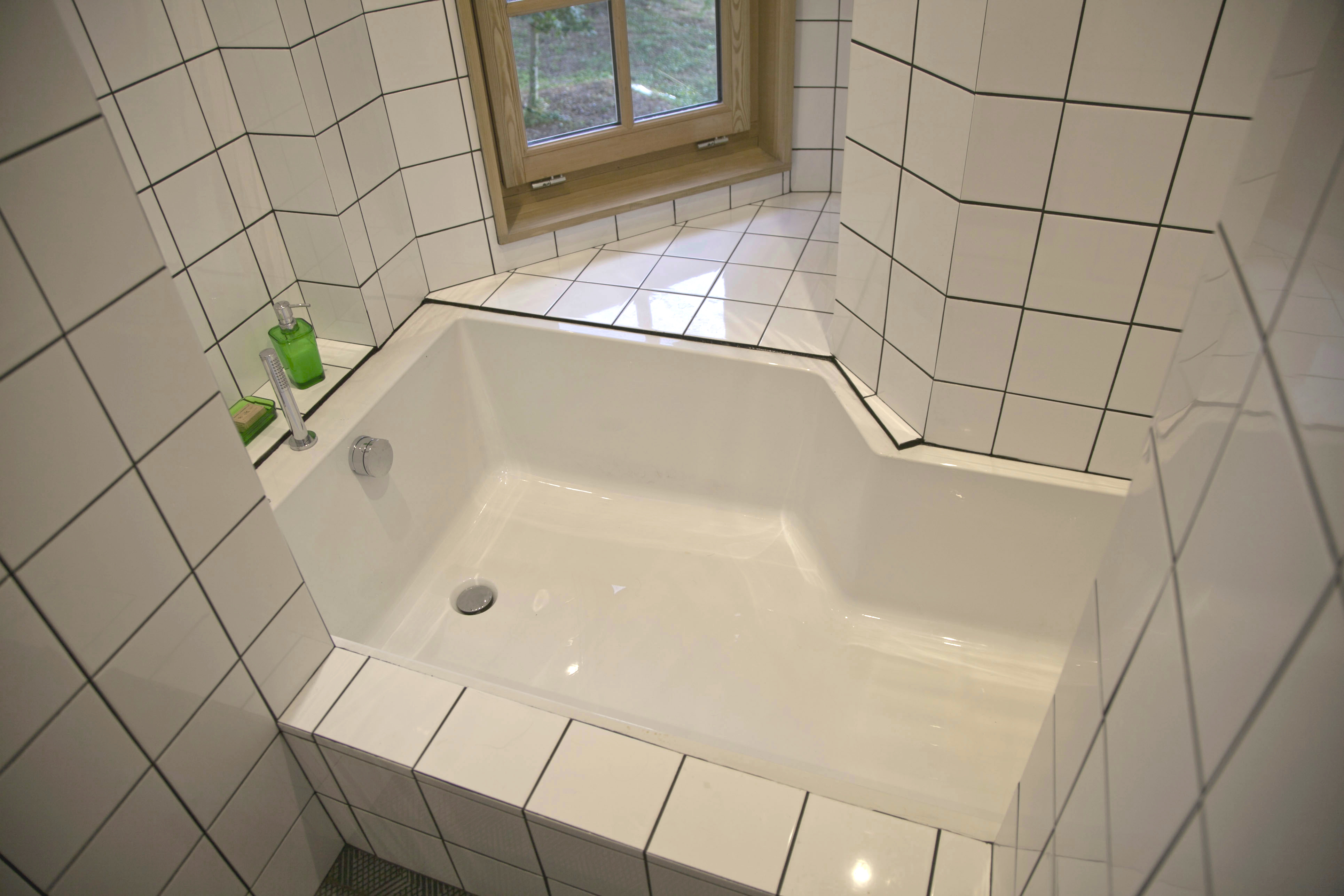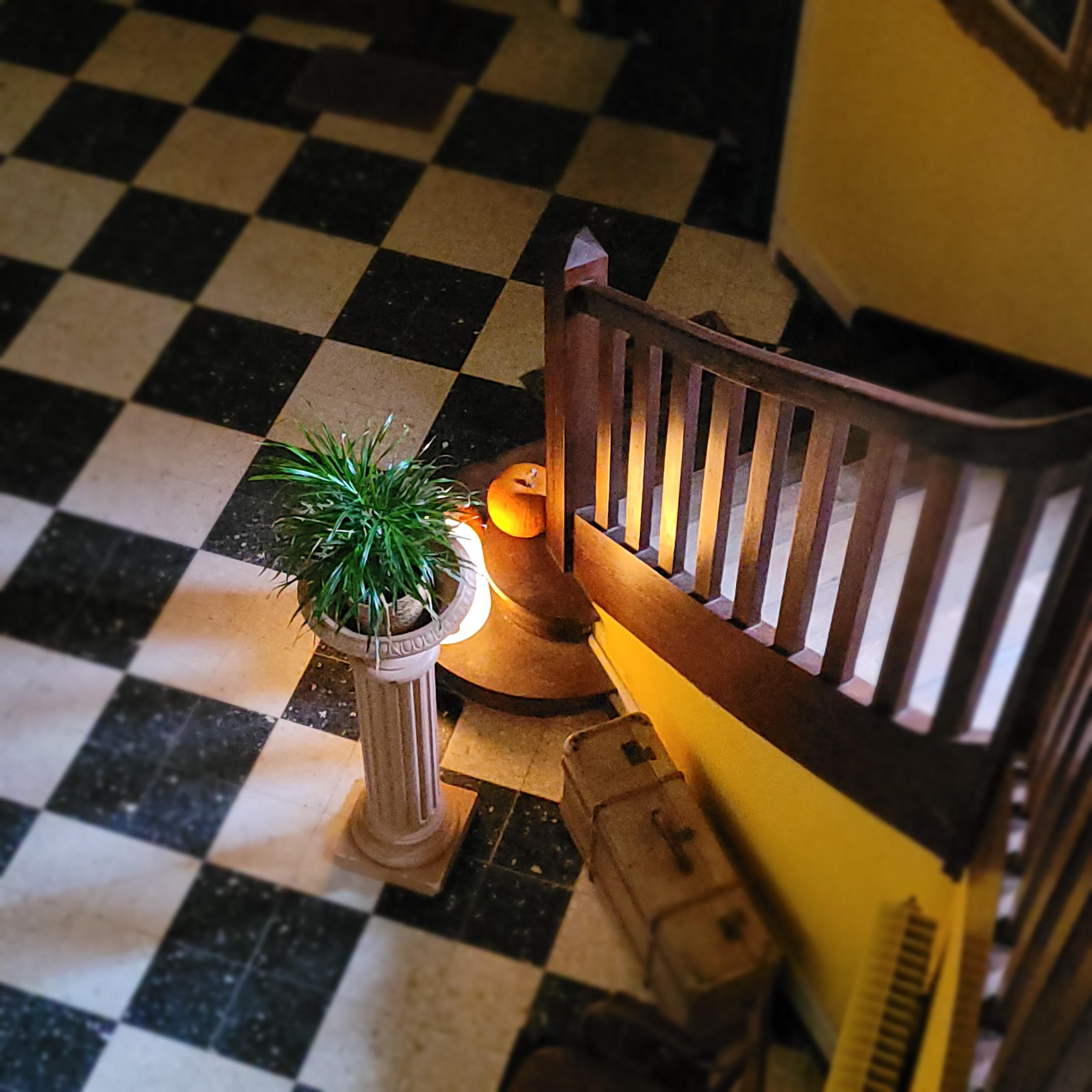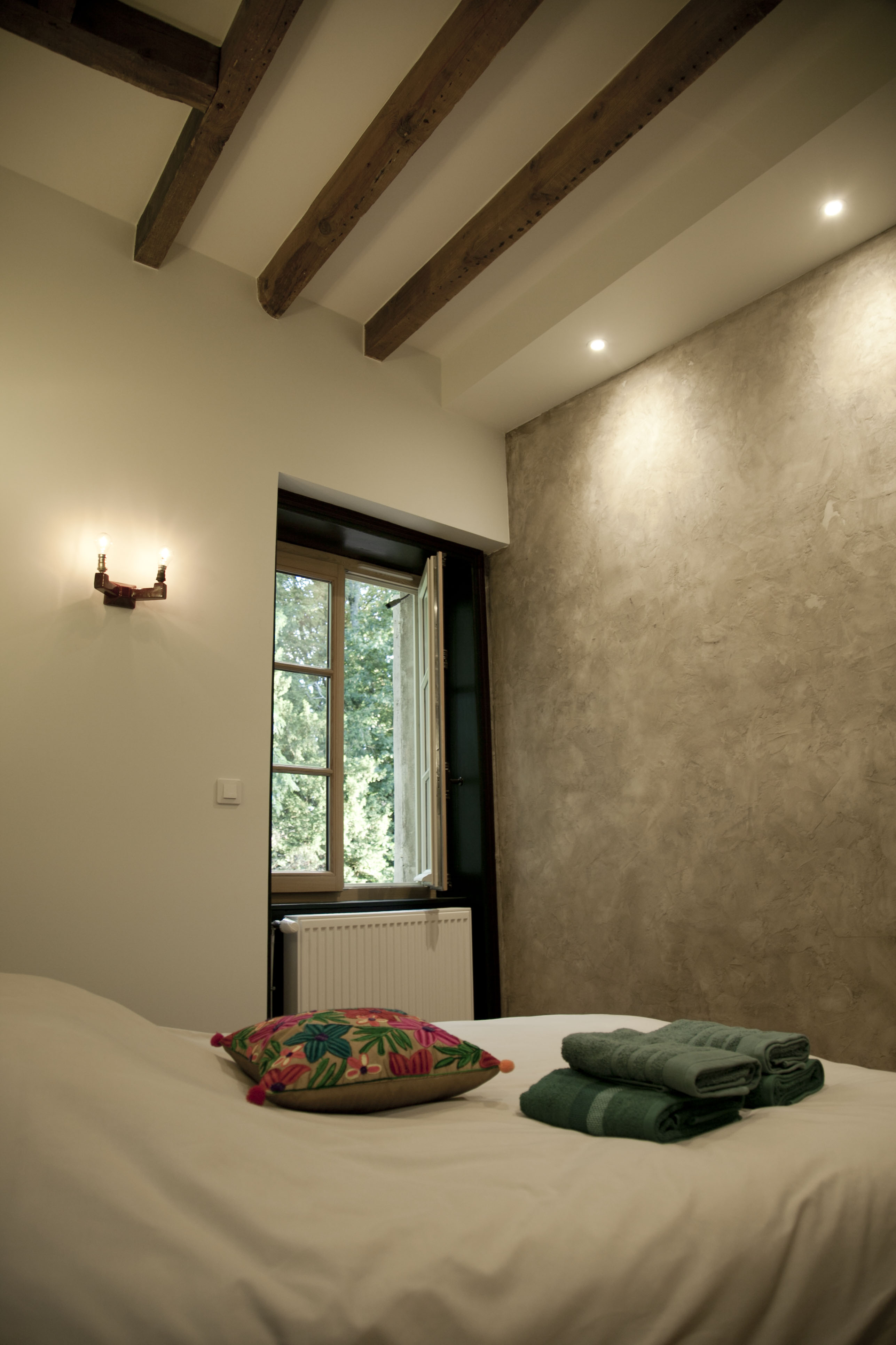La chambre "Expérience" au 1er étage de la Tour Rose est un pari d’aménagement : la volonté de faire cohabiter l’ancien et le contemporain, autant par les objets, mobiliers et luminaires, que par une salle de bain, clin d'œil au travail de l’artiste plasticien Jean-Pierre Raynaud, revêtue de carreaux blancs 15x15 avec joints noirs.