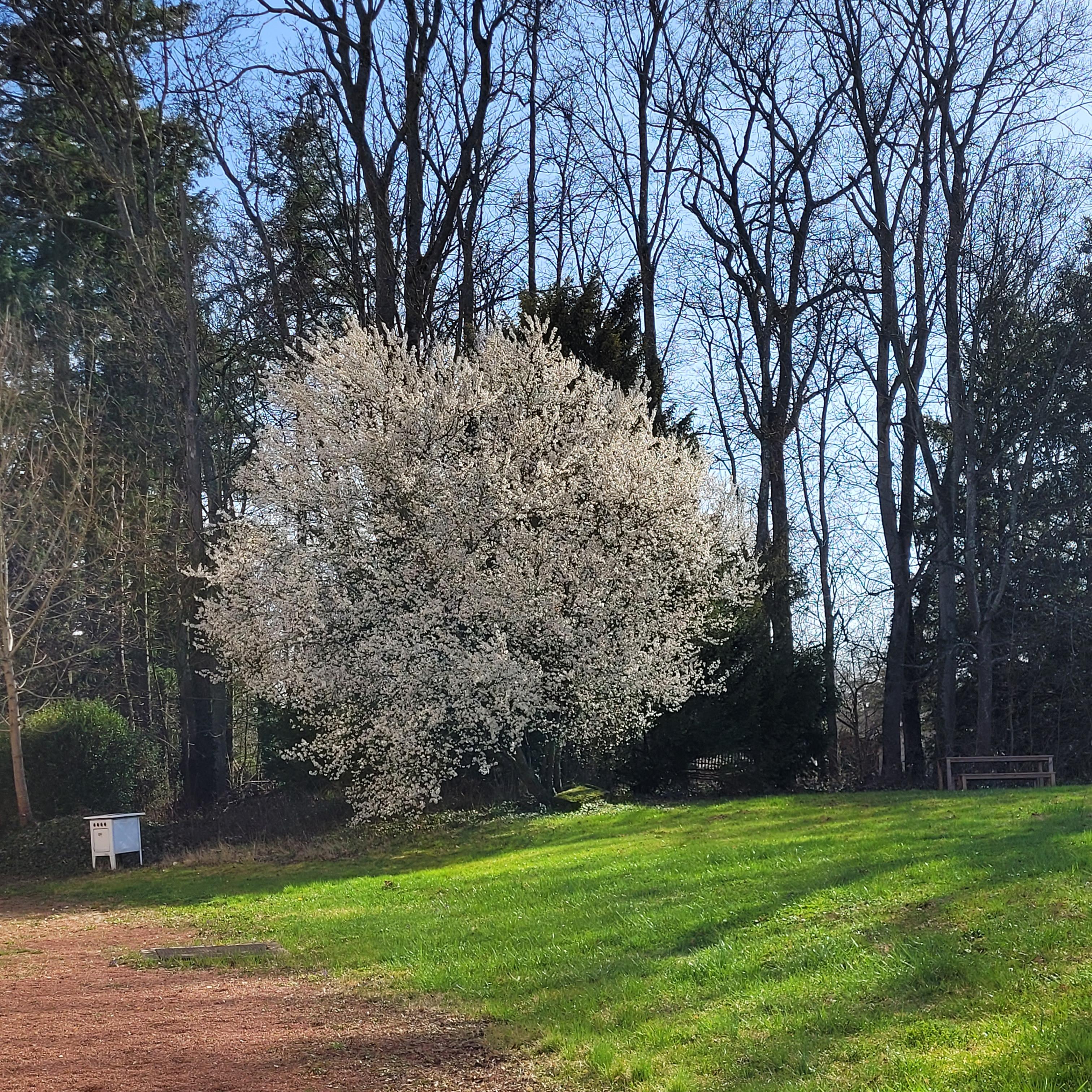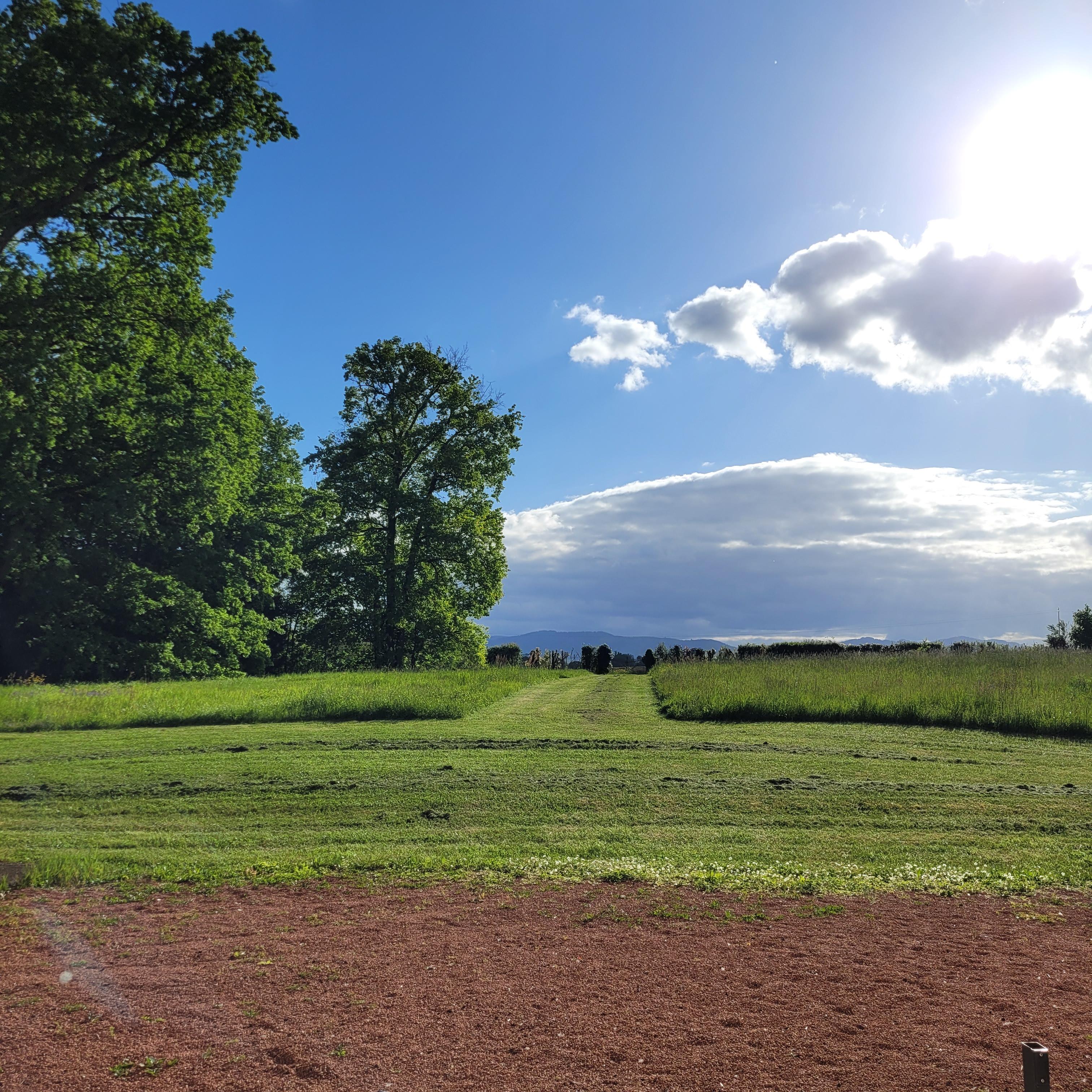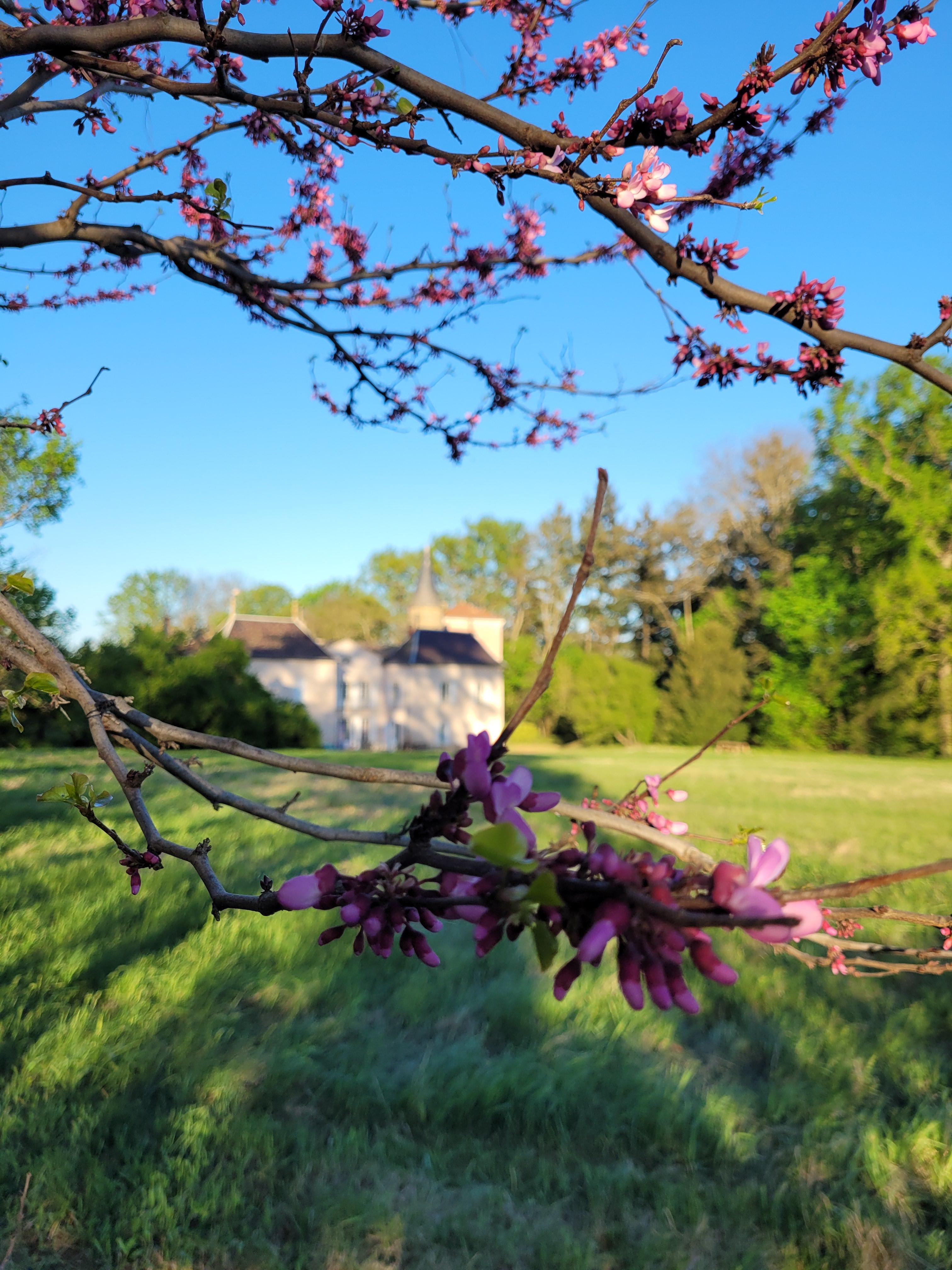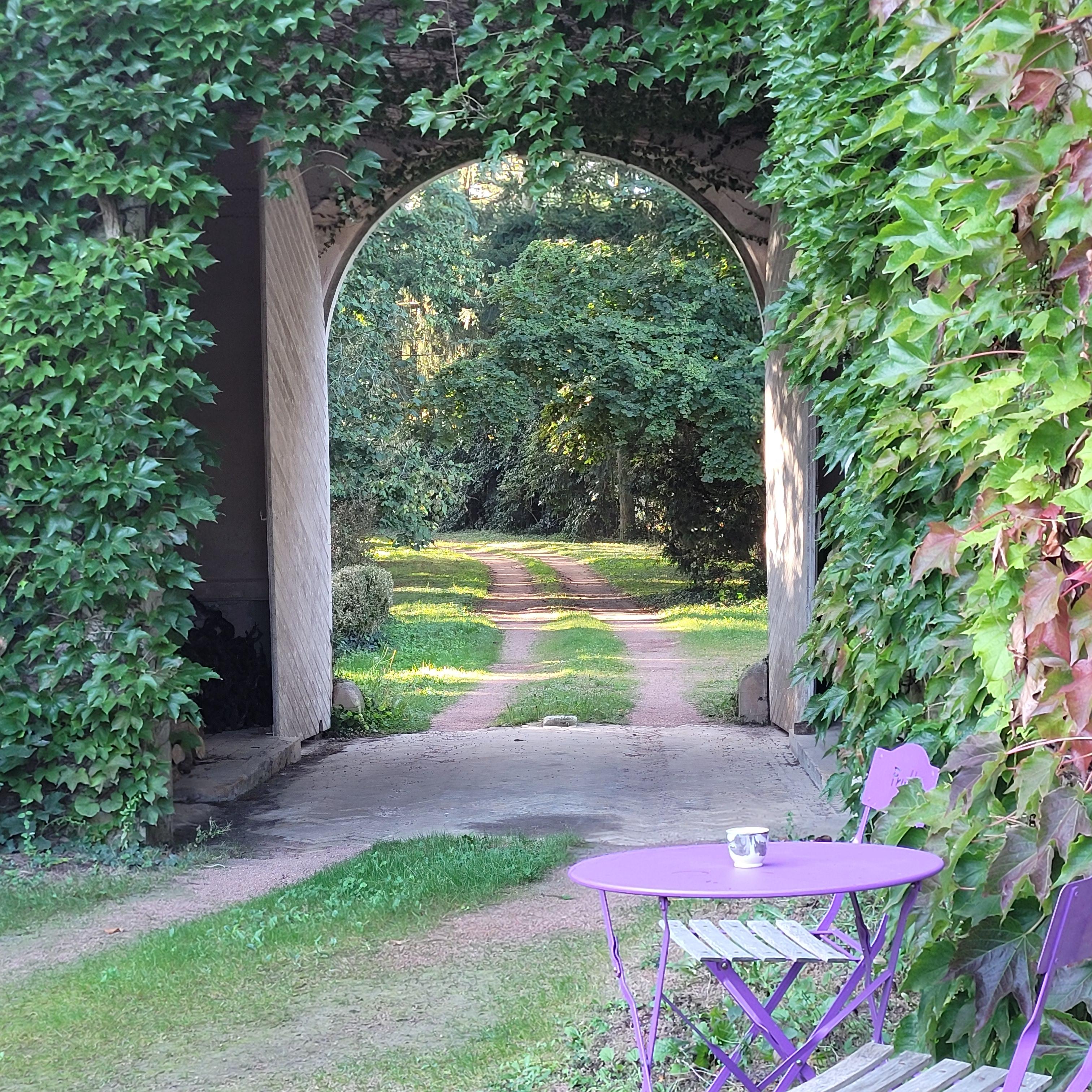 L’arrivée sous les bois pleine de mystères laisse la façade de l’Arche se dessiner délicatement entre les branches des arbres.