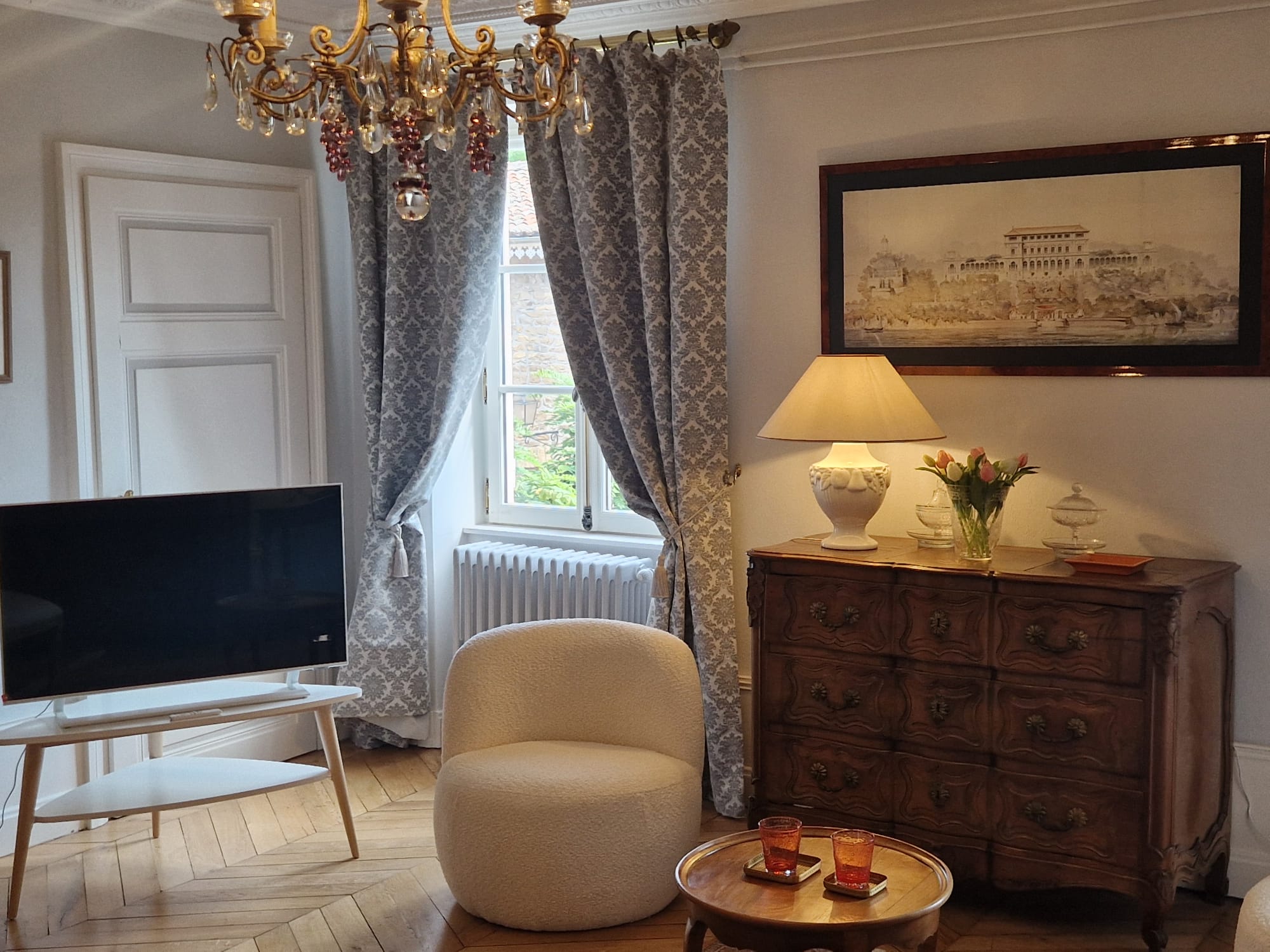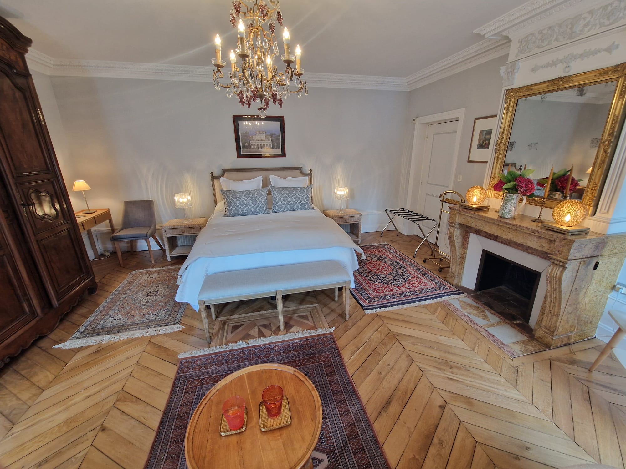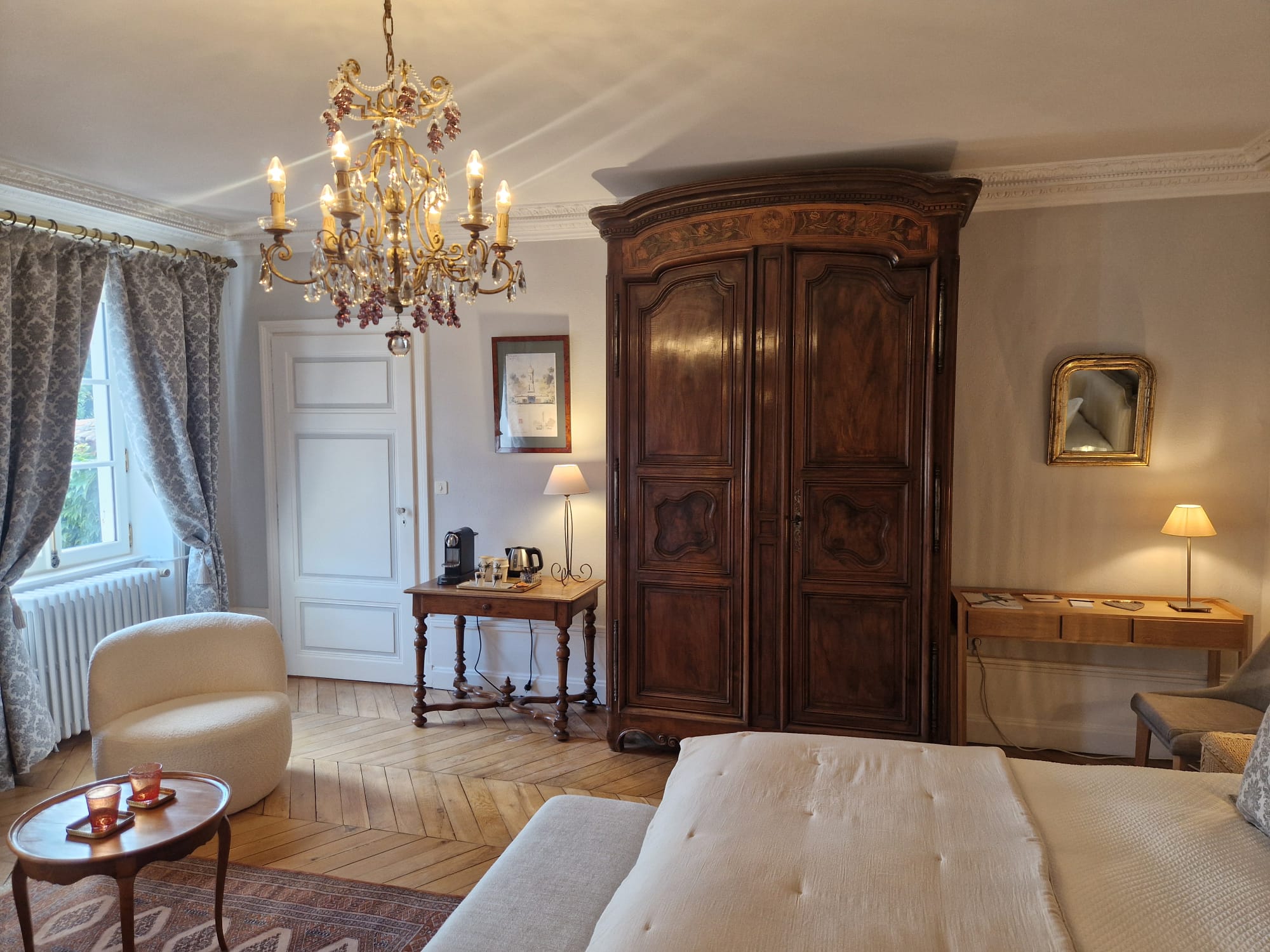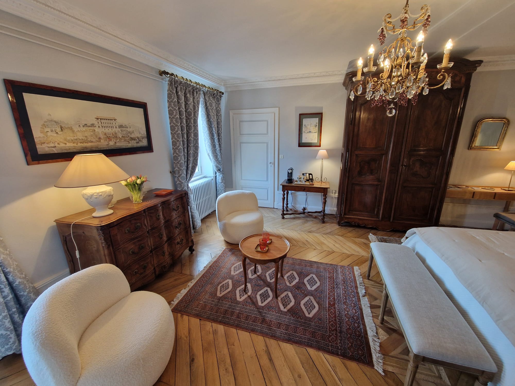Votre vaste chambre d'hôtes, entièrement rénovée, vous attend. Salon datant de 1837, décorée avec élégance, équipée de meubles d'époque et d'une salle de bain moderne et confortable, dans un espace global de 40 m², dont une chambre de 28 m².
