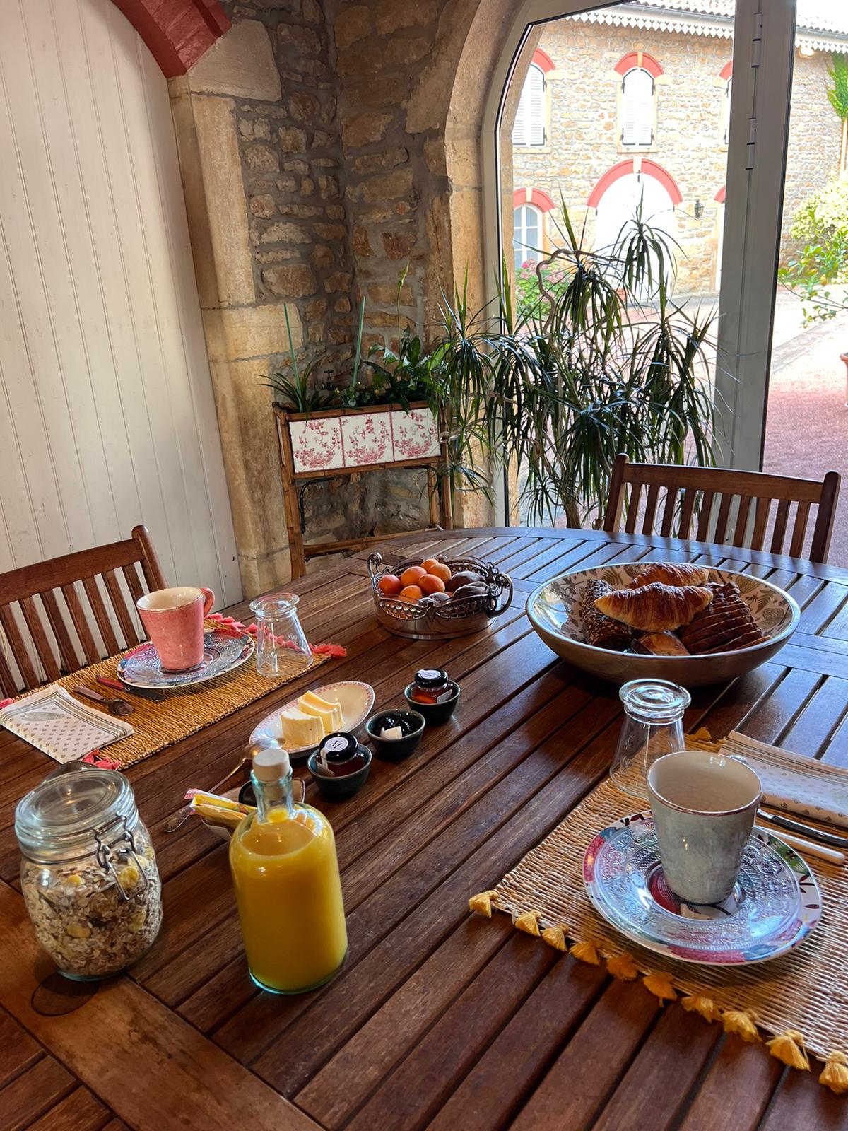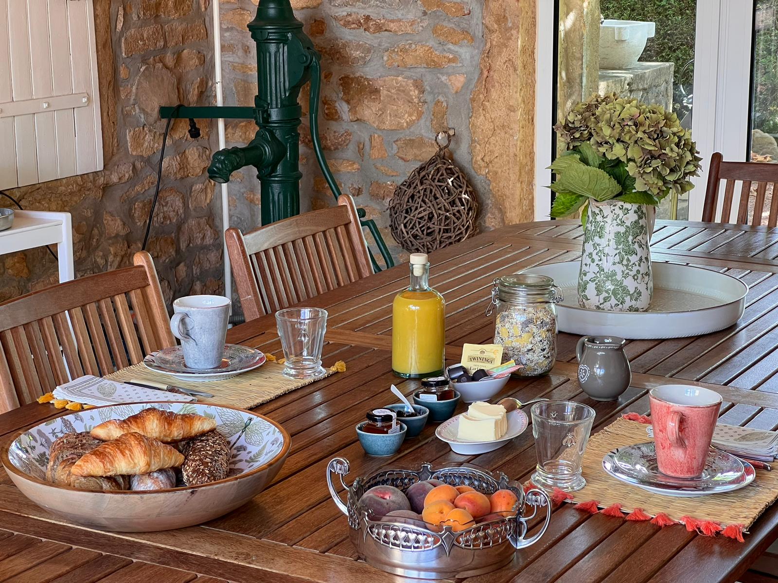 – Petit-déjeuner continental : Boisson chaude (Café ou Thé) ; Pain baguette, Pain aux graines, Croissant, Confitures, ou bien Muesli avec lait ; Yaourt, Jus d’orange, Fruits de saison ou Compote,