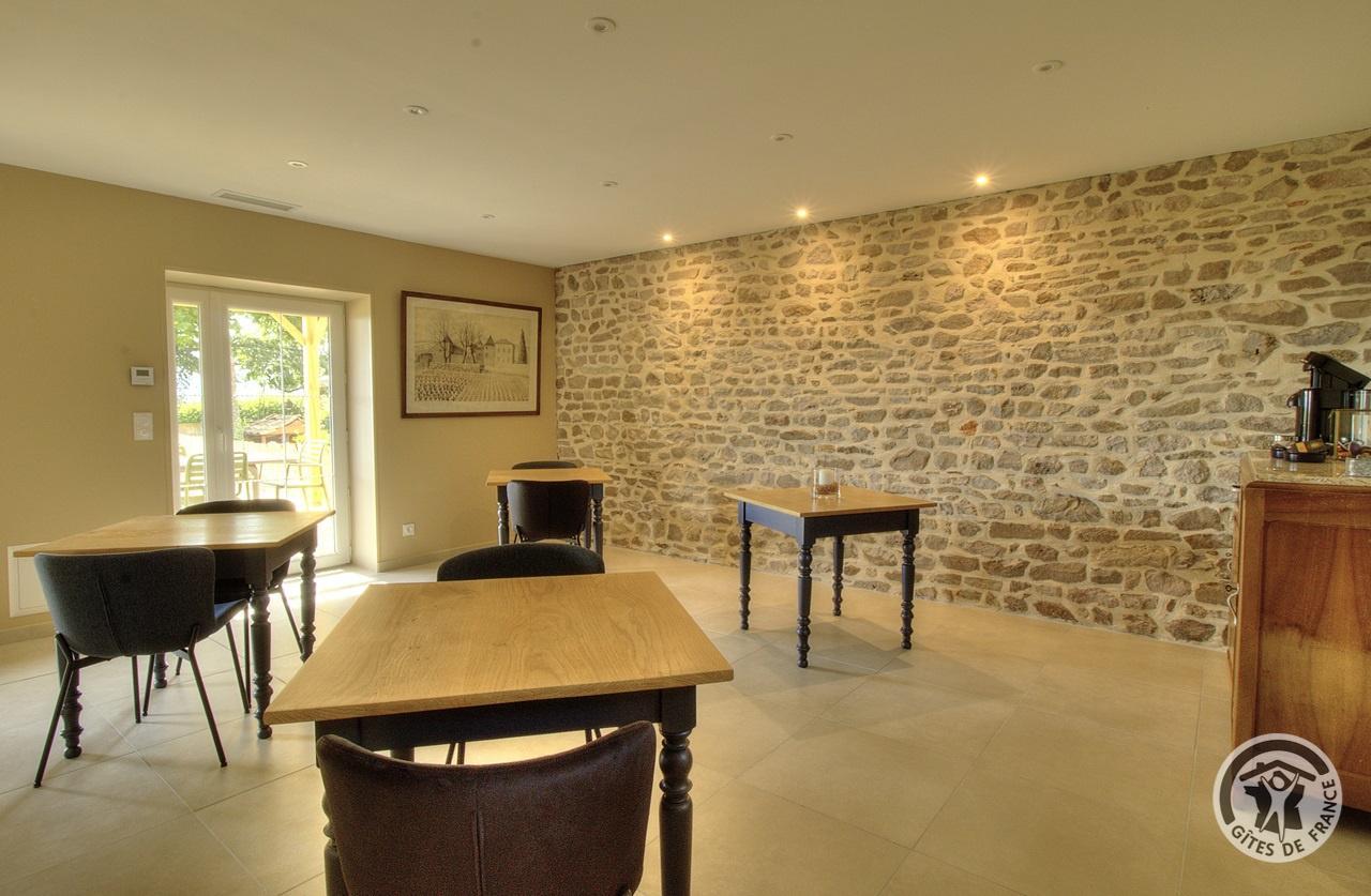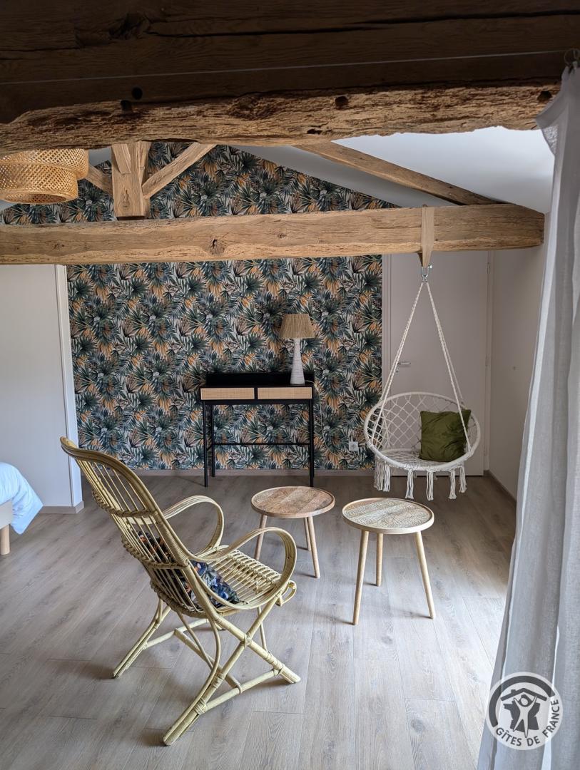 Au rez-de-chaussée, une pièce de jour de caractère vous attend pour des moments de détente. En été, savourez votre petit-déjeuner sur notre terrasse, entourée d'un jardin ombragé où vous trouverez des chaises longues pour profiter du calme et de la nature et vous relaxer à l'ombre des arbres..