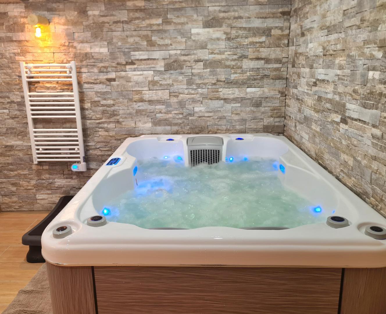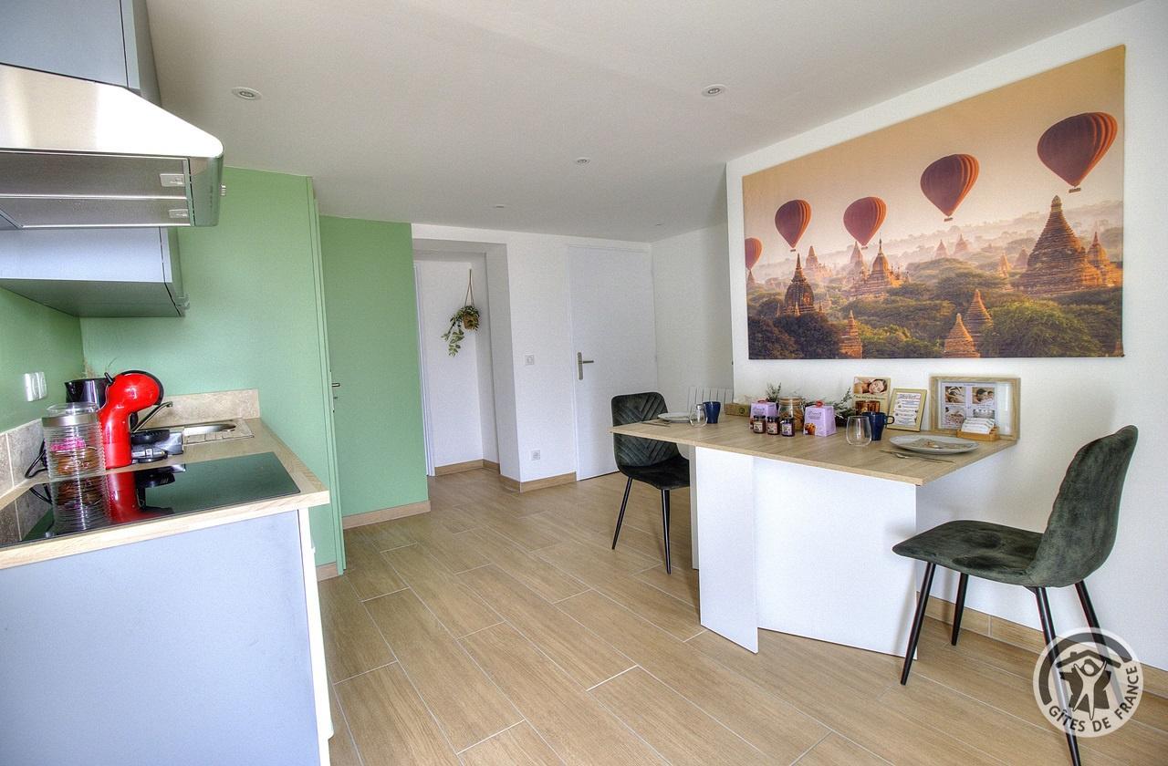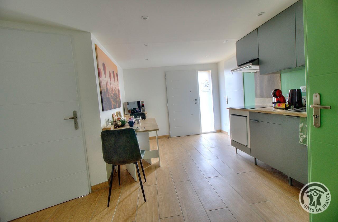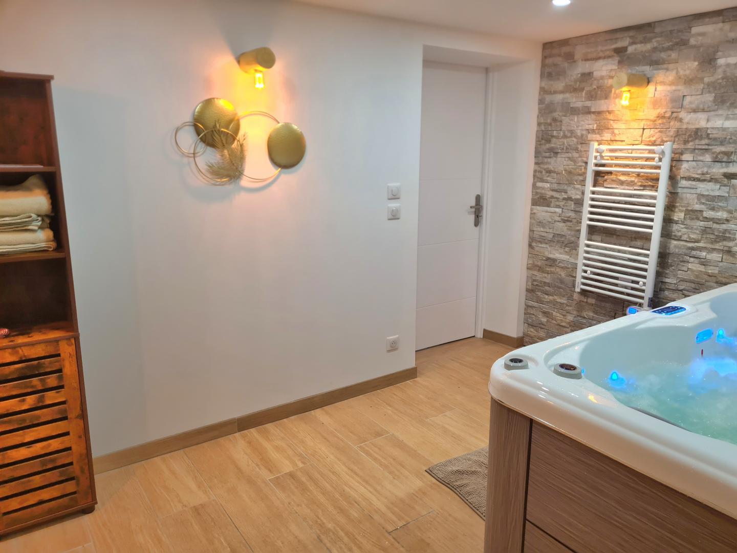 Un séjour avec coin cuisine et espace repas, une chambre avec un lit double escamotable en 140, une salle d'eau, un WC indépendant et une pièce avec spa et sauna, en accès illimité et totalement privatif (60 € pour 2 personnes).