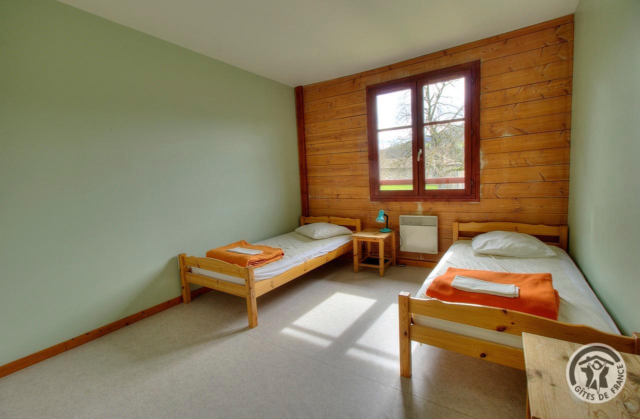 Indépendant, accès plain-pied : vaste salle à manger, coin-salon, poêle à bois, cuisine professionnelle, 1 chambre accessible personne handicapée (2 lits 1 personne) avec sanitaires privatifs. Etage : 6 chambres (4 lits 1 personne superposés), 1 chambre (2 lits 1 personne), sanitaires communs. Chauffage électrique, téléphone, WIFI. Balcon, local VTT. Parking. Gestion libre. Possibilité livraison repas par traiteur local. Pas de forfait ménage. Animaux payants: 5€ /nuit/animal (2 maximum par séjour). Tarif 1 nuit : 16.50 € / 18.50 € par personne. Montant minimum pour un groupe de moins de 20 personnes du samedi au dimanche: 330 € /370 €. Forfait semaine du lundi au vendredi: 1230 € / 1340 €. Tarif 1 nuit / randonneur : 14.50/15.50 €. Les tarifs publiés sur le site correspondent à la location du gîte de groupe pour 28 personnes. Pour tout séjour d'un plus petit groupe nous contacter. Possibilité de louer en annexe, 4 petits chalets - capacité 16 pers.- (4 lits 1 pers. superposés dans chacun) + petit coin-cuisine + salle d'eau/wc (tarif location d'un gîte pour 4 personnes: 66€ / 74€, la nuit). La capacité maximum d'accueil de la salle à manger est de 44 personnes.