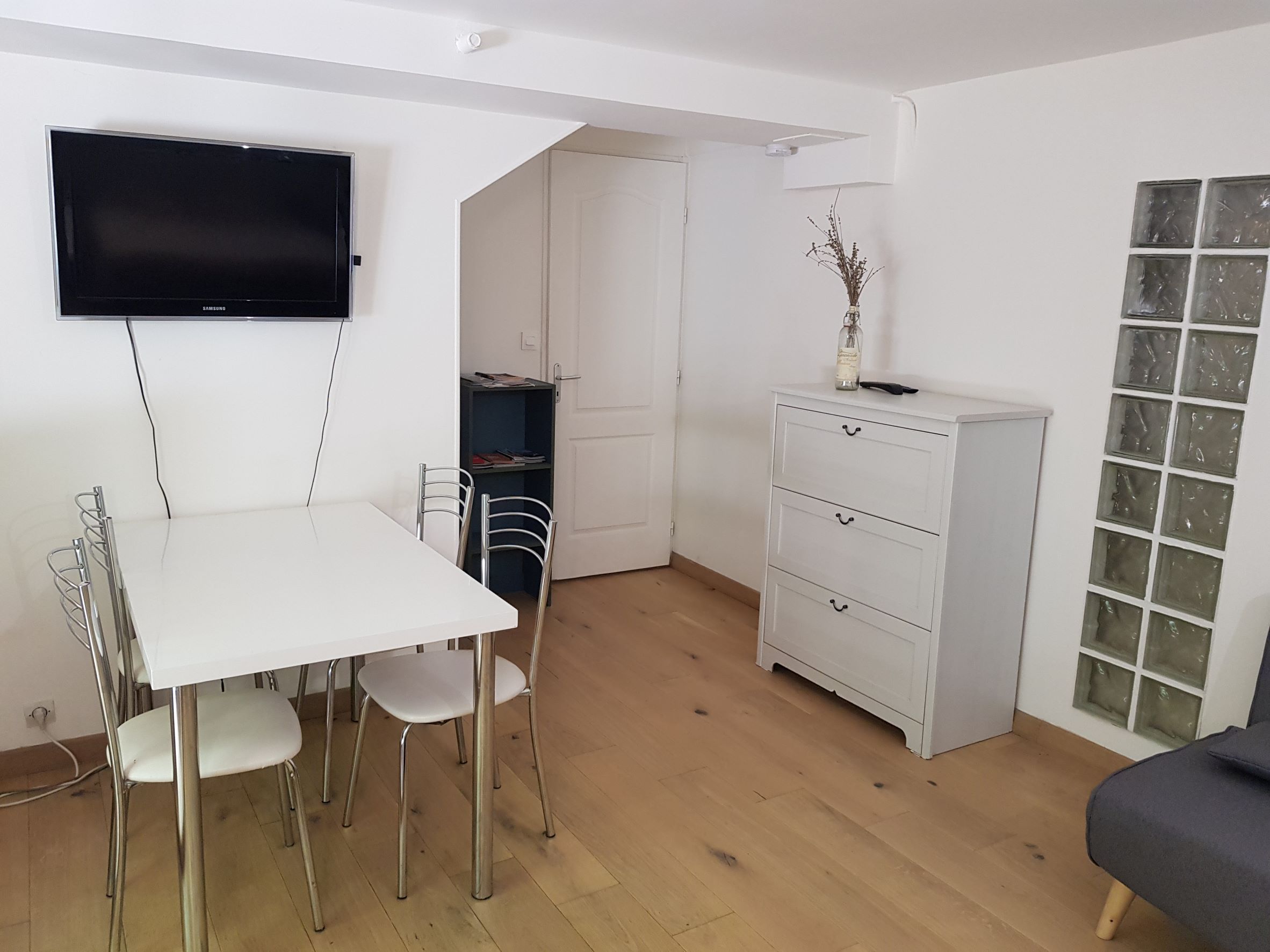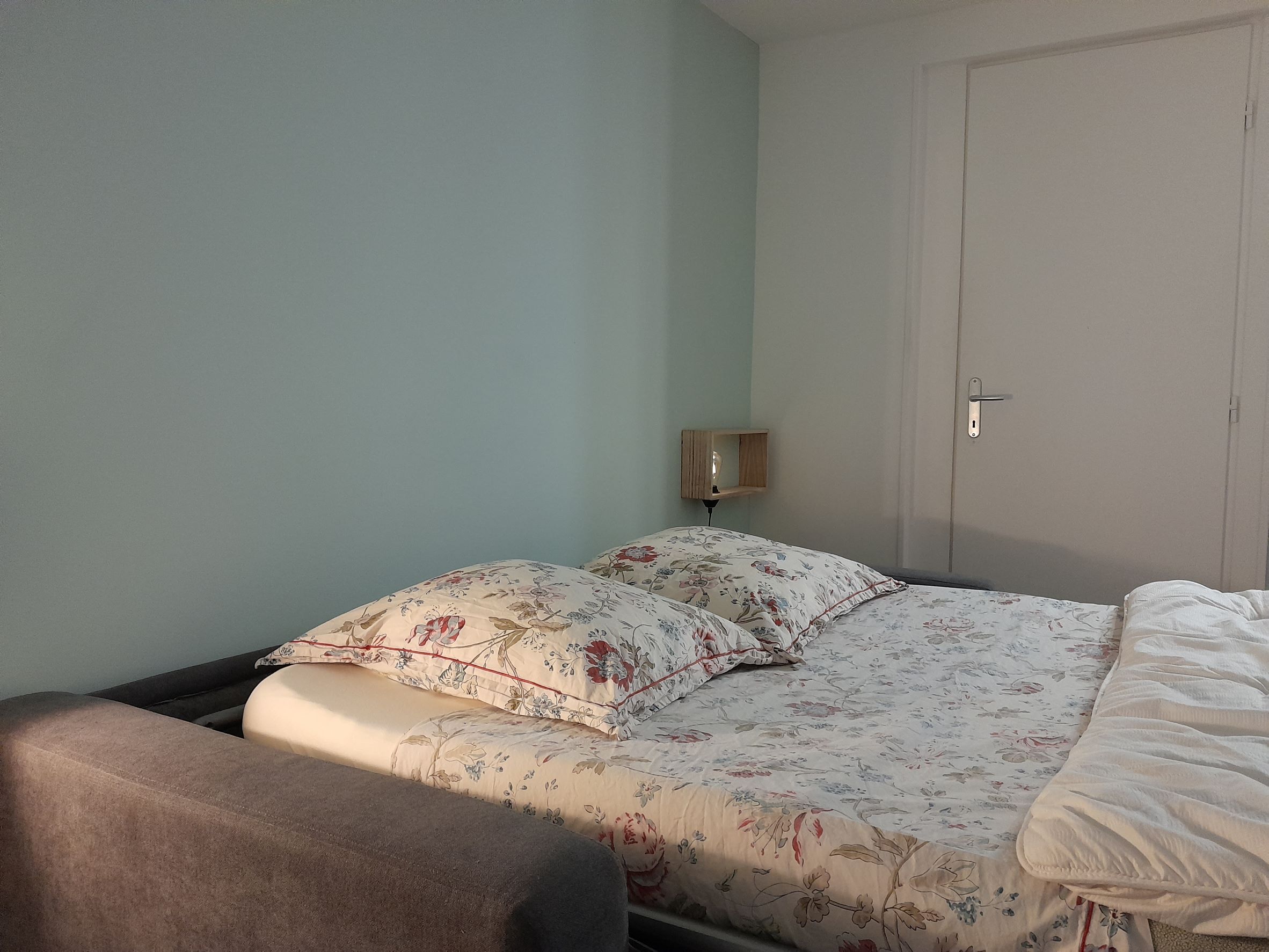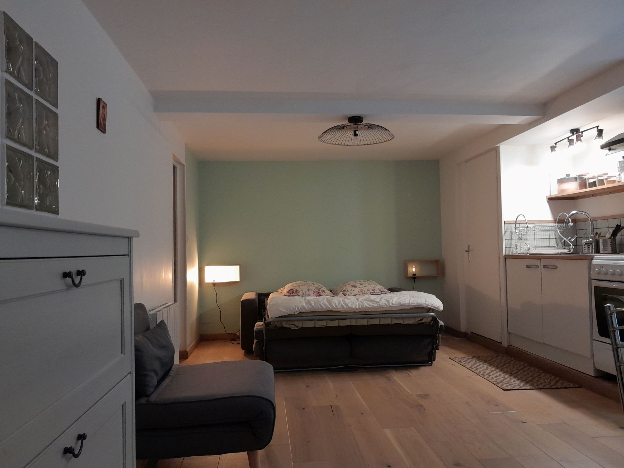 La chambre comprend un coin cuisine équipée, une salle de bain avec une machine à laver le linge, un canapé-lit double et un fauteuil lit simple. Le linge de lit et les serviettes sont fournis.