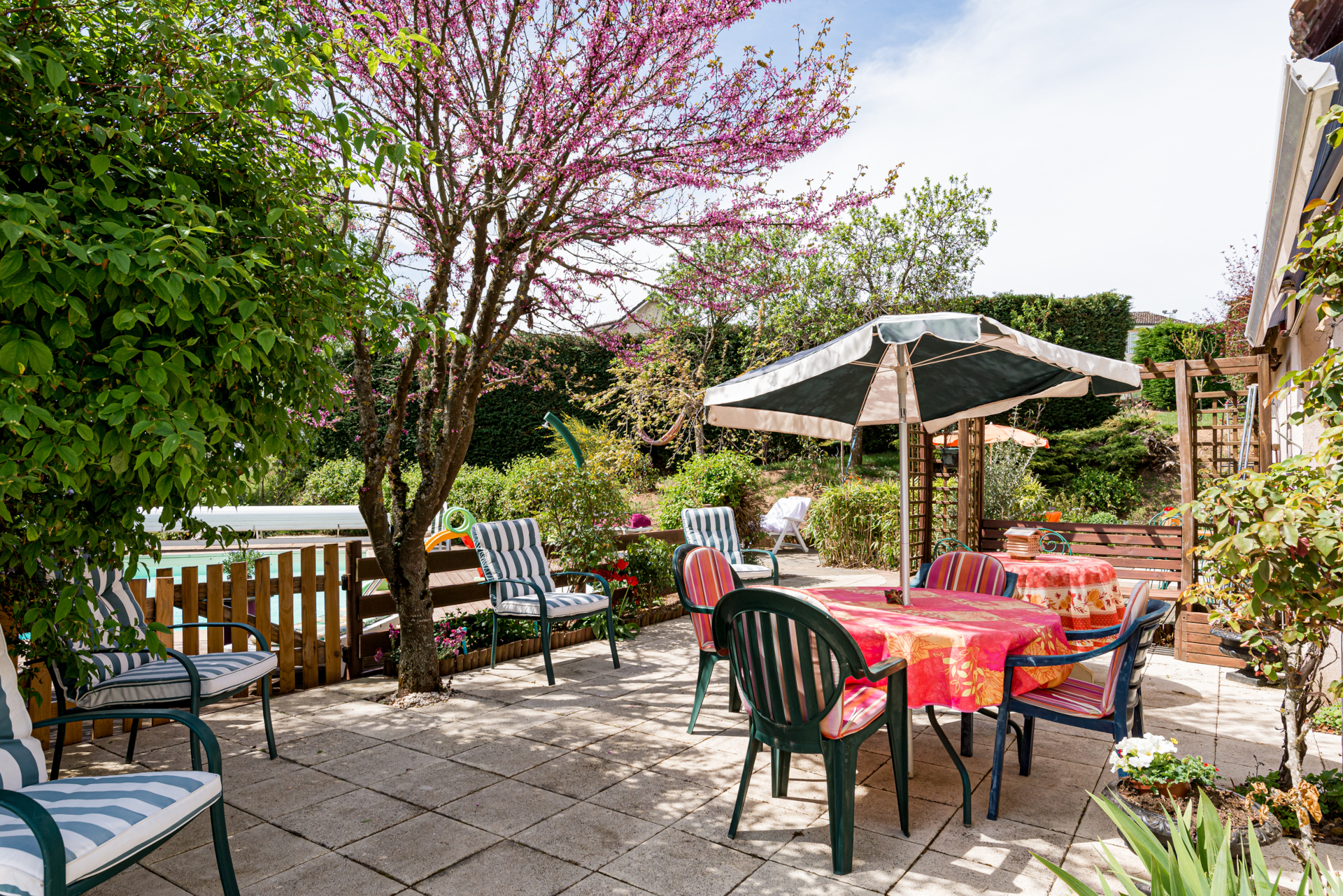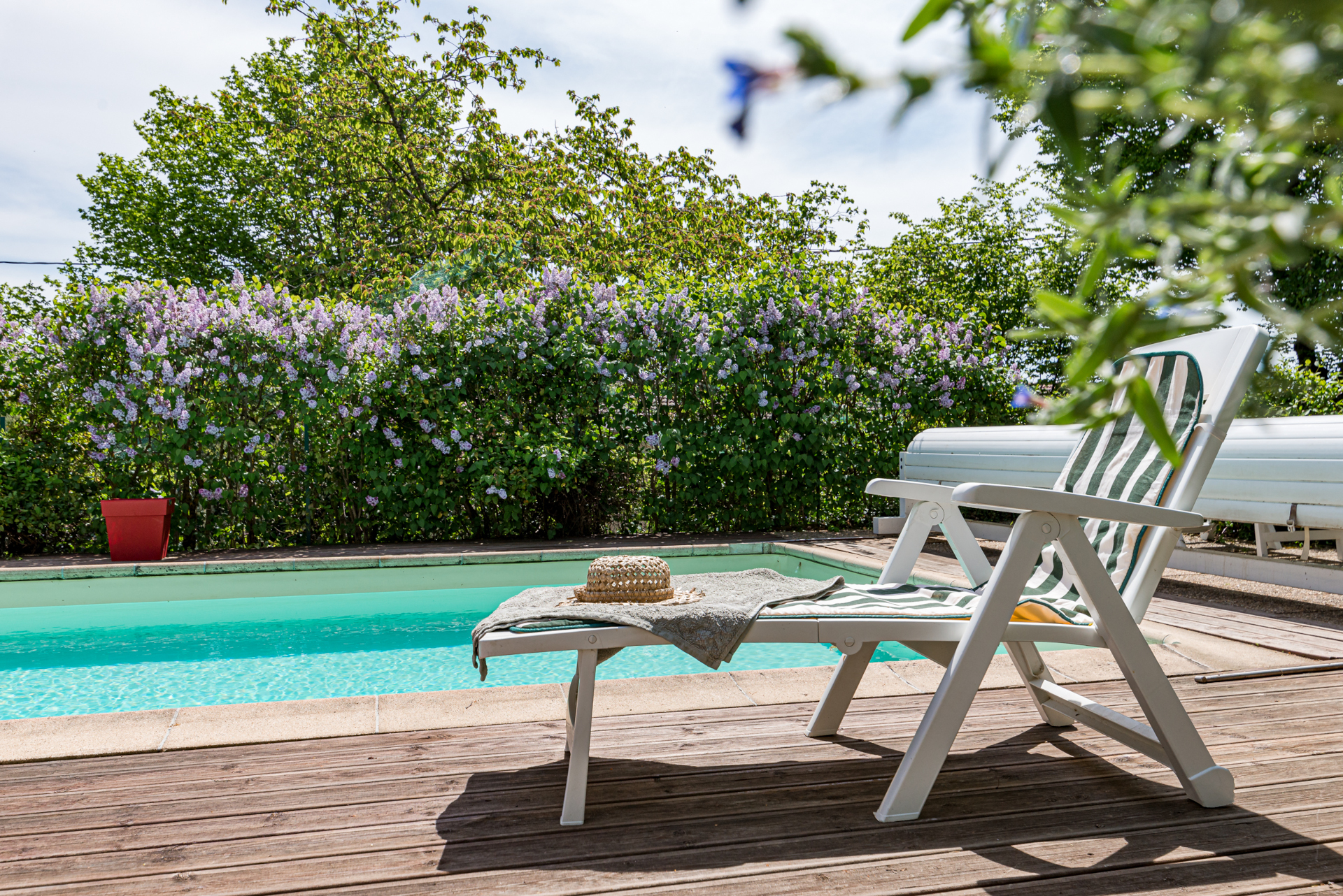 Terrasses, spa et piscine dans un grand jardin arboré, tables chaises et parasols, bains de soleil.