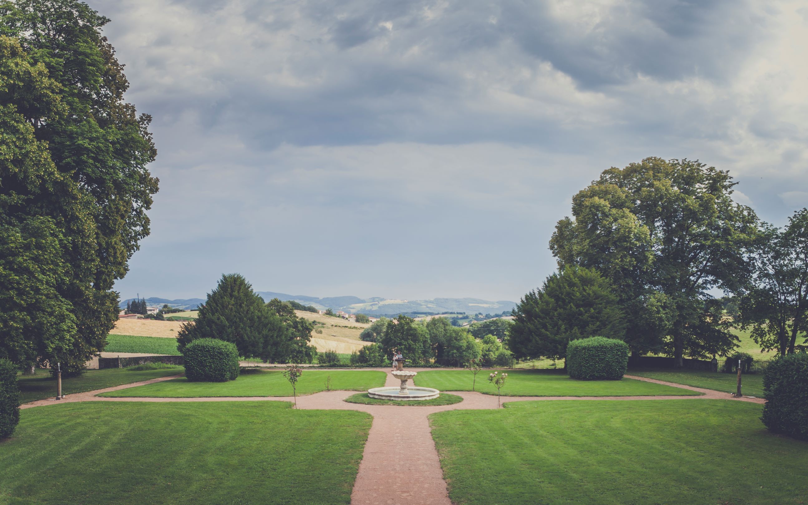 Chambre Montaigne : spacieuse avec un lit king size sa grande salle de bains lumineuse et sa vue sur les Monts du Lyonnais.