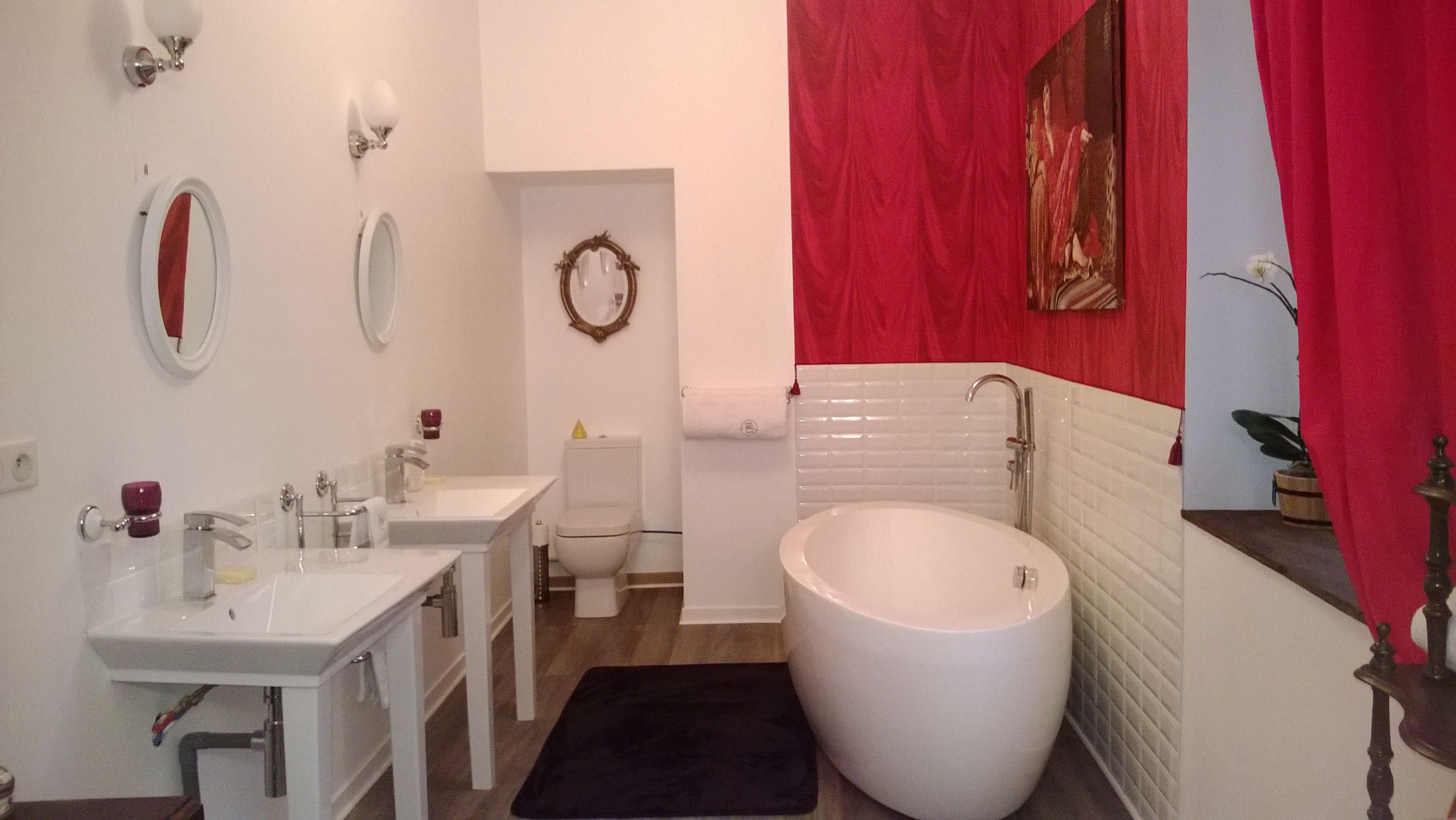 Chambre d'Orient : chambre cocon avec lit à baldaquin et sa salle de bain boudoir, vue sur les Monts du Lyonnais.