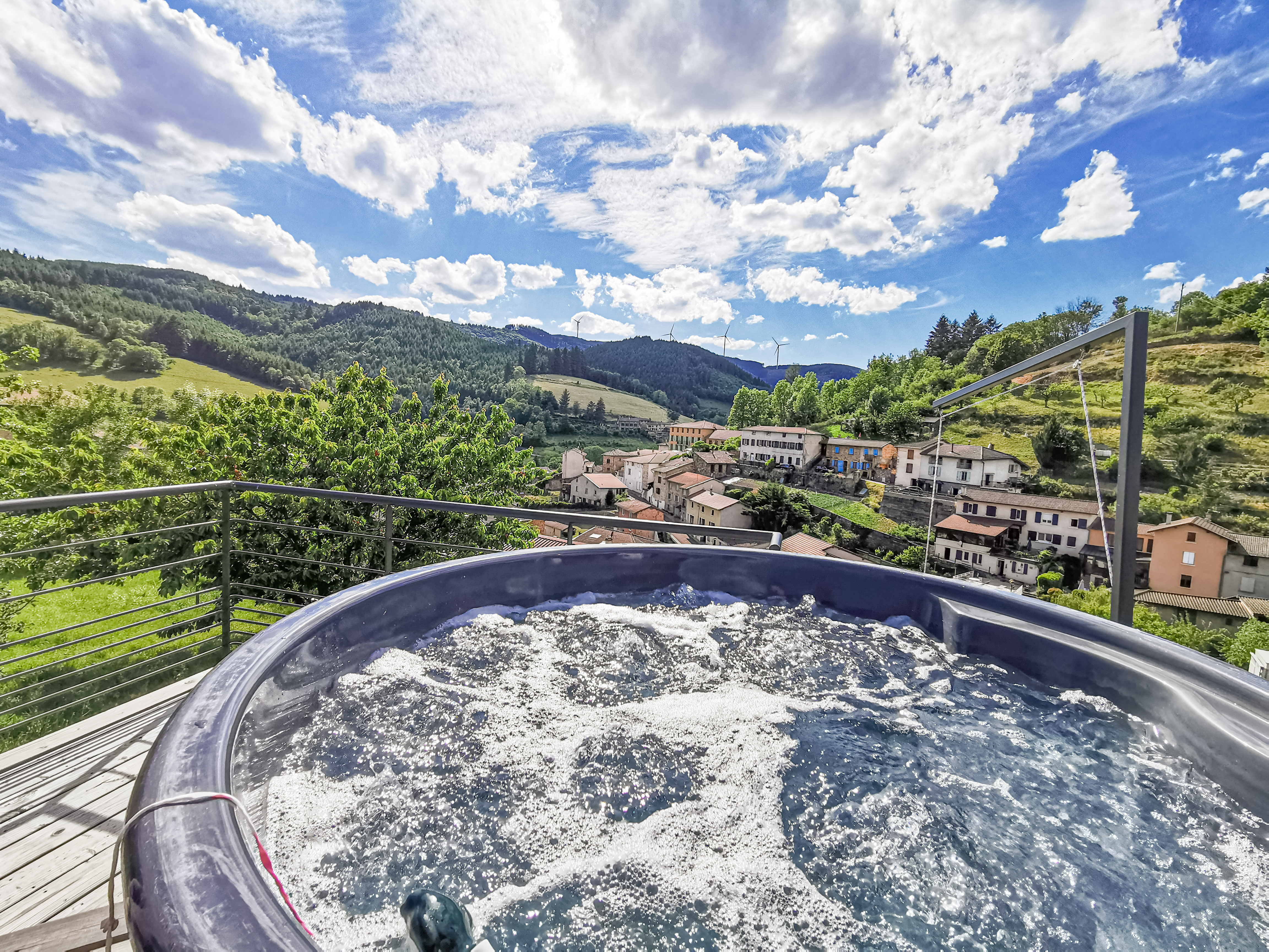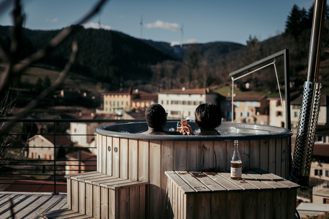 Finissons la visite par la chambre comprenant un lit kingsize en 180 x 200 (2x 90 cm dissociables sur demande), son coin bureau et son dressing fermé pour ranger valises, souvenirs et chaussures de randonnée….puisque de nombreux sentiers de randonnées sont proposés sur place et à proximité plus ou moins dénivelés pour que chacun programme sa dose de sport selon sa condition physique….et ainsi mériter la détente post-effort dans le bain nordique privatisé aux abords du verger, surplombant le village. Son eau chauffée au bois fera disparaitre courbatures, stress ou fatigue.