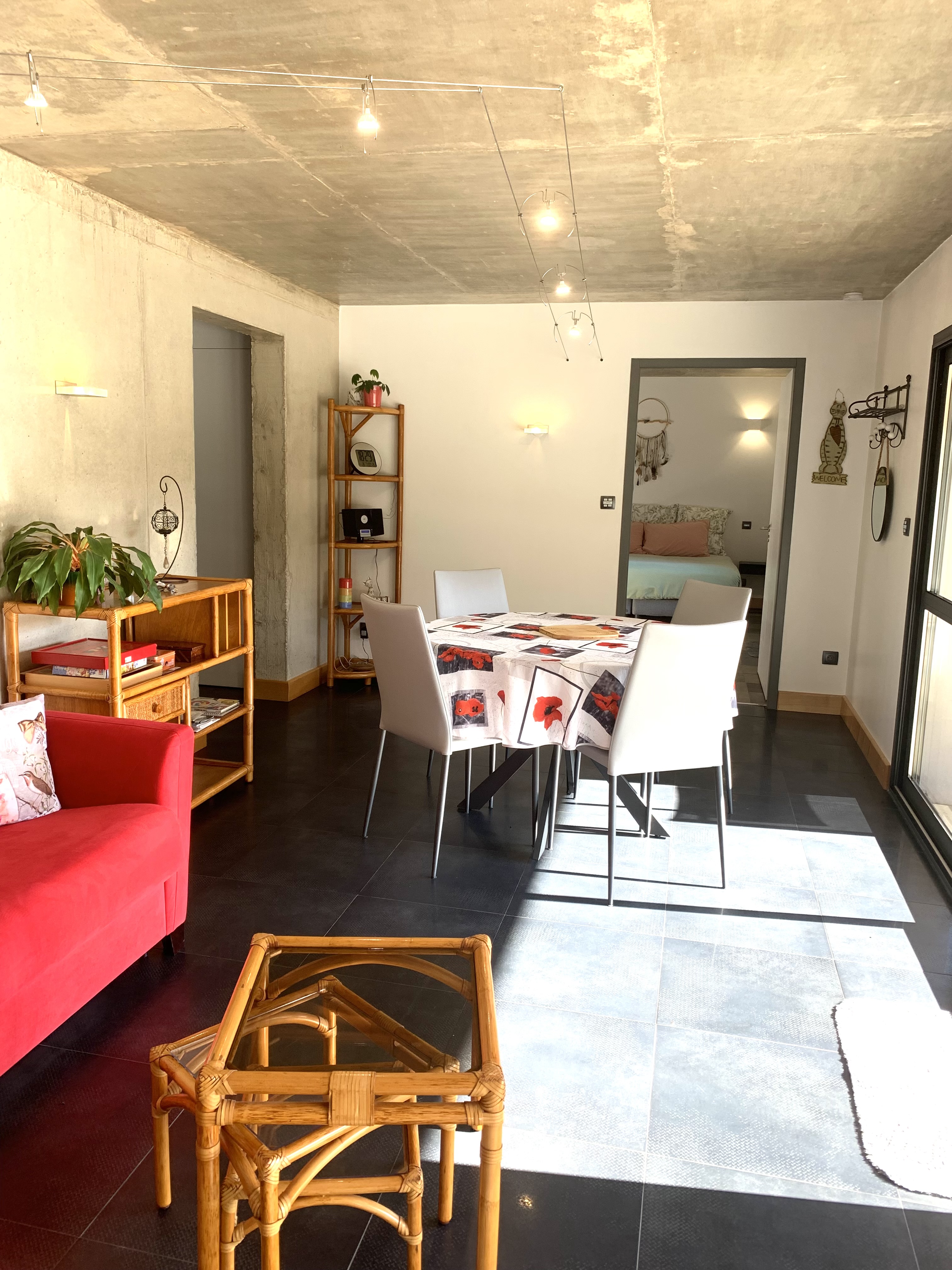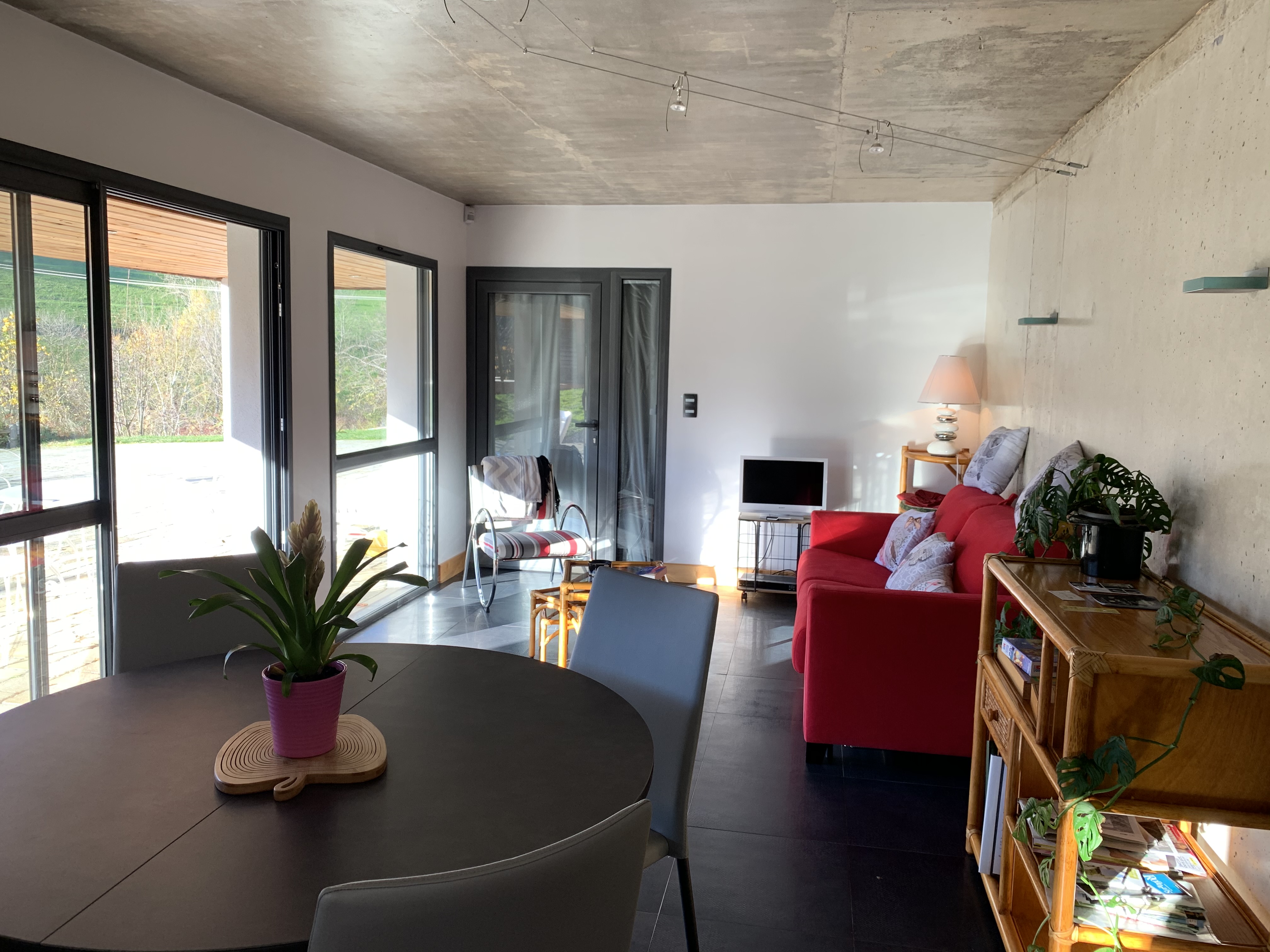 Appartement meublé de plain-pied, spacieux avec ses 60 m², aménagé au rez-de-chaussée d'une grande maison d'architecte, sur les hauteurs du village de Valsonne.