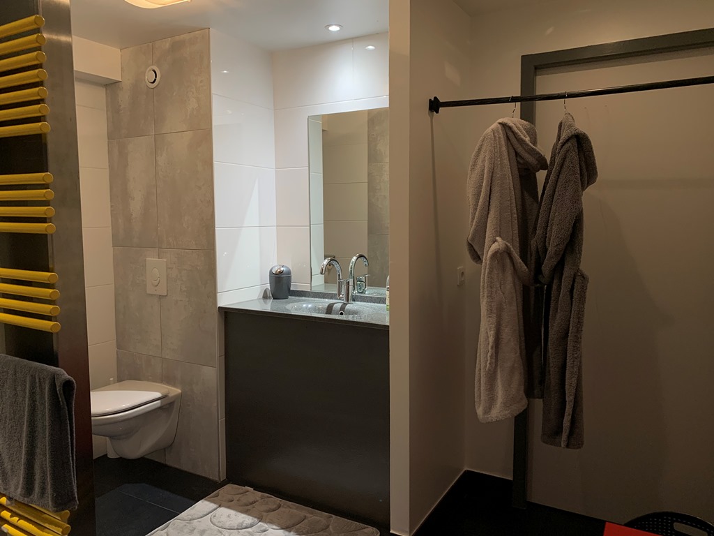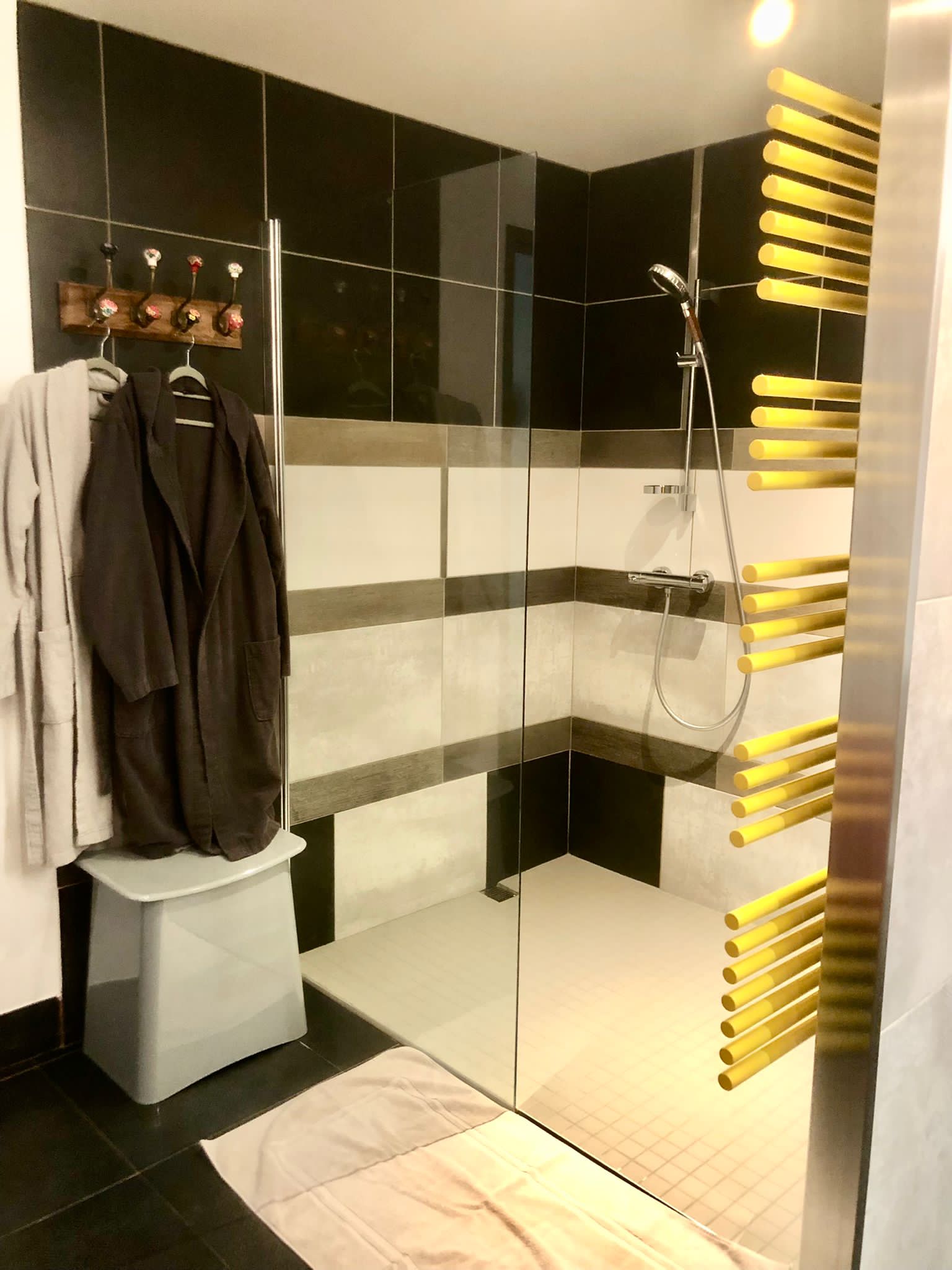 De la cuisine, vous passerez dans la grande salle d’eau incluant les WC. Son immense douche à l’italienne fait toujours son effet.