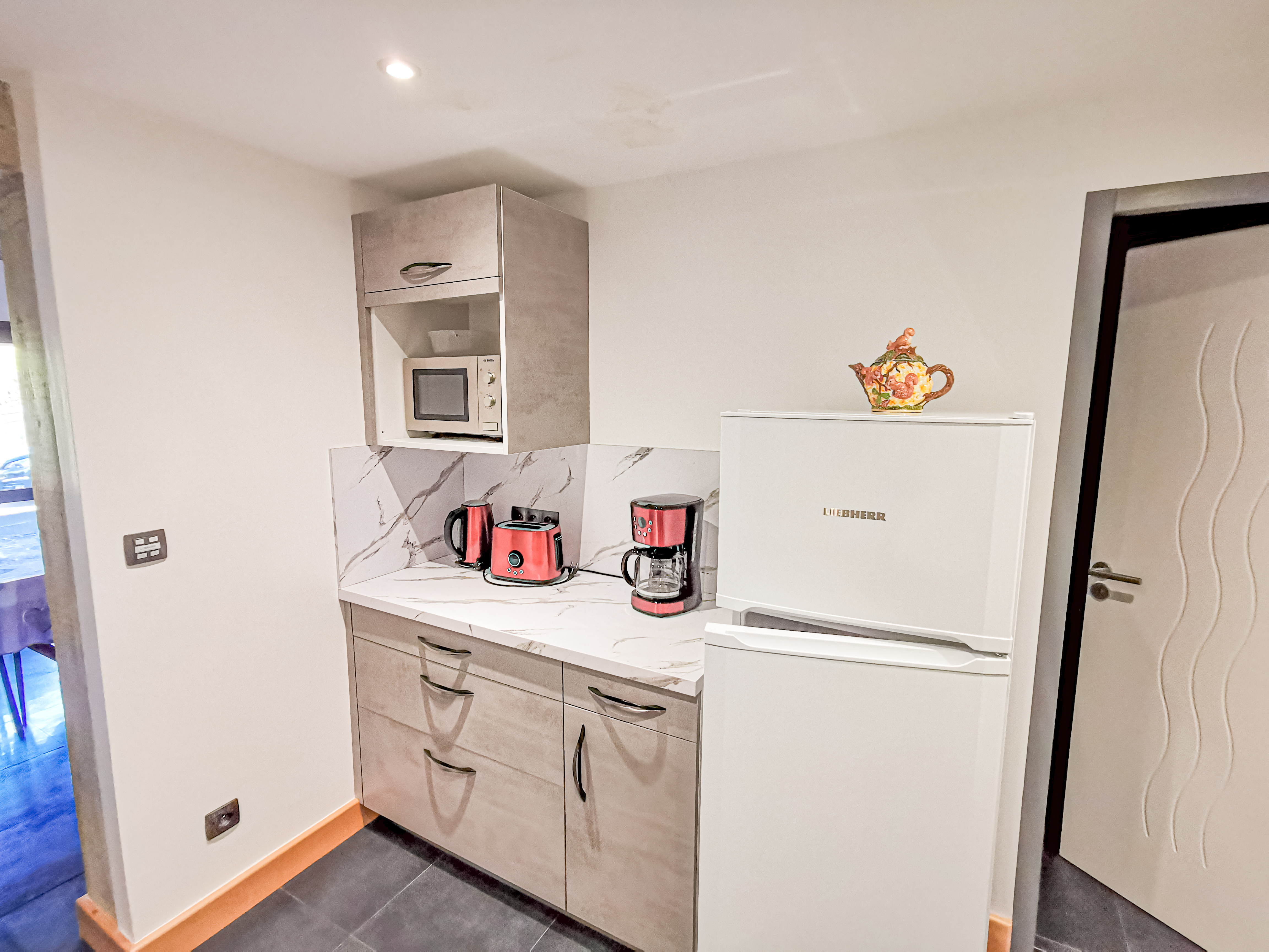 Le coin repas donne sur la cuisine ouverte, entièrement équipée de la vaisselle, en passant par de l’électroménager prémium sans oublier le fond d’épicerie.