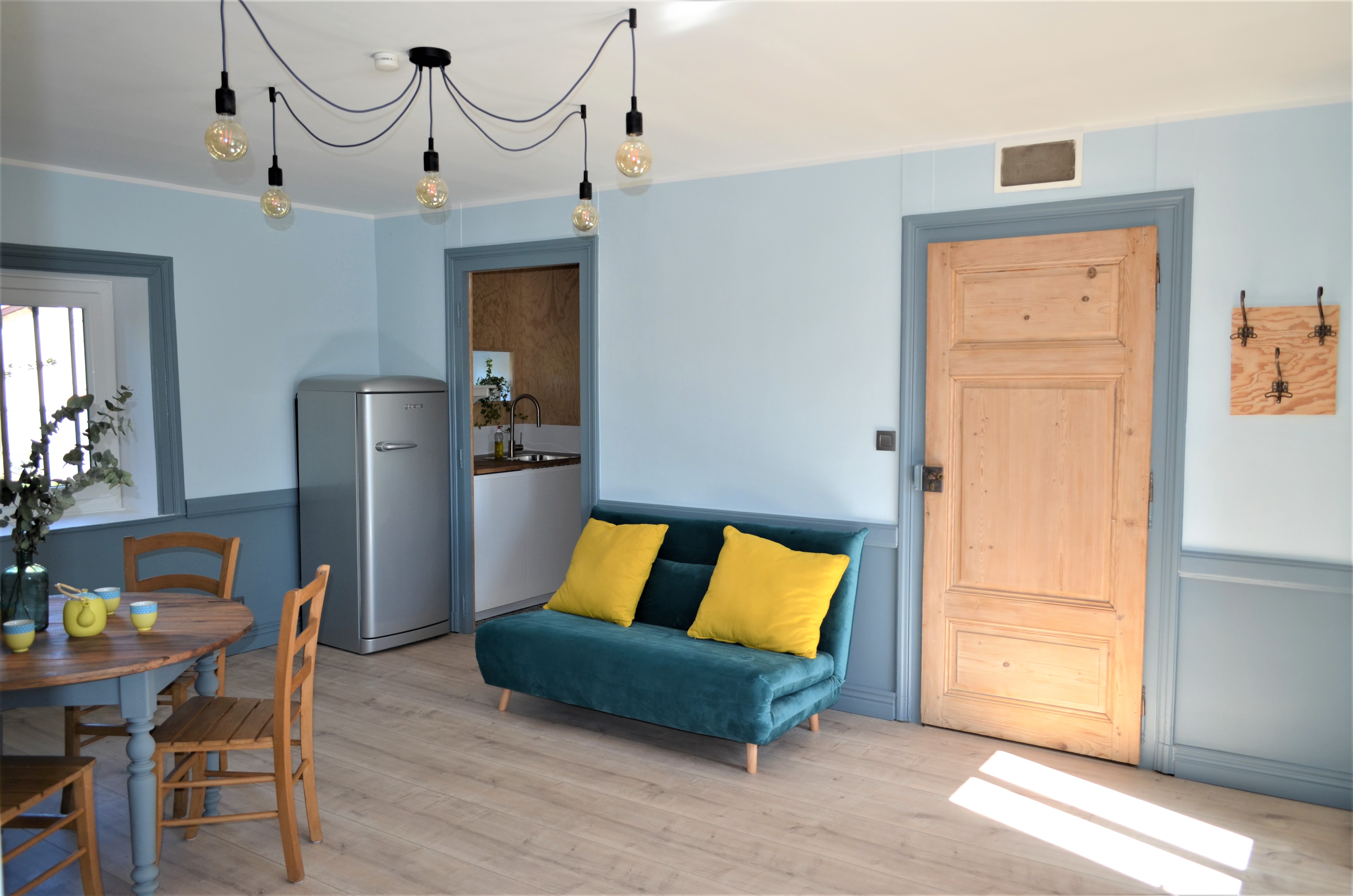 Le gite est composé d'un séjour avec coin salon (canapé convertible) et repas, d'un coin cuisine entièrement équipé, d'une salle d'eau avec une grande douche à l'italienne.