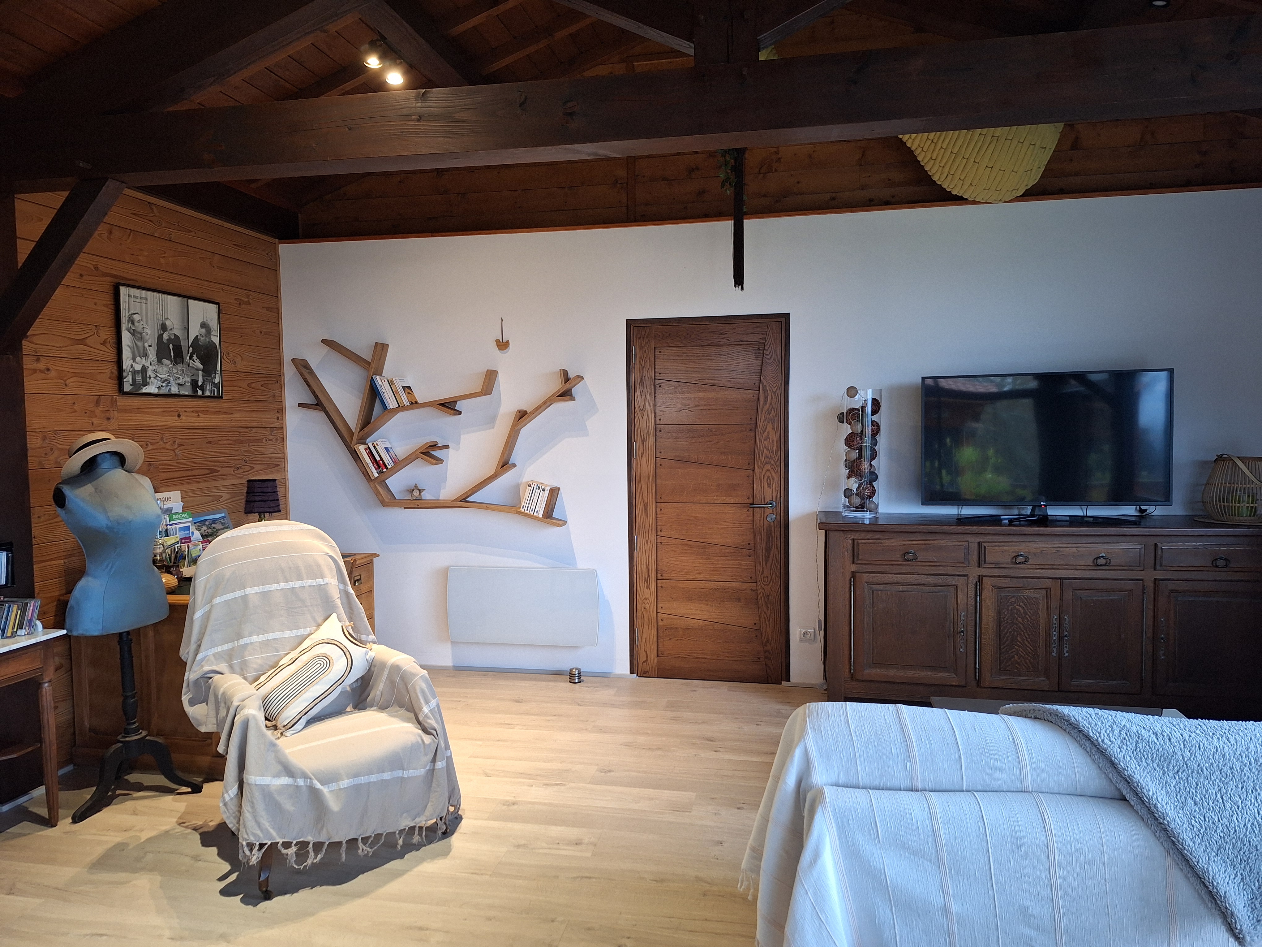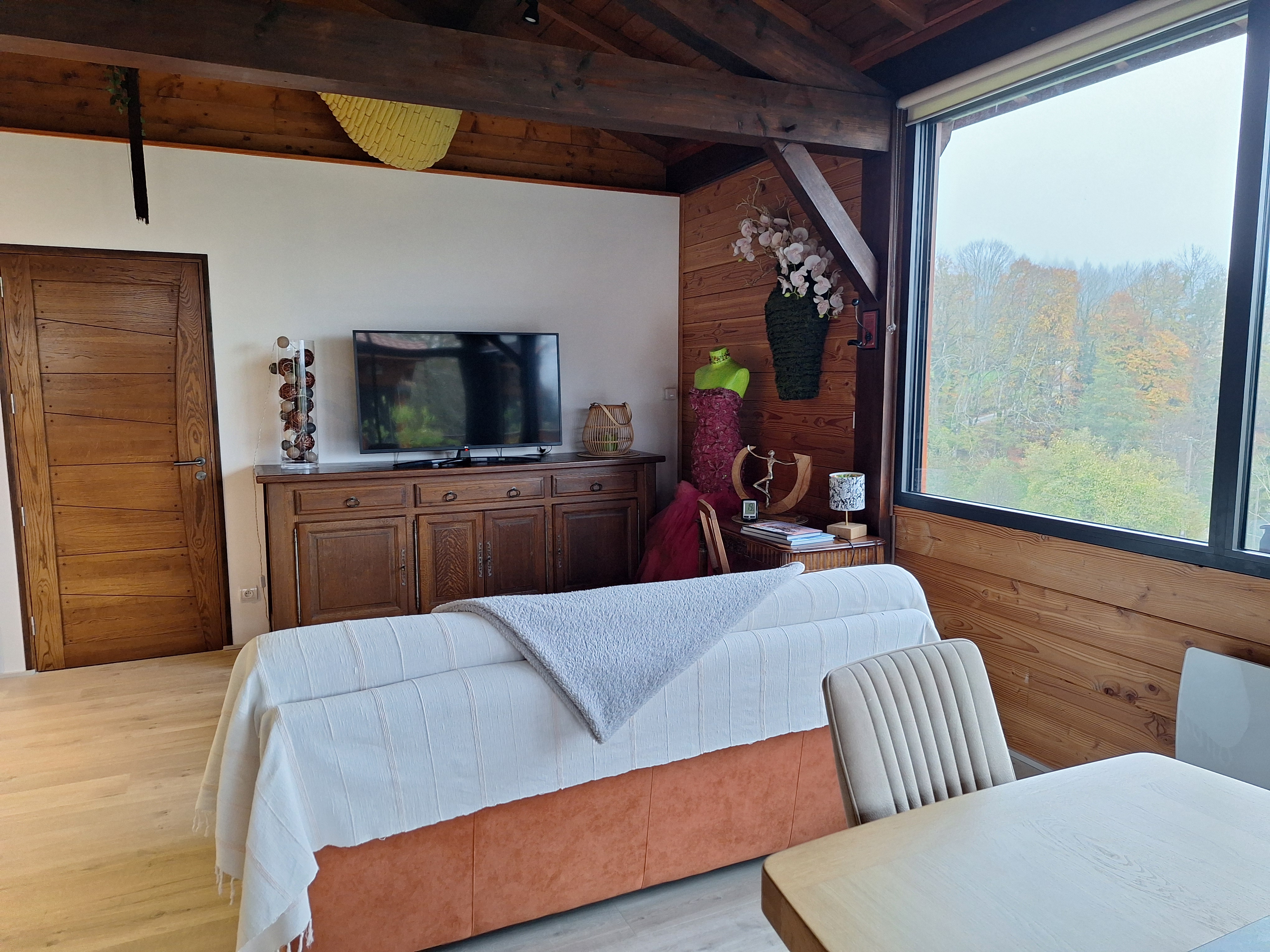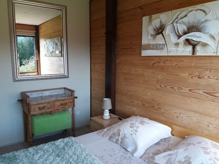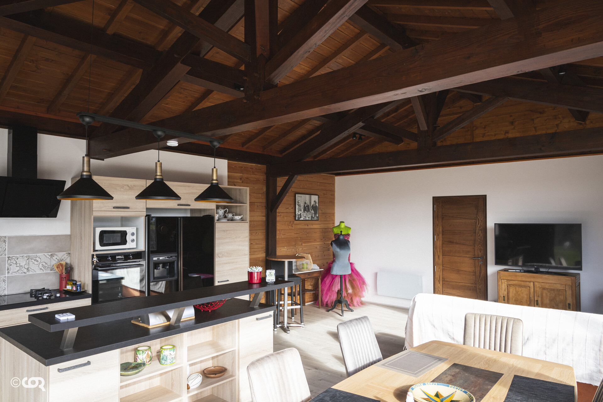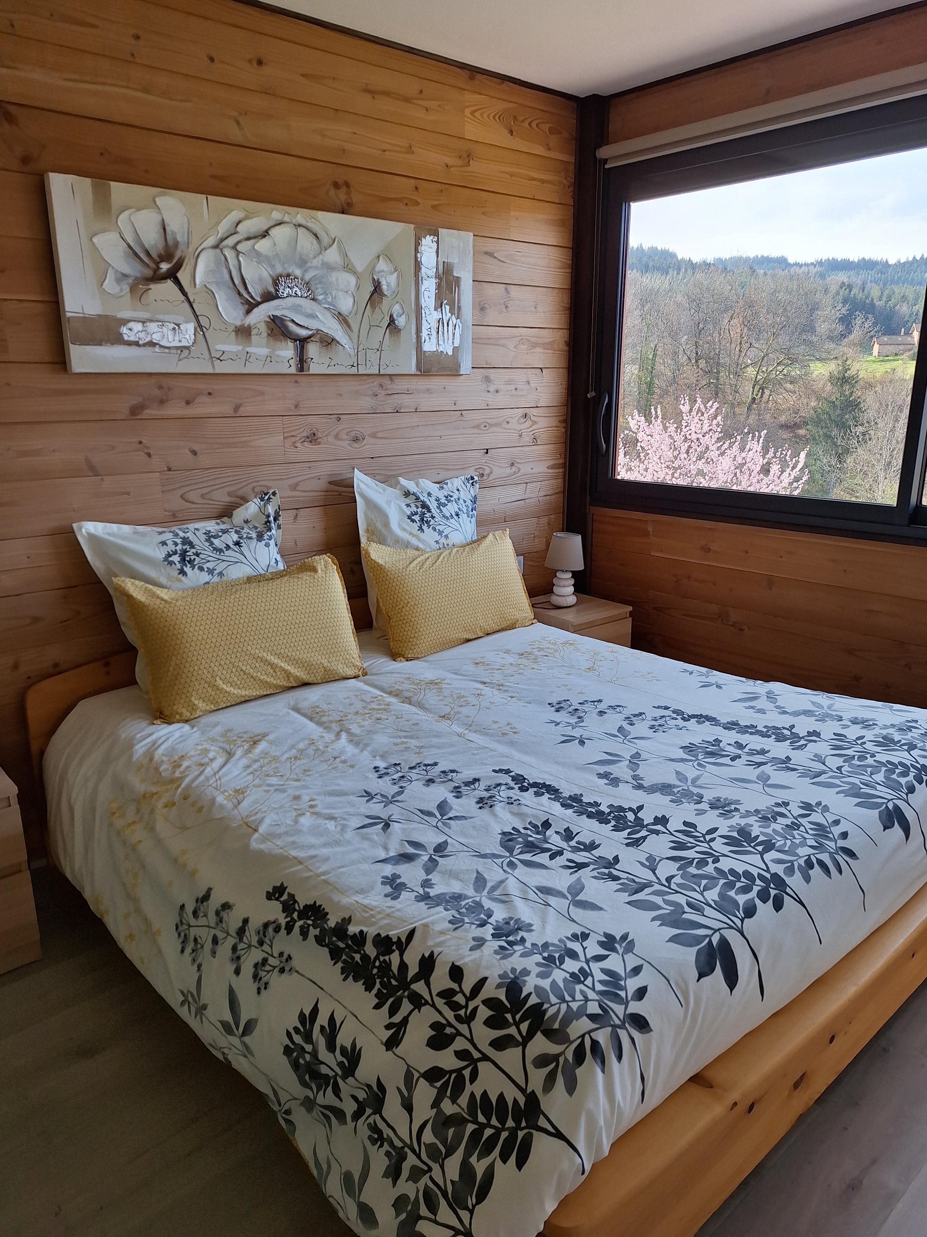 Vous apprécierez l'excellent confort de son intérieur alliant la modernité et le caractère chaleureux du bois. Grande pièce de vie, claire et fonctionnelle, donnant sur une terrasse en bois avec vue sur notre belle campagne. Cette pièce de vie est équipée d'un espace cuisine et d'un coin salon. La chambre est une suite parentale, lit de 160/200, possibilité d'ajouter un lit bébé sur demande.