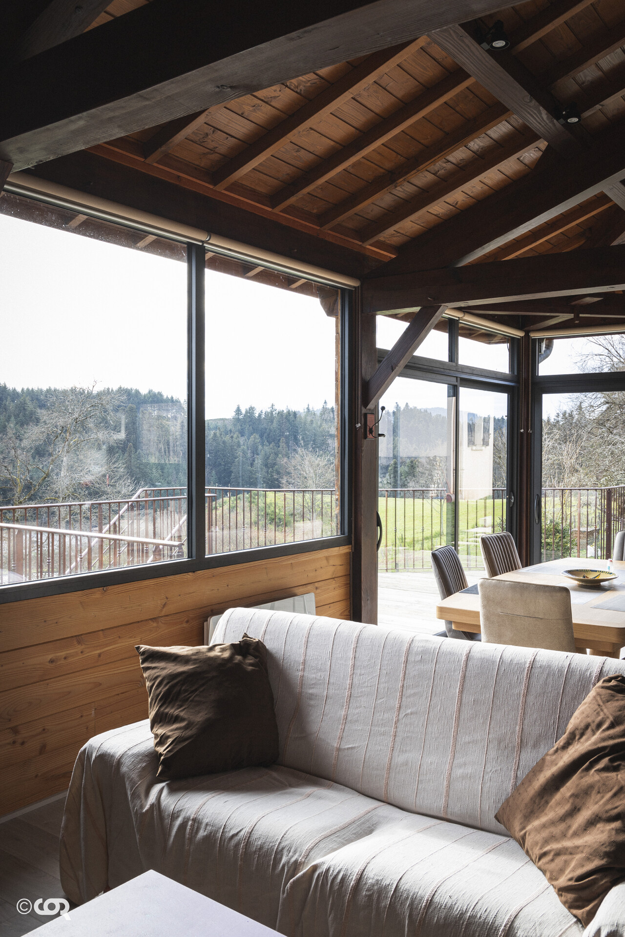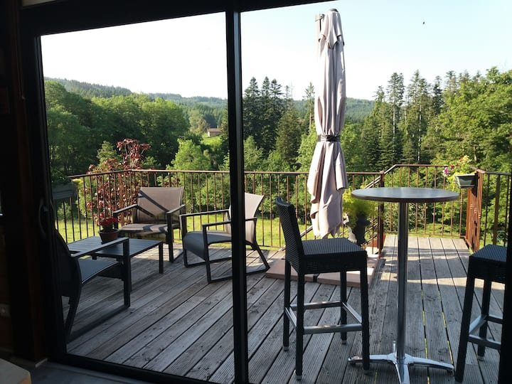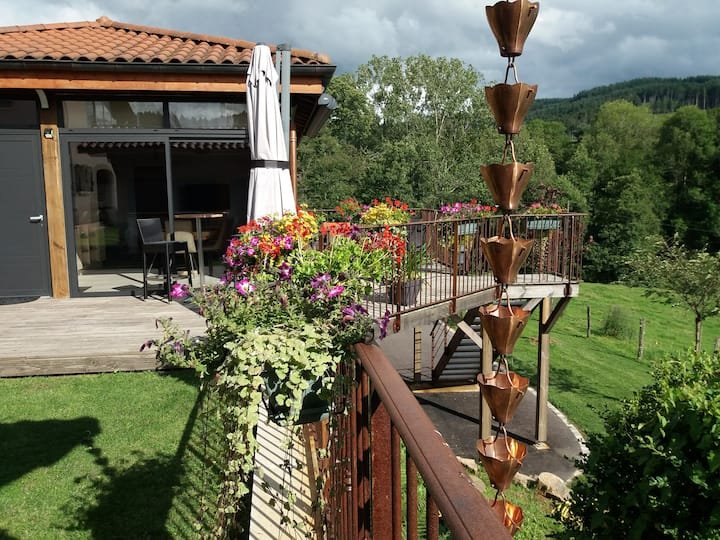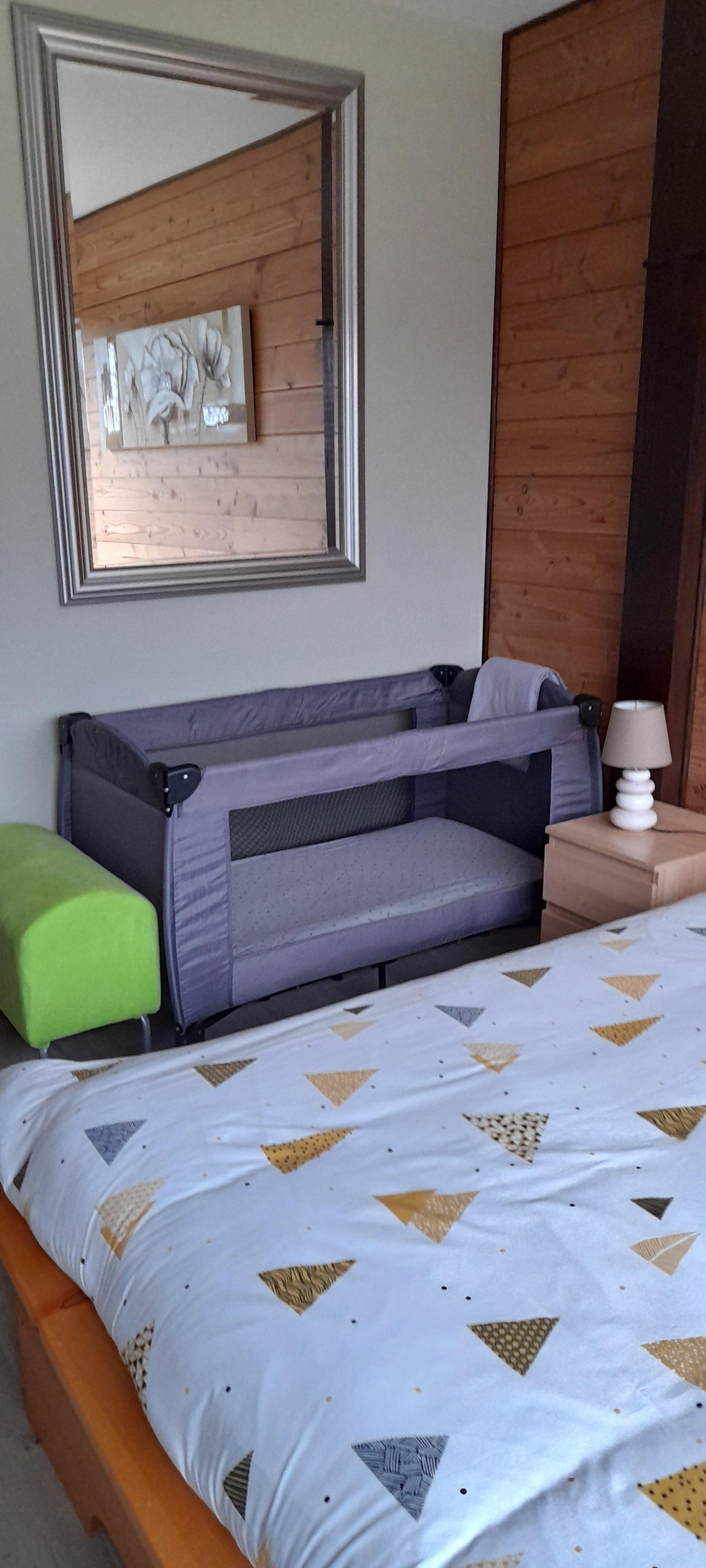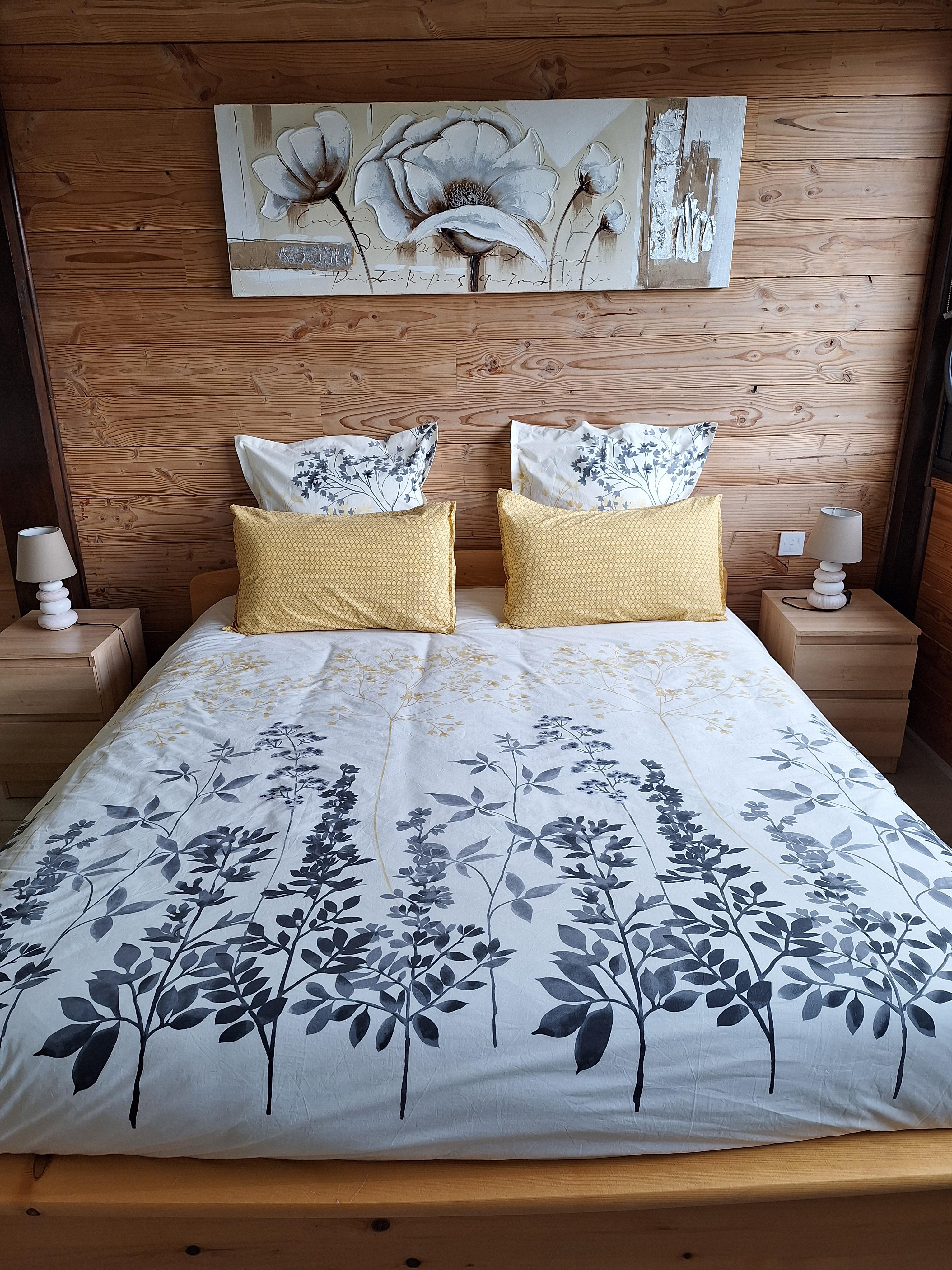 Vous apprécierez l'excellent confort de son intérieur alliant la modernité et le caractère chaleureux du bois. Grande pièce de vie, claire et fonctionnelle, donnant sur une terrasse en bois avec vue sur notre belle campagne. Cette pièce de vie est équipée d'un espace cuisine et d'un coin salon. La chambre est une suite parentale, lit de 160/200, possibilité d'ajouter un lit bébé sur demande.