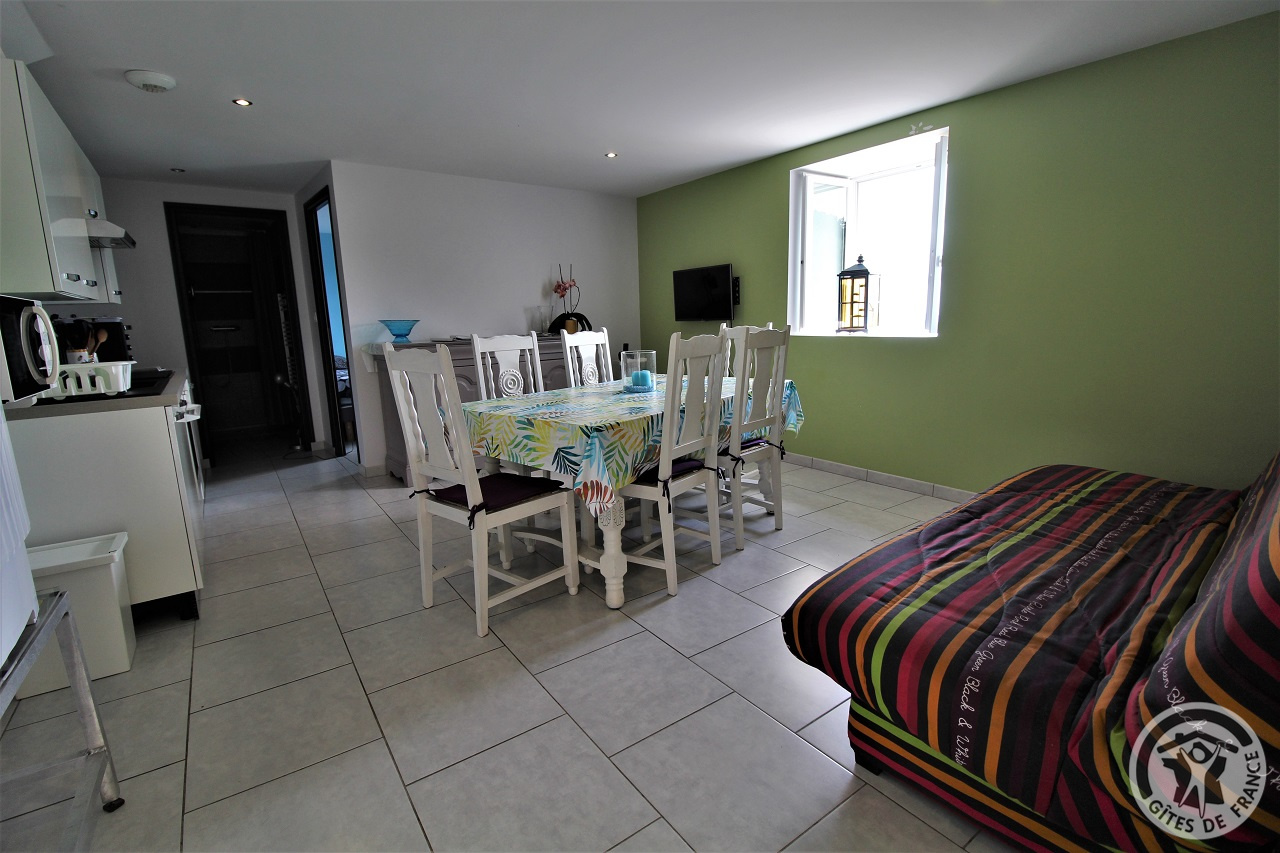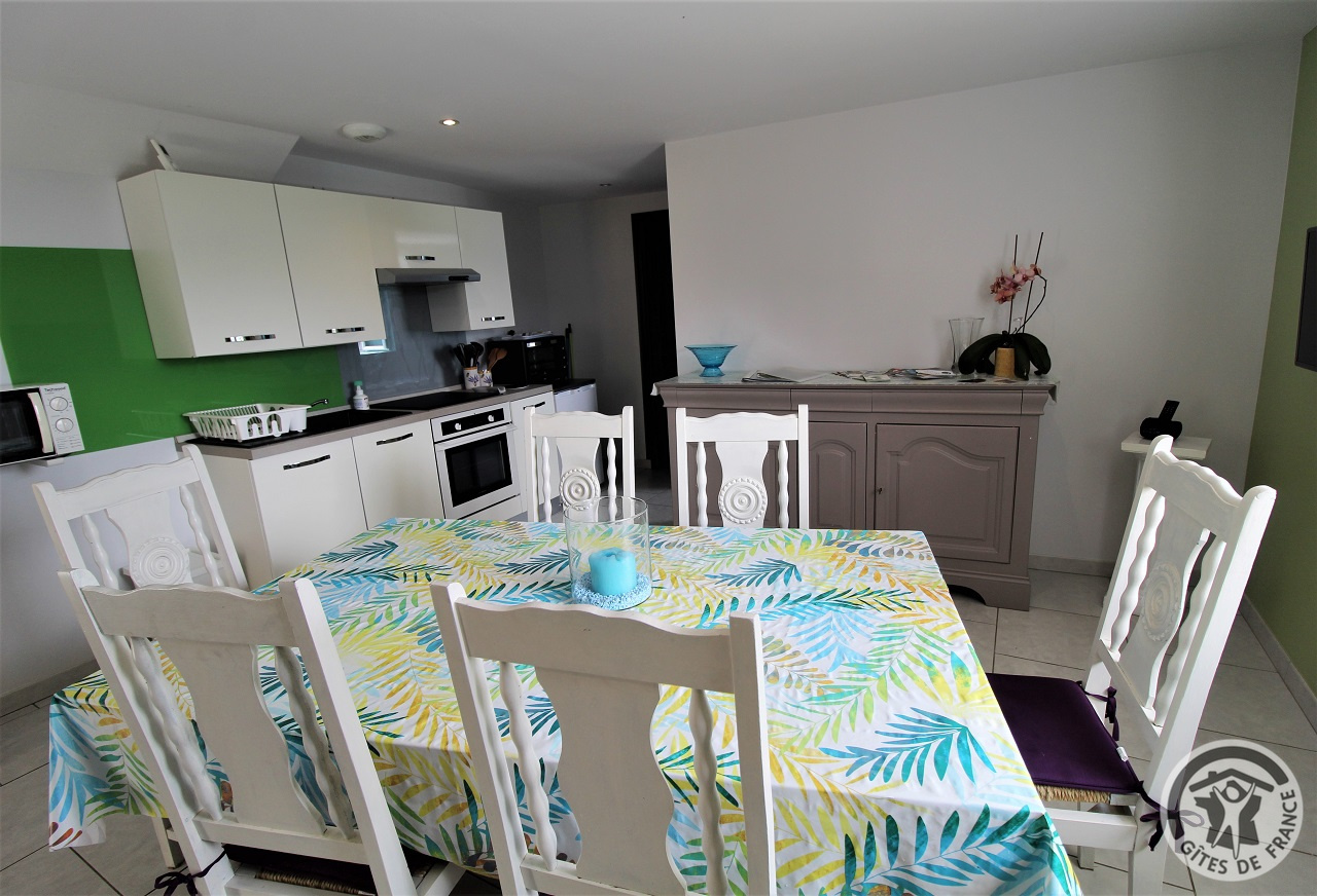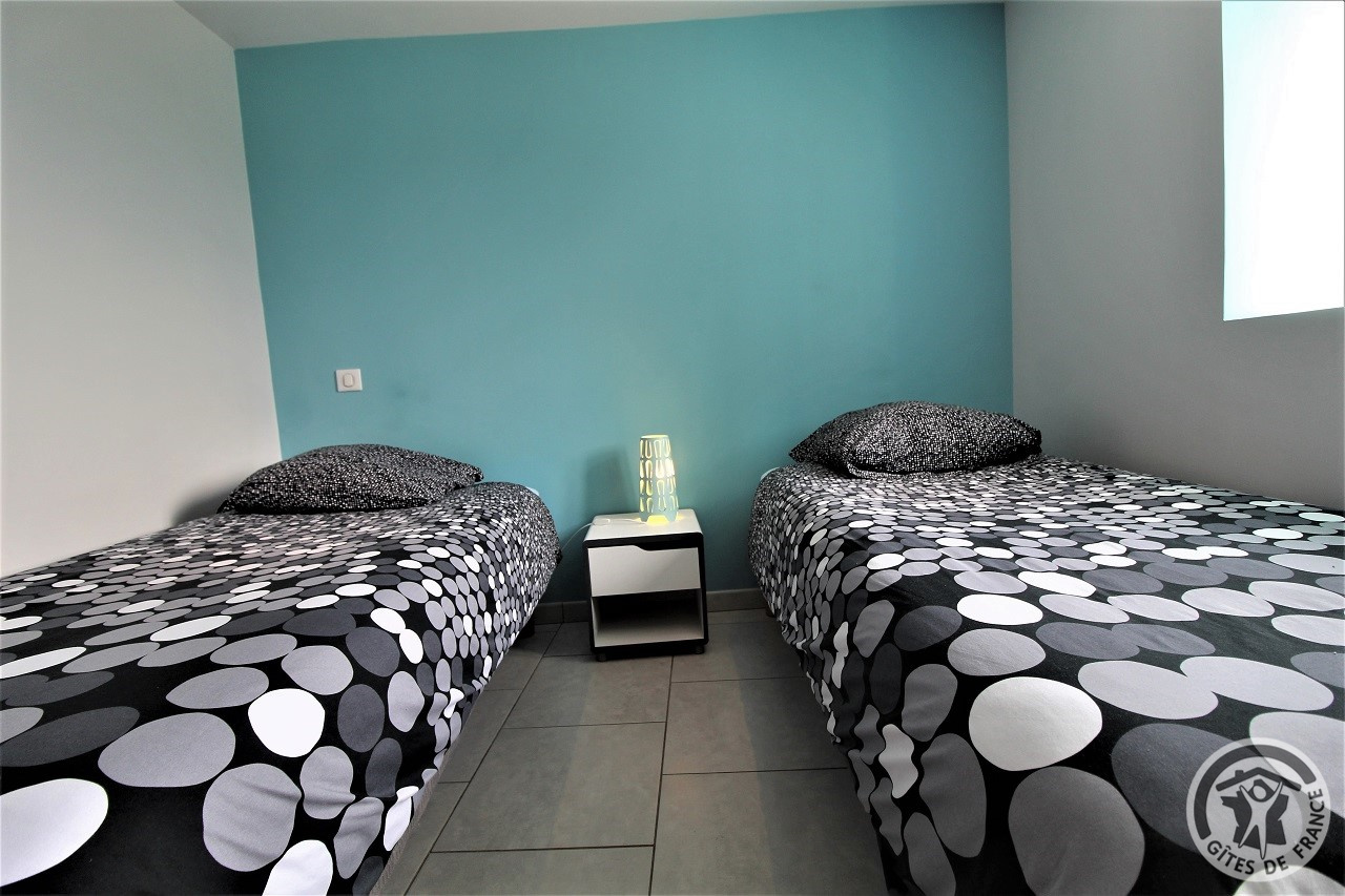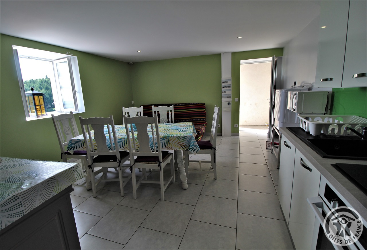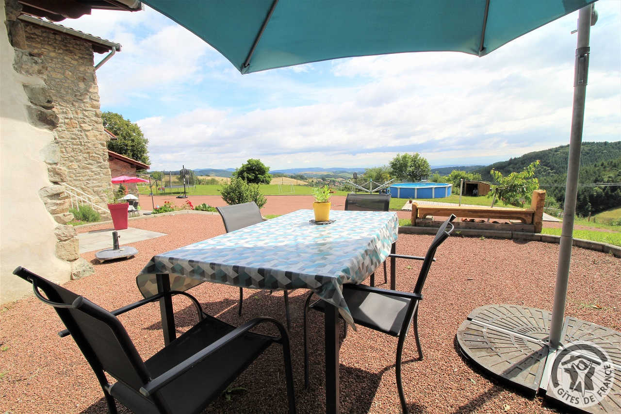 A proximité de Tarare, cette grande maison en pierre (bâtiment classé) située en pleine nature, sur les hauteurs d'un petit village, comporte 3 gîtes et le logement des propriétaires. Accès indépendant pour chacun des logements. Le gîte Mont Blanc est à l'étage (escalier extérieur, petit palier avec jolie vue). Entrée dans pièce de jour avec coin-cuisine, coin-salon (canapé convertible 2 personnes), coin-repas. 1 chambre (2 lits 1 personne), salle d'eau incluant Wc. Terrasse privative dallée. Extérieurs communs : vaste terrain aménagé, cloturé et peut être fermé par un portail , avec jeux d'enfants (trampoline, portique, panier de basket), et petite piscine hors sol, sans compter une vue magnifique sur le village et les monts du Lyonnais, cour, grand parking. Les 3 gîtes peuvent être loués ensemble pour un regroupement familial (capacité 12/14 personnes).