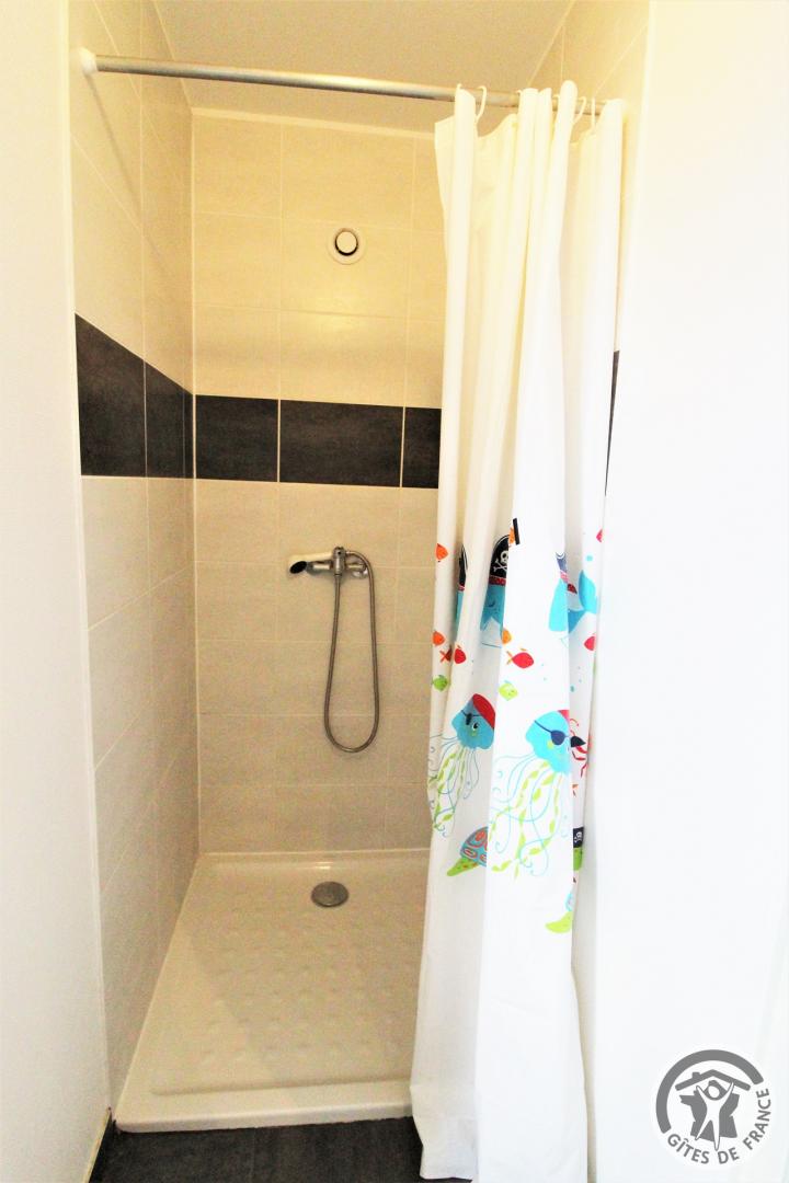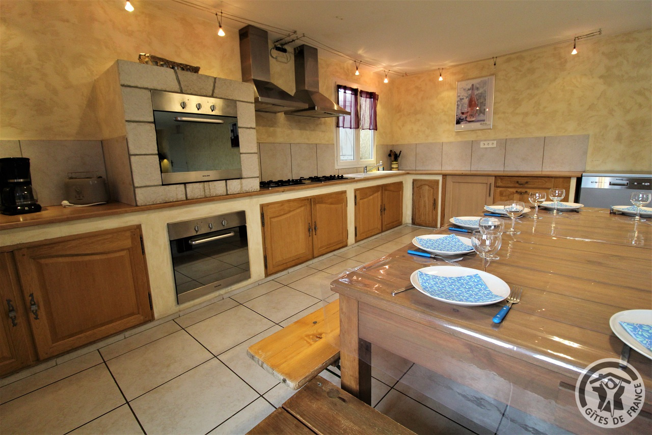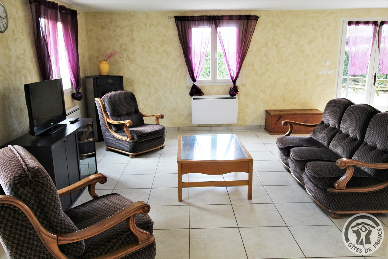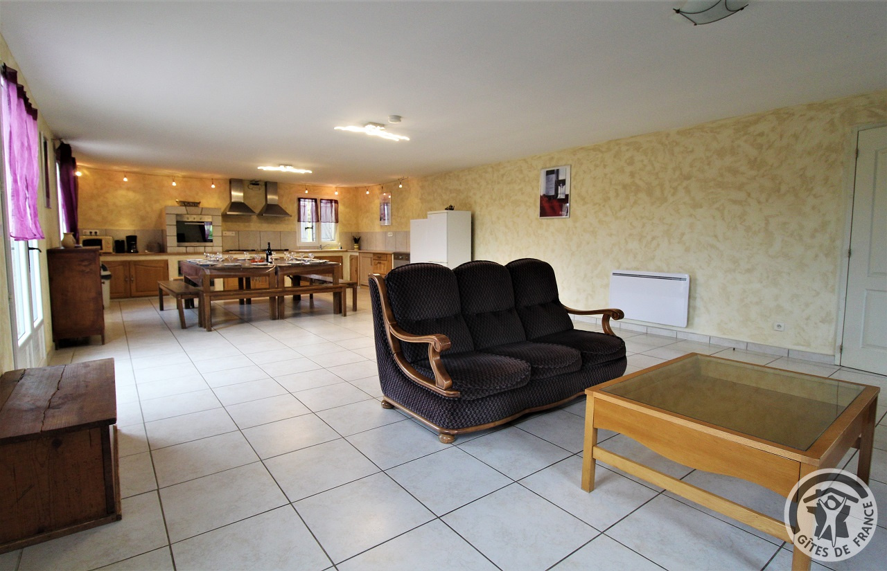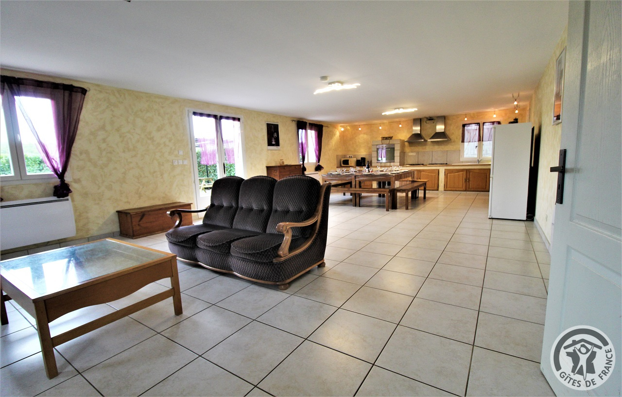 A l'extérieur : terrain aménagé clos, pelouse avec salon de jardin couvert. Vaste terrain non clos pour parking et jeux. Idéal pour un regroupement familial. Convient aussi pour la clientèle individuelle (à la nuitée uniquement en semaine).