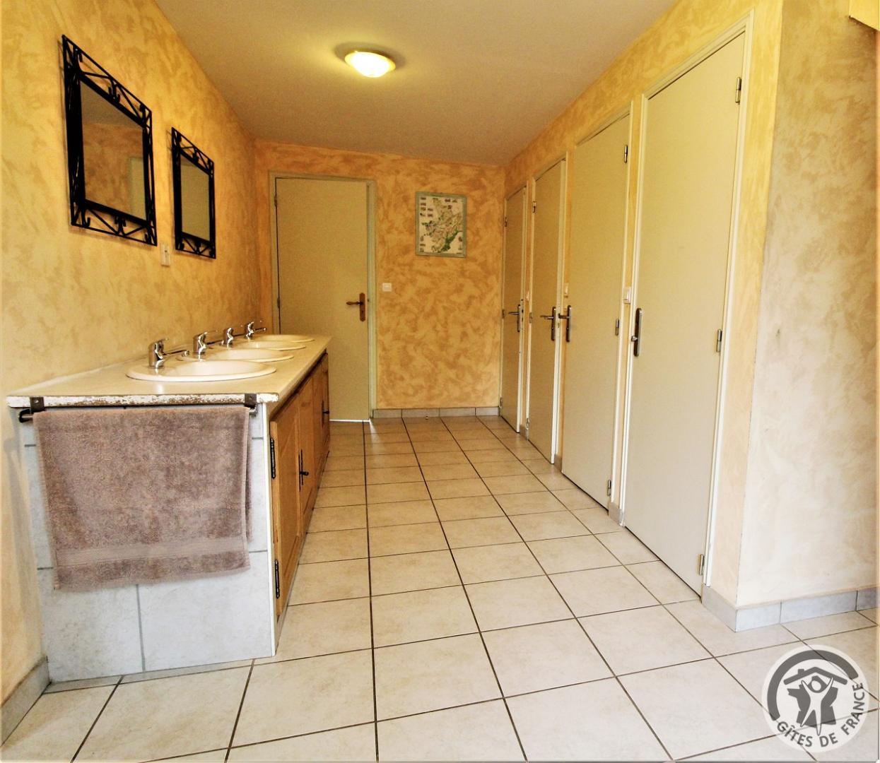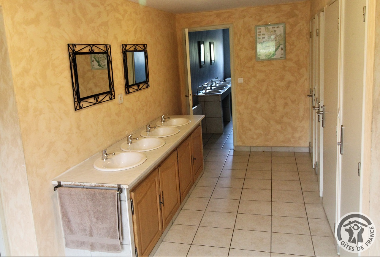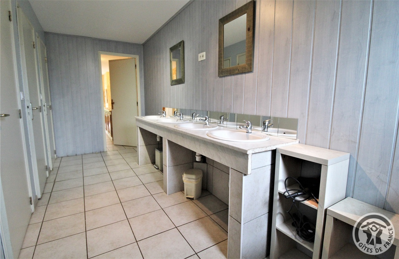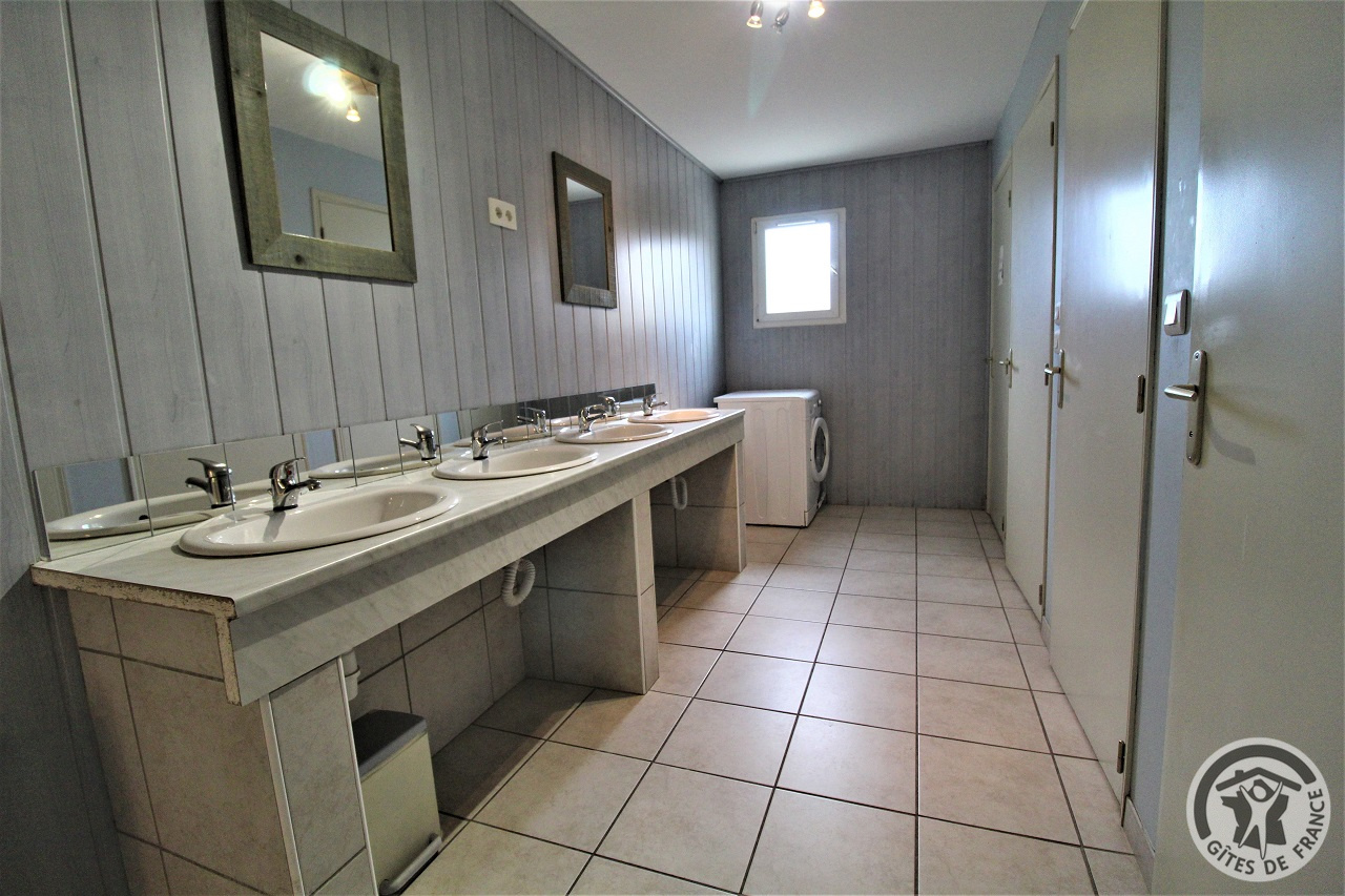 Rez-de-chaussée : vaste pièce de jour (66 m2), coin-cuisine, coin-salon (poêle à bois), sanitaires ( 3 wc, 4 douches, 8 lavabos), lave linge et local technique.