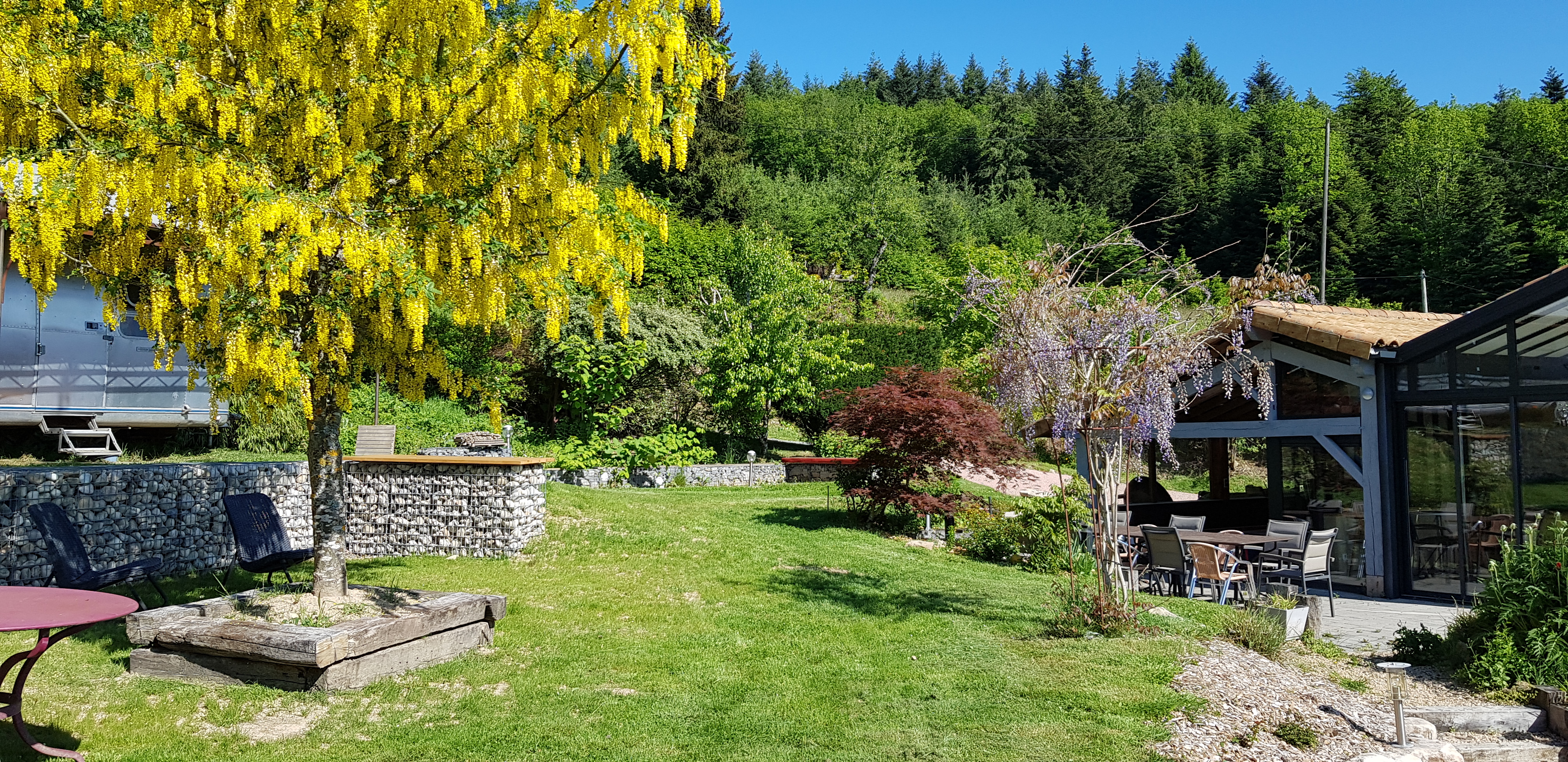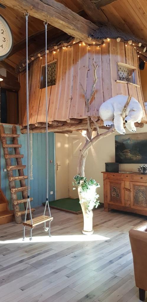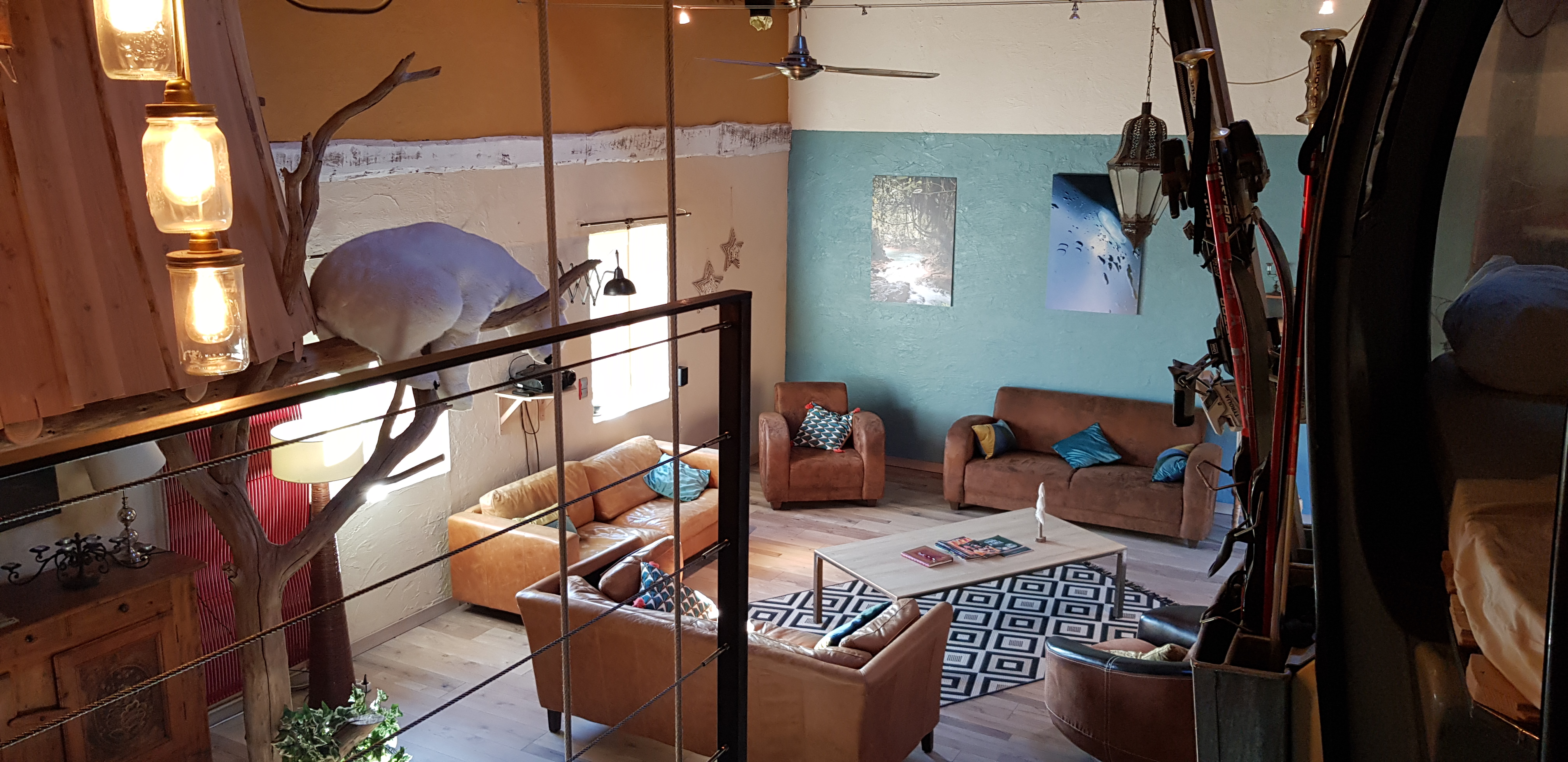 Gîte de groupe ( 20 personnes maximum) original comprenant deux chambres atypiques indoor : une cabane suspendue et une télécabine POMA, ainsi qu'à l’extérieur : 2 caravanes américaines Airstream.