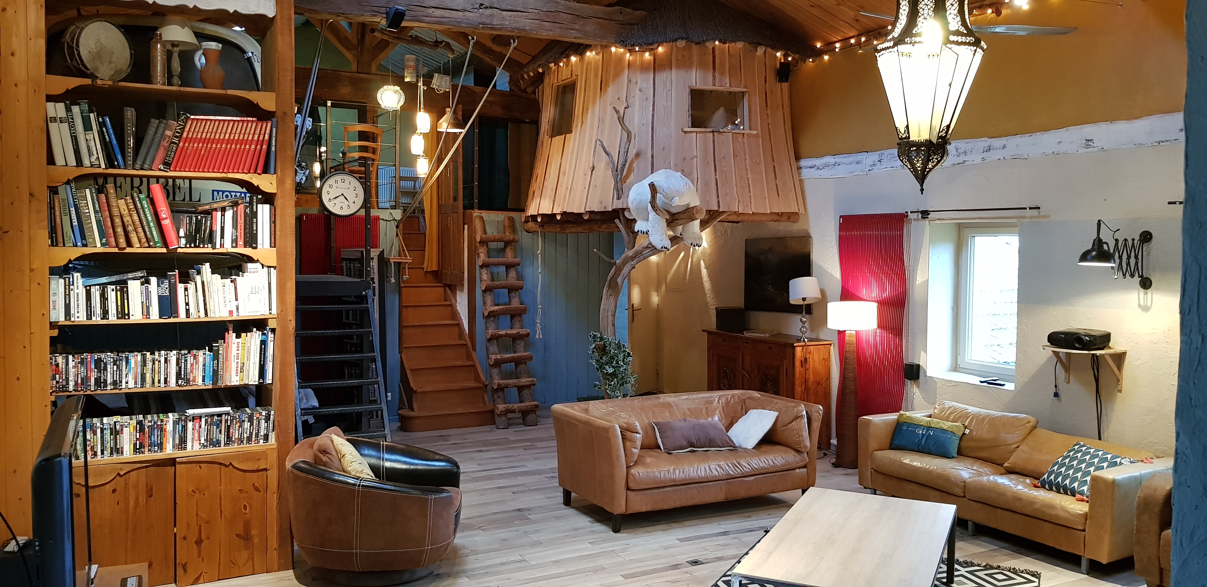 Le vaste salon est équipé d'une bibliothèque, vidéothèque, d'un home cinéma, une baby foot, et de confortable canapés pour vous instaler.