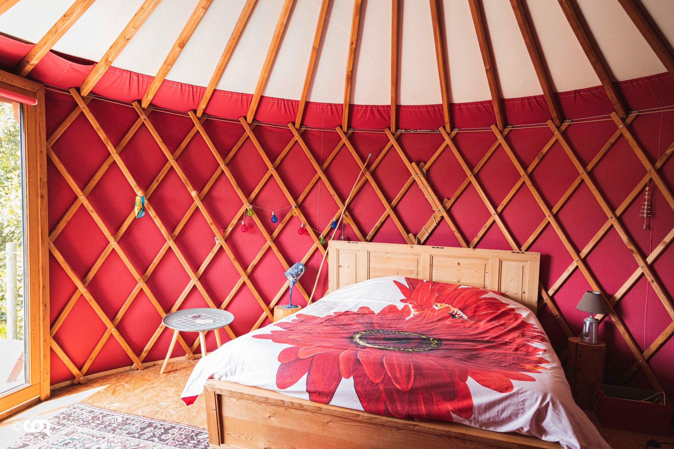 Yourte de 20 m² sur terrasse en bois, aménagée avec un grand lit (2 personnes) et 2 lits d'appoints (1 personne).