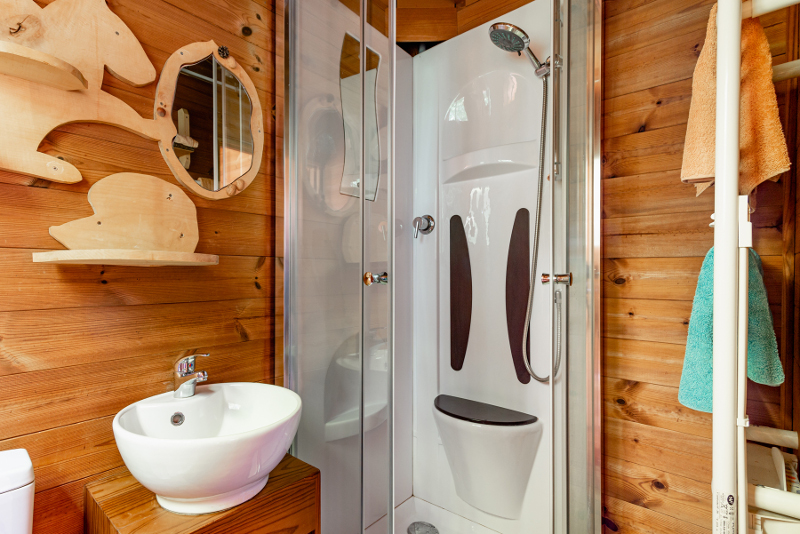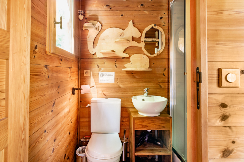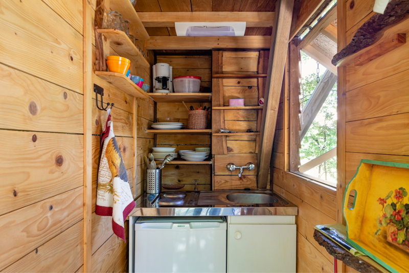 Dans la cabane perchée : terrasse privative sous la cabane avec table et chaises, terrasse de la cabane avec table et chaises longues, barbecue. 1 lit principal en 140, en mezzanine 2 à 3 couchages de 80. Salle d'eau avec cabine douche, lavabo, wc, sèche serviettes, sèche cheveux. Cuisine : réfrigérateur, plaques de cuisson électriques, évier, cafetière, bouilloire, vaisselle. Vaste jardin en terrasse, piscine, terrain de boules et espace pour enfants.