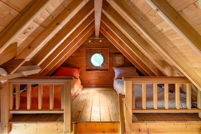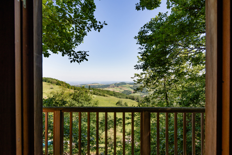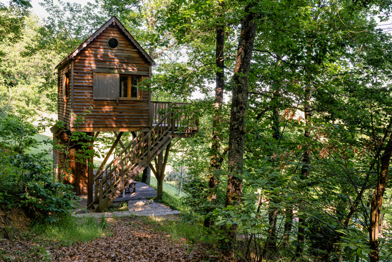 Le lieu est campagnard, la décoration privilégie les artistes locaux. Une cabane perchée, le rêve de Bertrand qu'il a réalisée lui-même vous accueille à flanc de colline, à la lisière du bois :