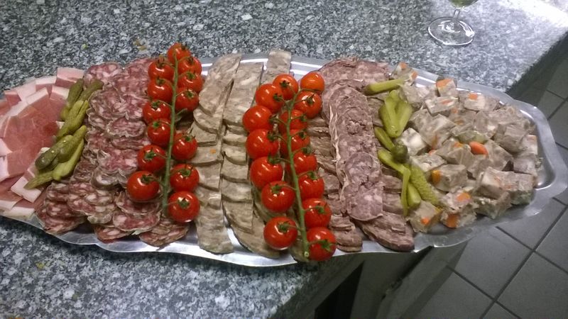 Volailles fermières, gâteau de foie, criques, charcuterie de campagne, omelettes, gratin de pommes de terre, desserts maison.