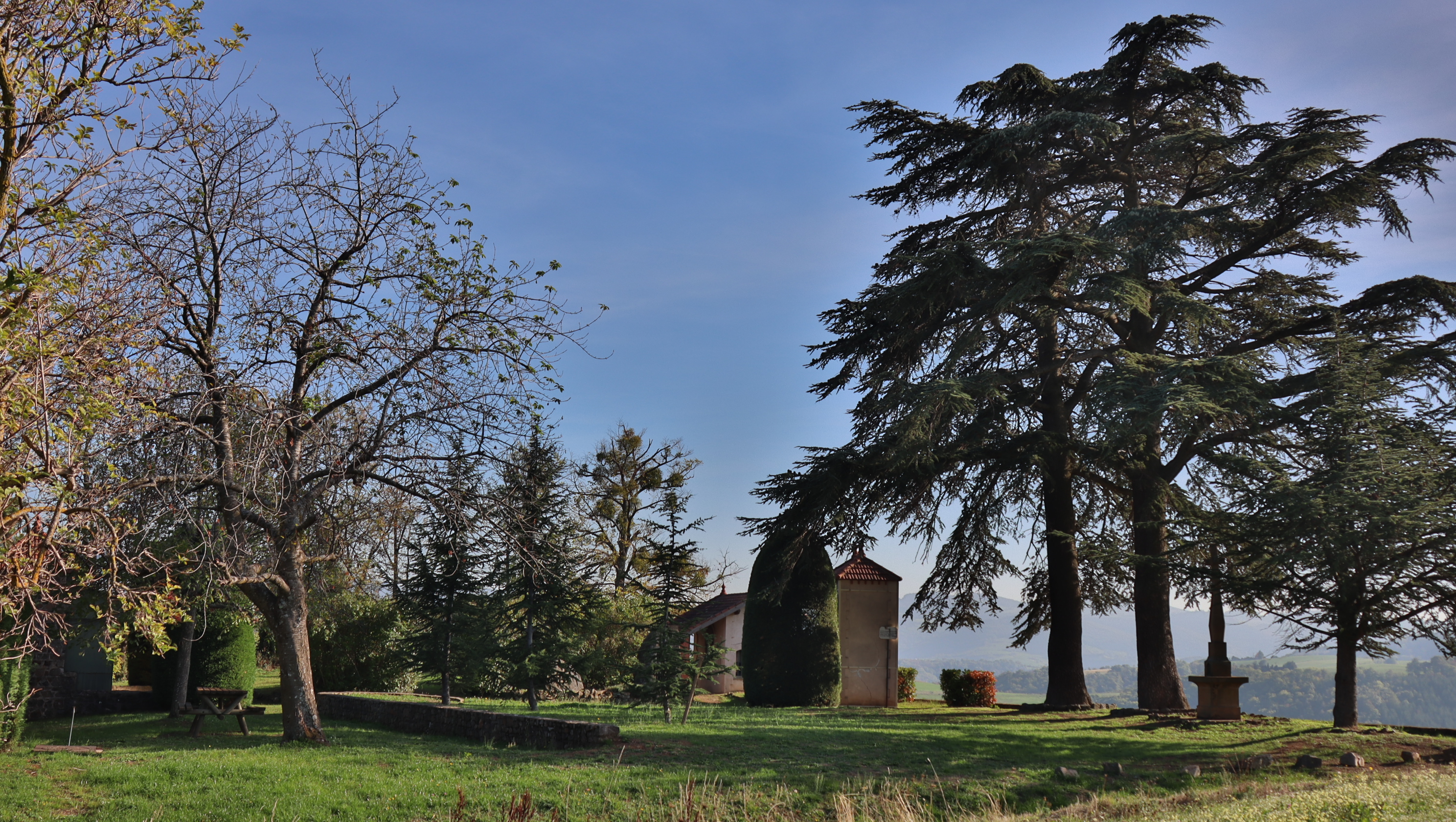 Très jolie aire de pique-nique ombragée et fleurie. Point de vue avec table d'orientation. Eau, toilettes, plusieurs tables en bois. Trois petites chapelles avec une histoire insolite expliquée sur des panneaux.