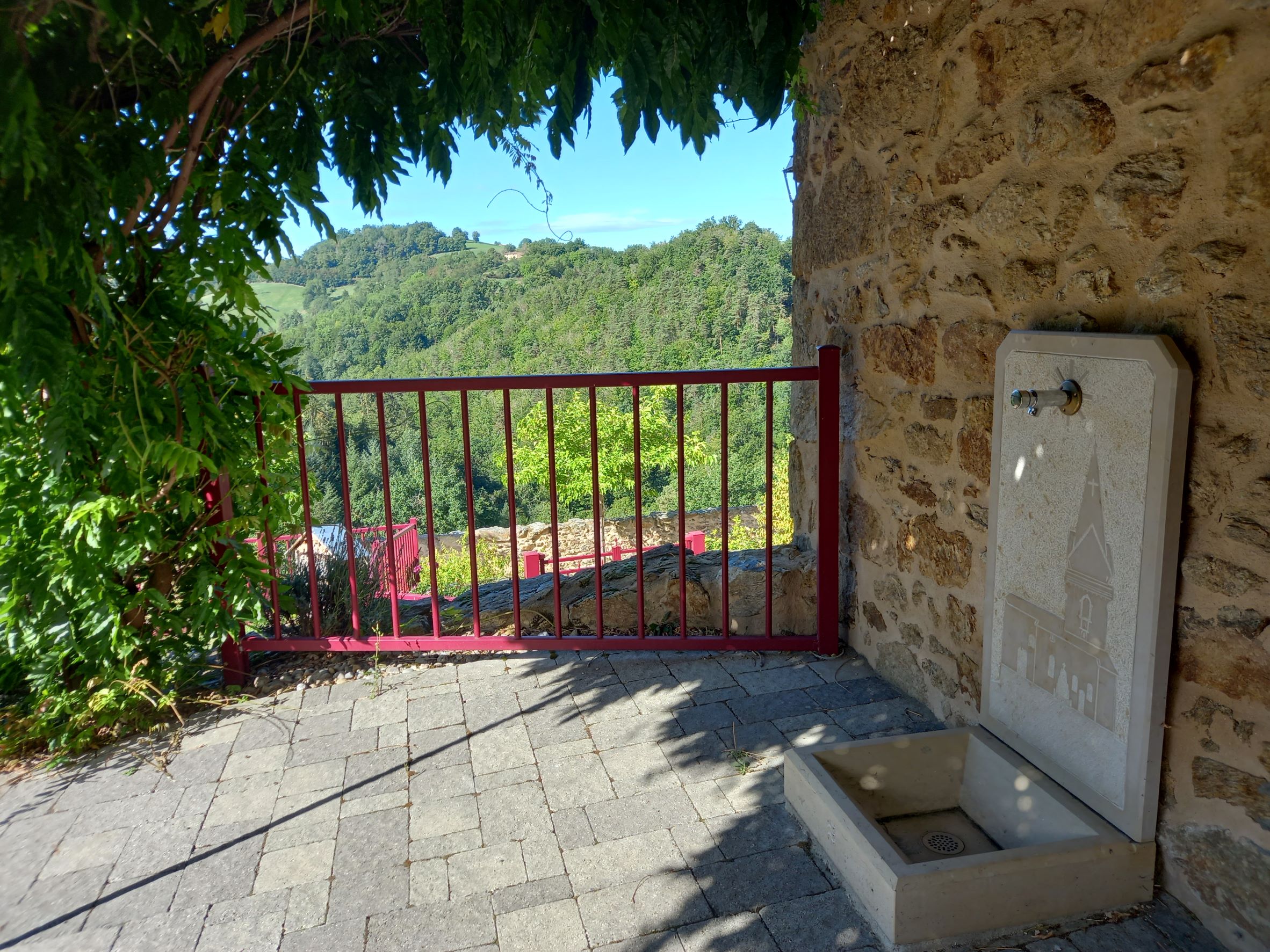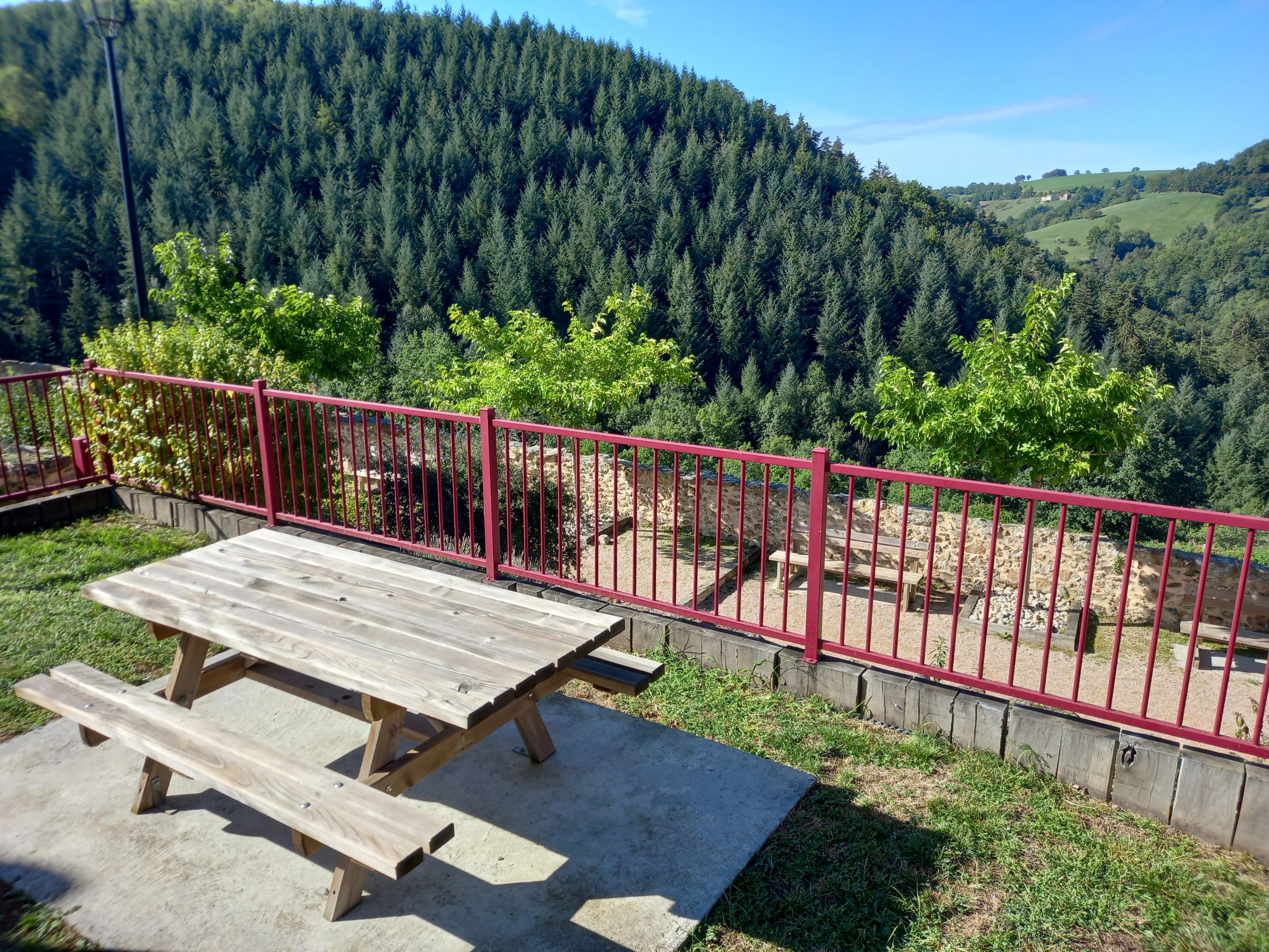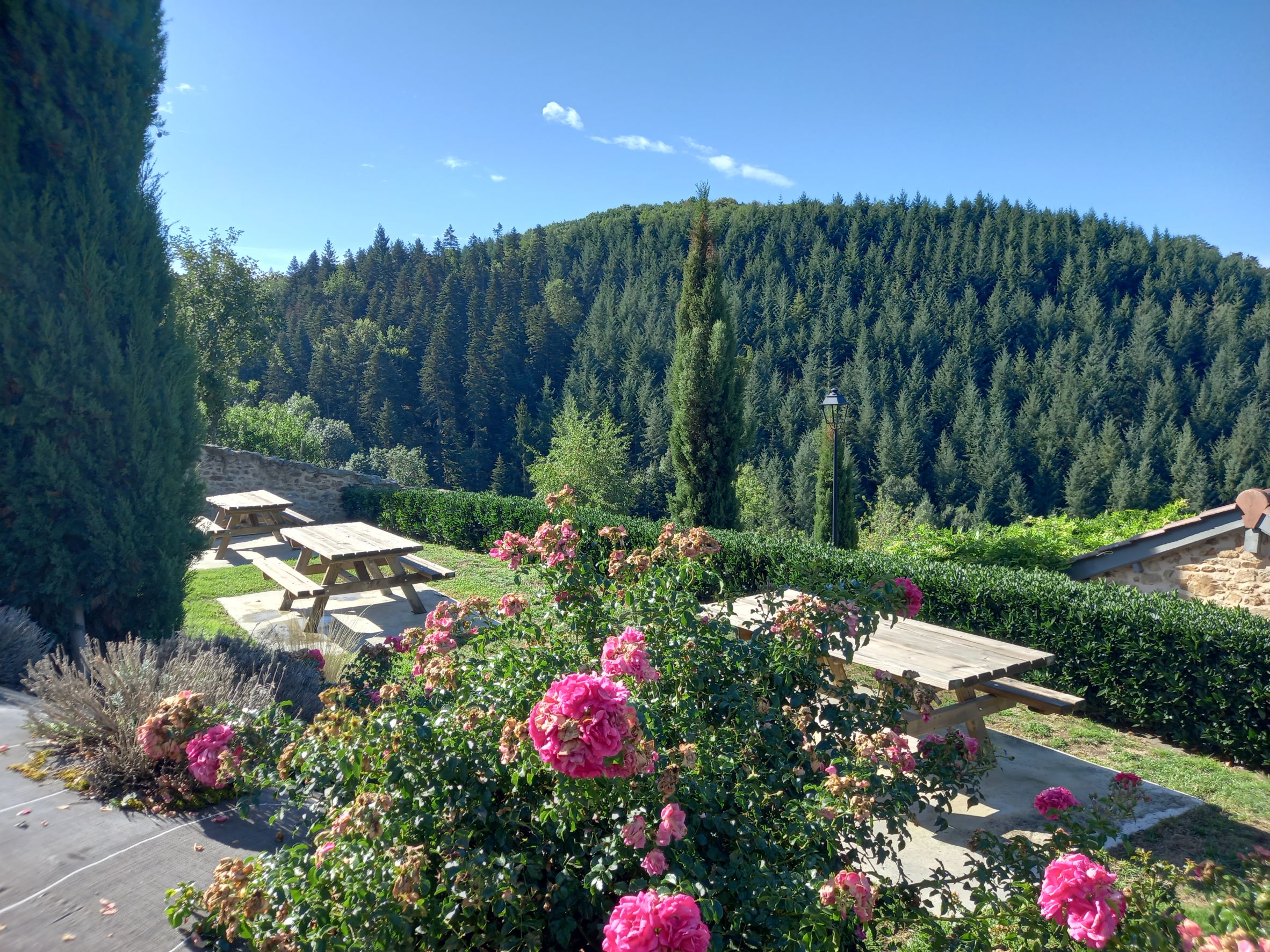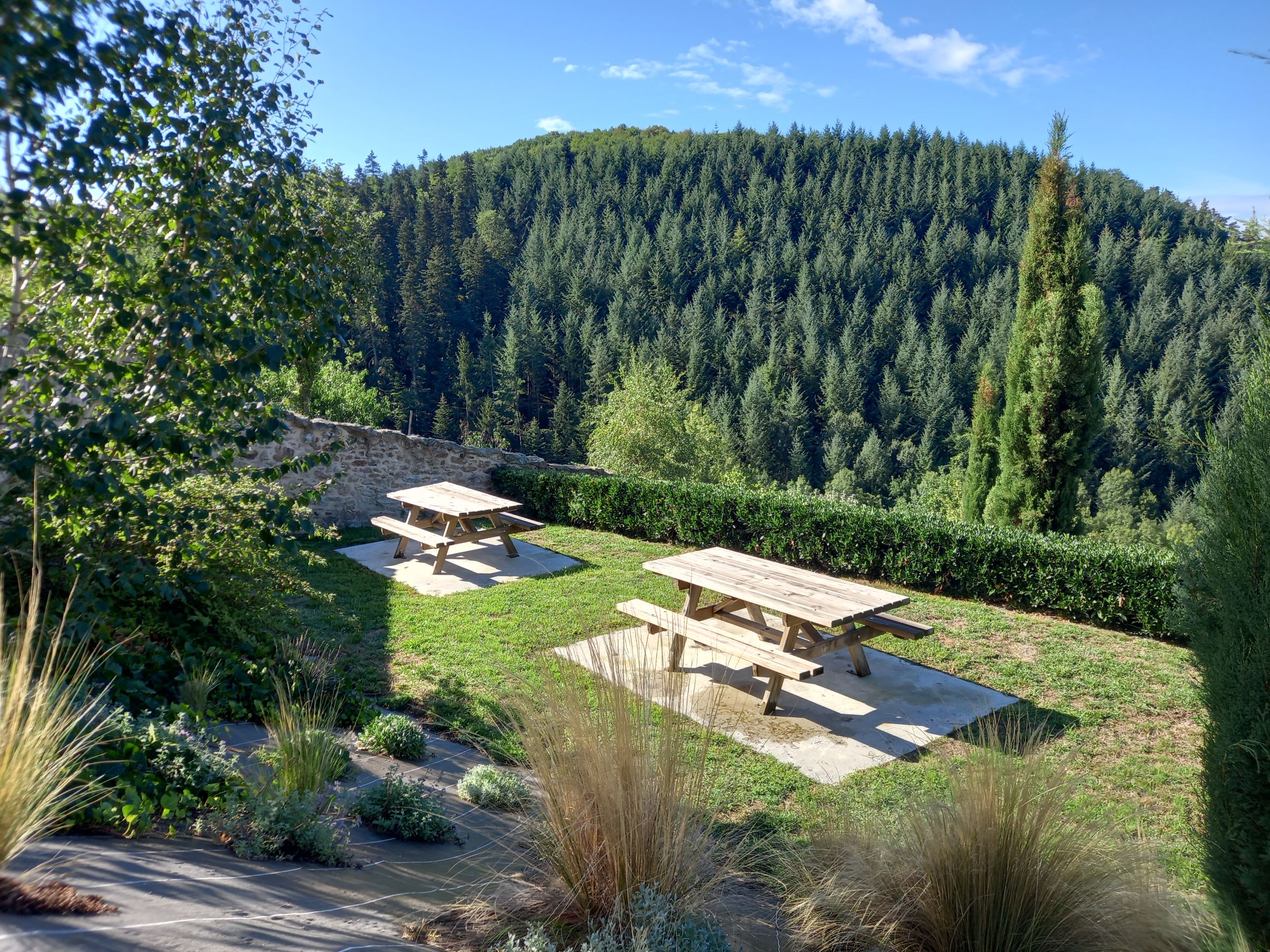 Charmant petit coin de verdure avec trois tables de pique-nique et des toilettes publiques.