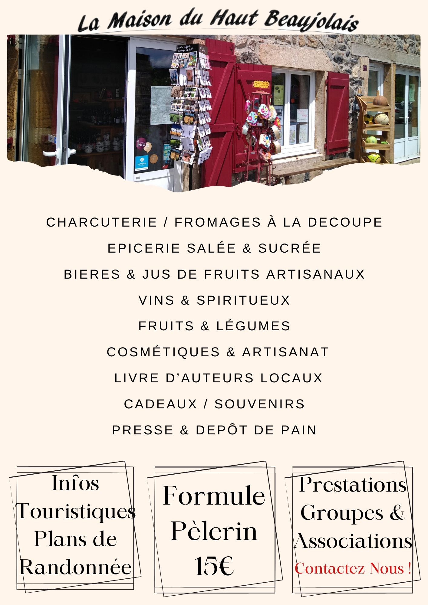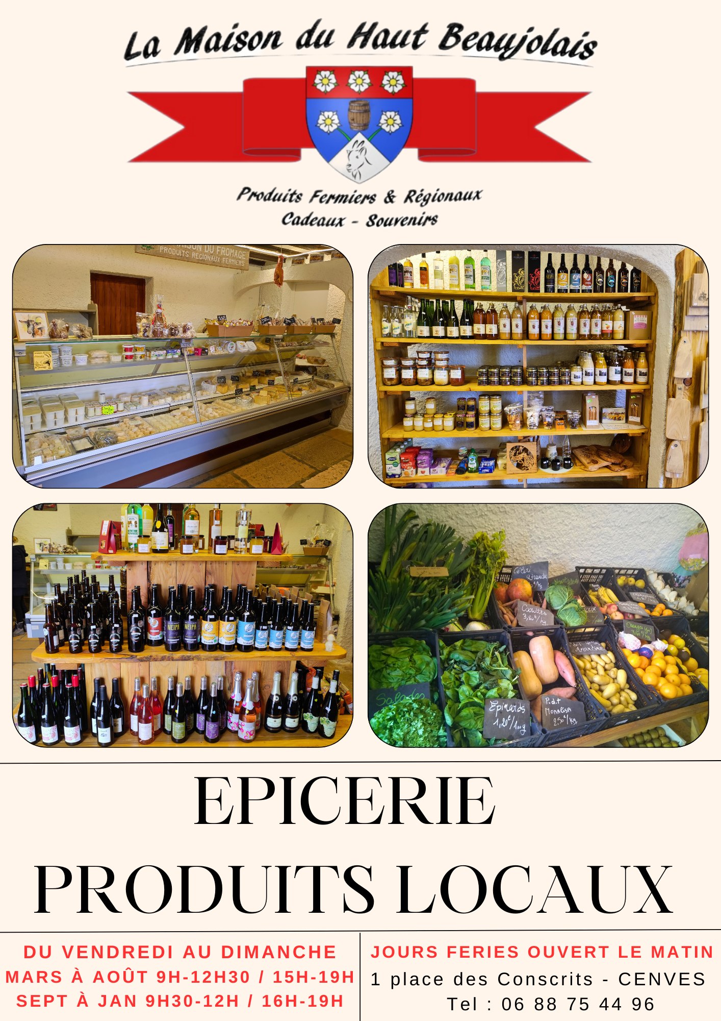 Vous retrouverez un large choix de produits frais de la crèmerie à la charcuterie en passant évidemment par un rayon « fromages », de Cenves mais pas que ! Des fruits et légumes, biscuits, confitures, miels, tisanes, cafés vous seront également proposés. Vous pourrez retrouver les vins de nos vignerons locaux et une gamme de bières, liqueurs et spiritueux. En plus des produits fermiers et régionaux, vous pourrez découvrir les bijoux, peintures, poteries, faïences et autres créations de nos artistes locaux. Un rayon vannerie et maroquinerie viendra également compléter cette gamme artisanale. Les touristes et les Cenvards y trouveront des plans et topoguides de la région ainsi que des objets souvenirs à l’effigie de notre terroir et de nos lieux pittoresques. «Nous souhaitons faire découvrir les savoir-faire locaux et les produits du Haut Beaujolais. »