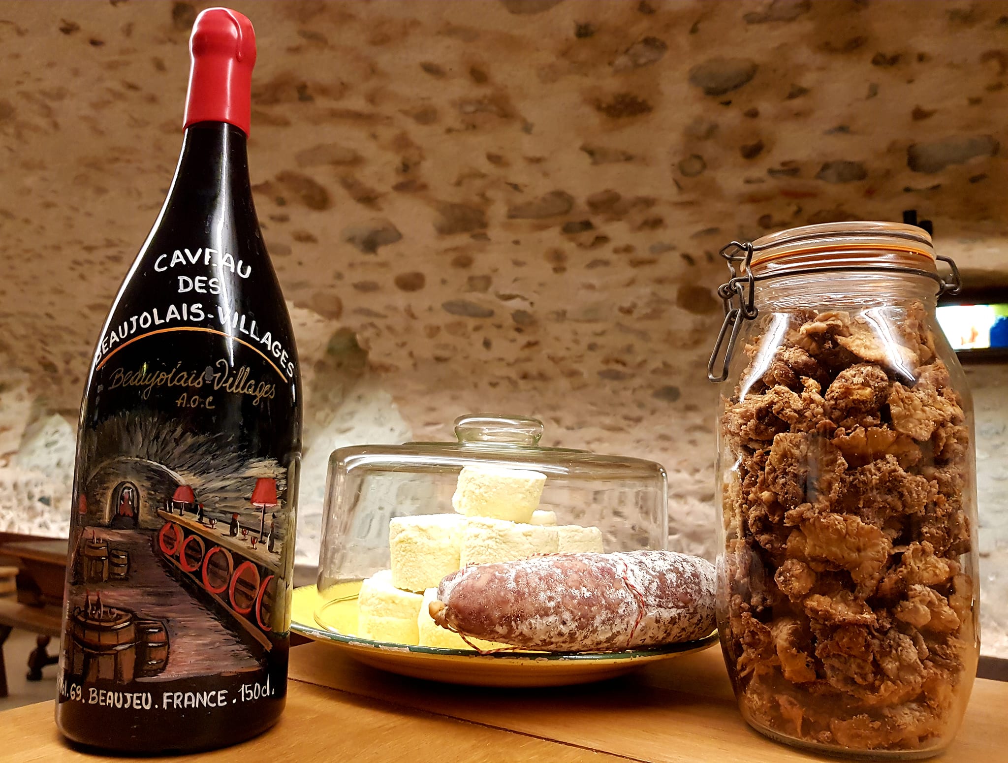 Beaujolais & Beaujolais-Villages rouges, rosés et blancs, Crus du Beaujolais et Crémants de Bourgogne. Vous pourrez accompagner votre dégustation par des fromages fermiers, de chèvre ou de vache, et des grattons et saucisson produits localement.