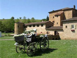 Château du Moyen-Age en pierres dorées, grande cheminée, parc et parking