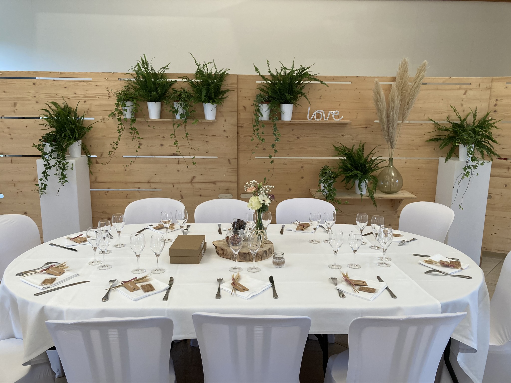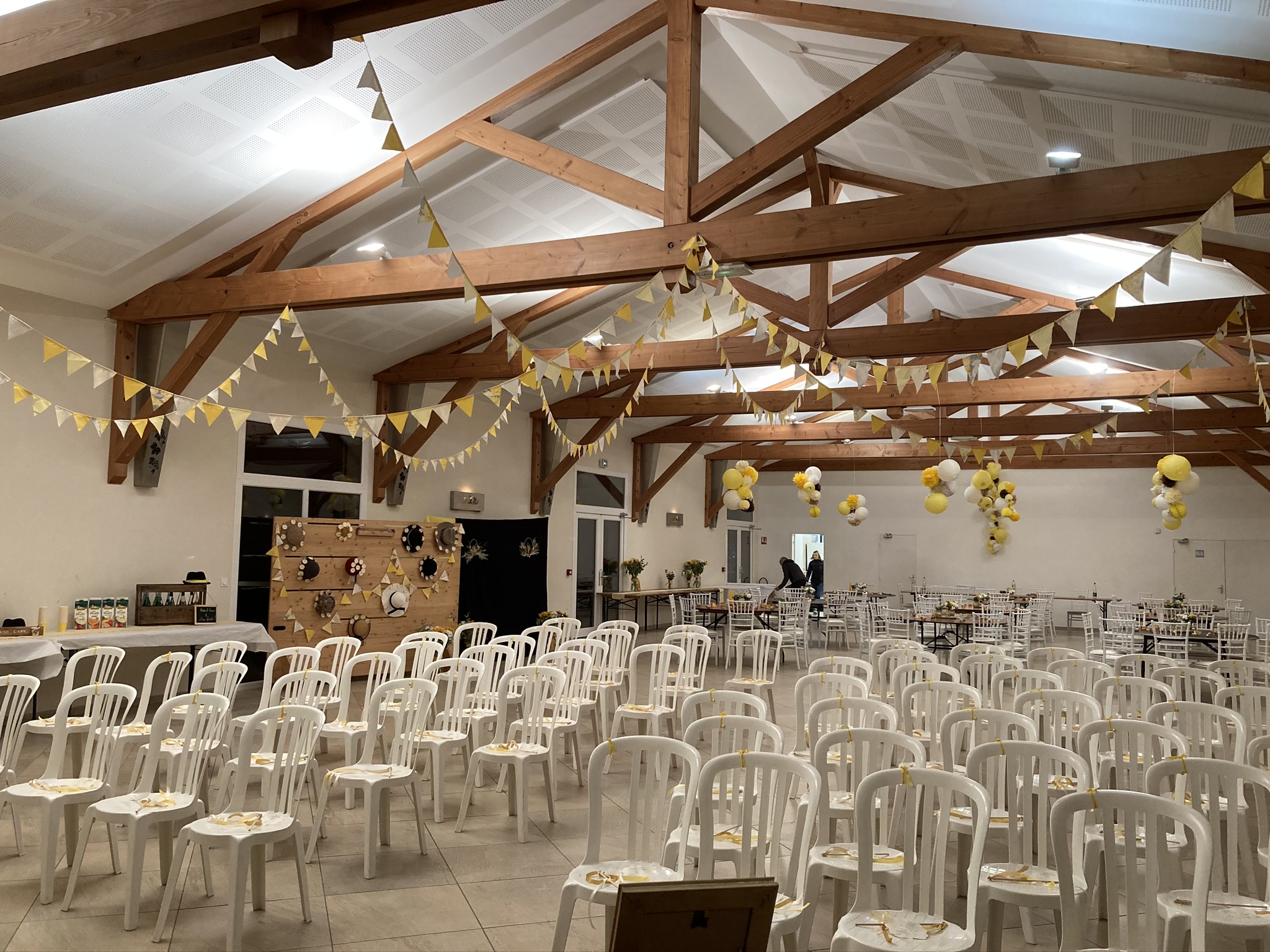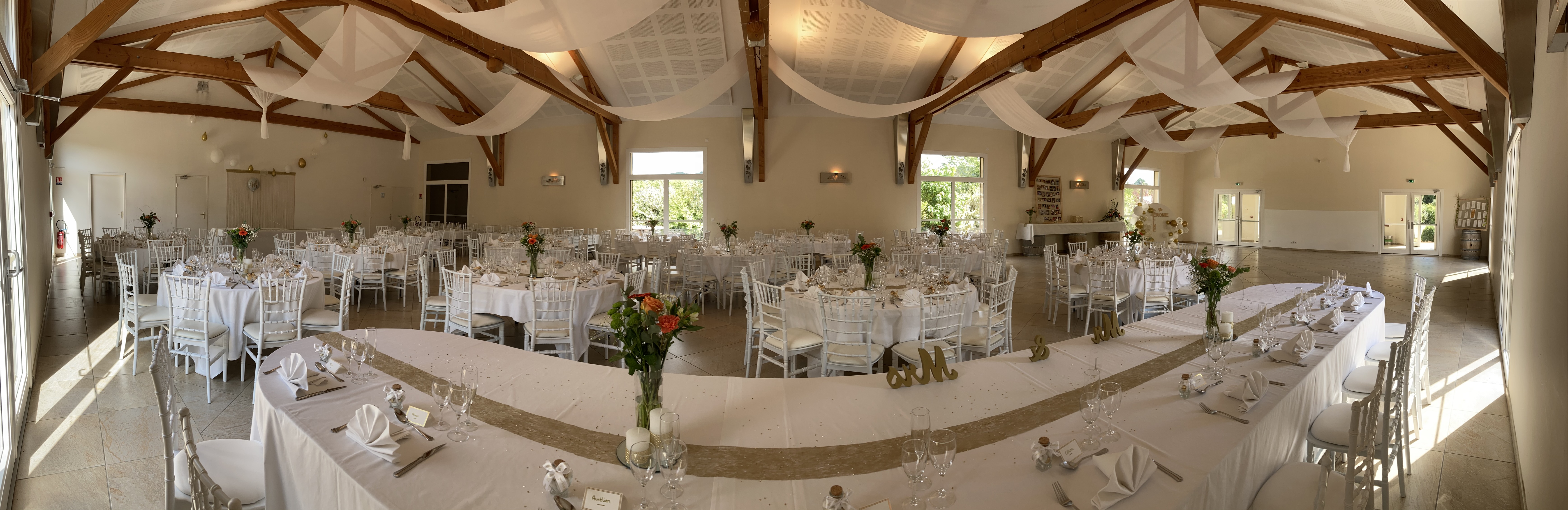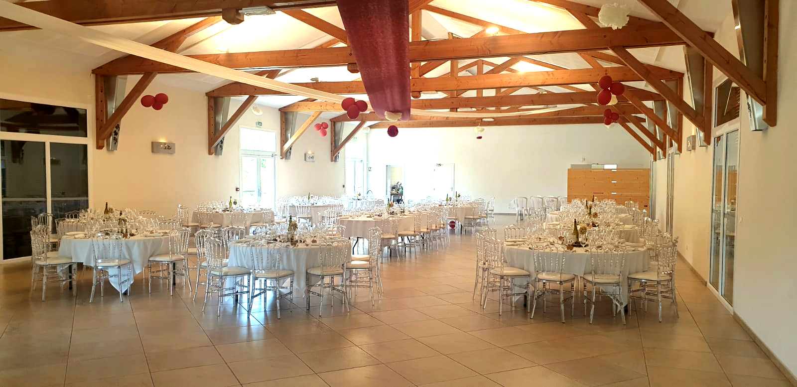 La grande salle peut accueillir 300 personnes (salle modulable) en repas assis avec une piste de danse et plus en cocktail debout. Les chaises et tables (rondes, ovales ou banquet) sont comprises dans la location ainsi que le nettoyage. Nous vous laissons libre choix du traiteur, mais pouvons toutefois vous fournir une liste de partenaires locaux et de qualité. La salle dotée d'une parfaite acoustique, sera climatisée ou chauffée en fonction de la saison.