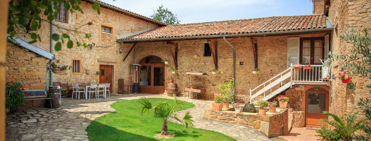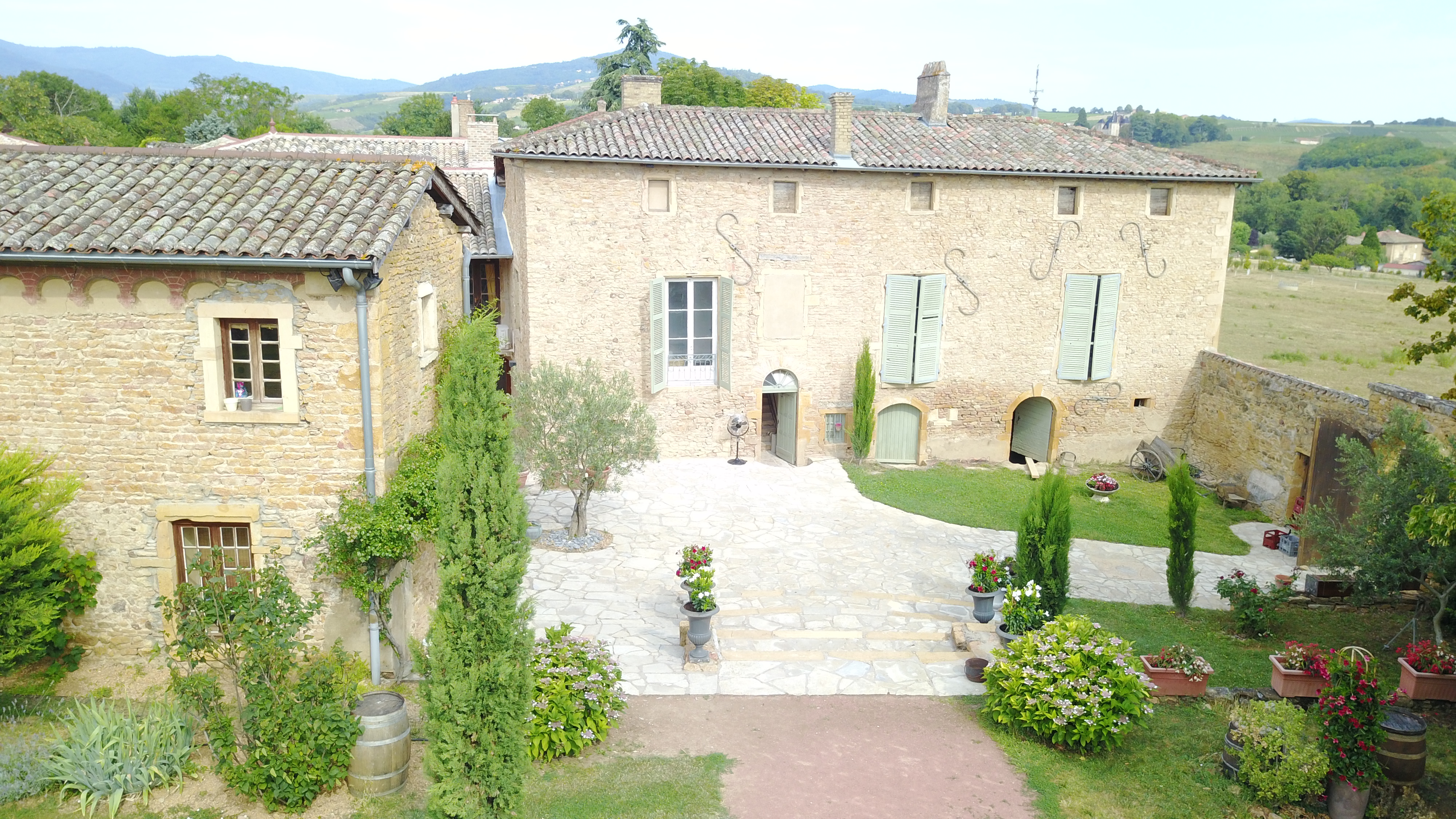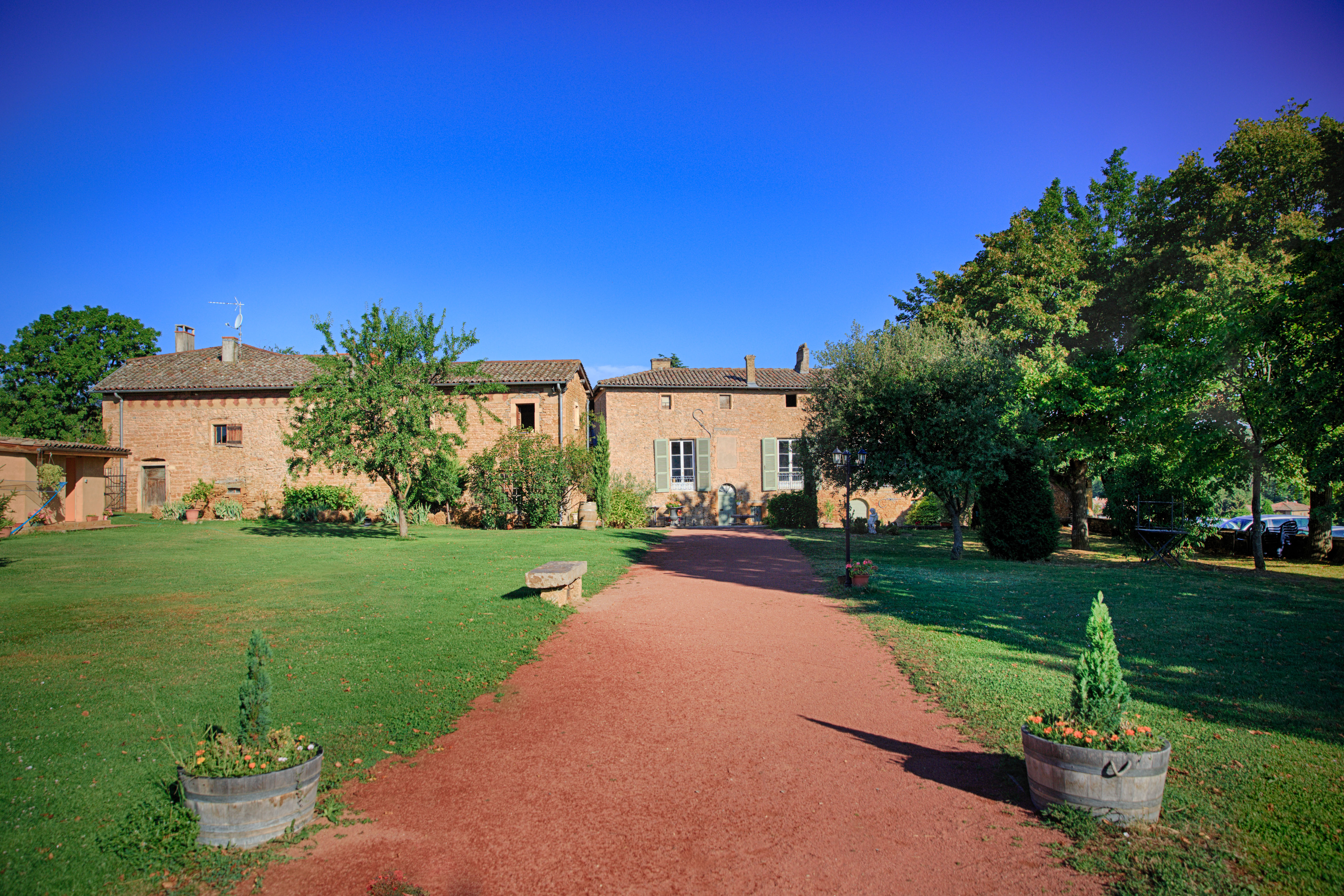 Les extérieurs sont également très appréciés avec une terrasse ombragée sous les tilleuls et marronniers, un grand espace enherbé, une cour intérieure en pierres dorées et les vignes qui sont devant le domaine…